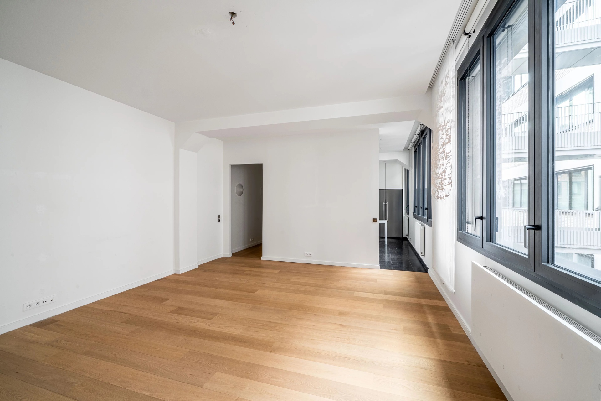 The light-filled living room features double-glazed aluminum windows, guaranteeing thermal and acoustic comfort while enhancing natural light.