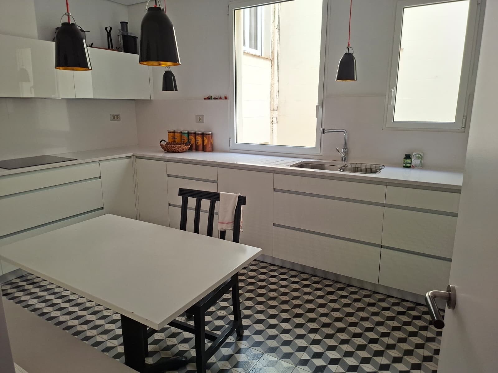 The contemporary designer kitchen showcases striking hydraulic tile flooring and premium appliances, complemented by a separate laundry room and wine/storage space.