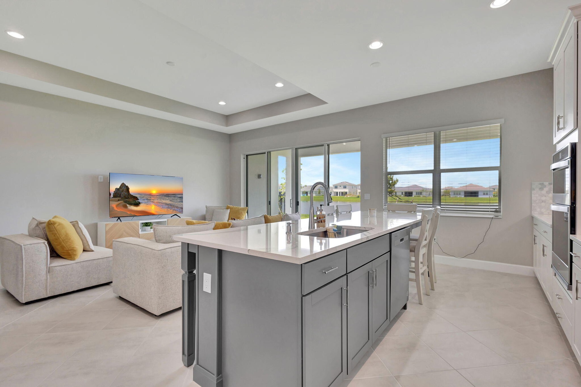 Discover an Active Vibrant lifestyle in this Furnished 1 Story Home at Westlake. Enjoy 4 bedrooms, 2.5 bath. Beautifully appointed Gourmet Kitchen featuring Gas Cooktop, Stainless Steel Appliances, Deco Stone Counters, & extended Family dine Island. The Open Concept from Kitchen to Family Room is spacious with 10Ft Ceilings and Large Sliding Glass doors opening to the Covered Patio & un-obstructed Lake Views. The Primary Bedroom features , Coffered Ceilings, 2 Walk In Closets, a Spa-Like bathroom with dual sink vanity, wood cabinetry & Stone Countertops, extended walk in Glass Enclosed Shower & Separate water closet. There are 2 additional rooms & Full bath, plus guest Half bath & Den/Flex Room. The Flex space can be used as a Sitting room, Office/Den, or additional Family Room Space. Westlake offers am AquaPark for residents featuring a Lagoon Style Pool with Beach Entry area, Slide, Kids Splash Zone, Pavillions, Picnic and Dining area and Fitness spaces.