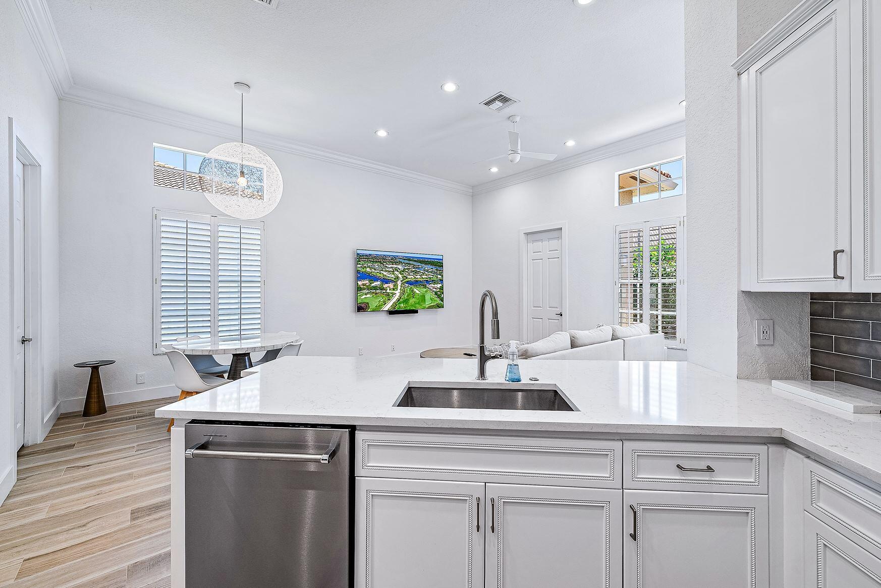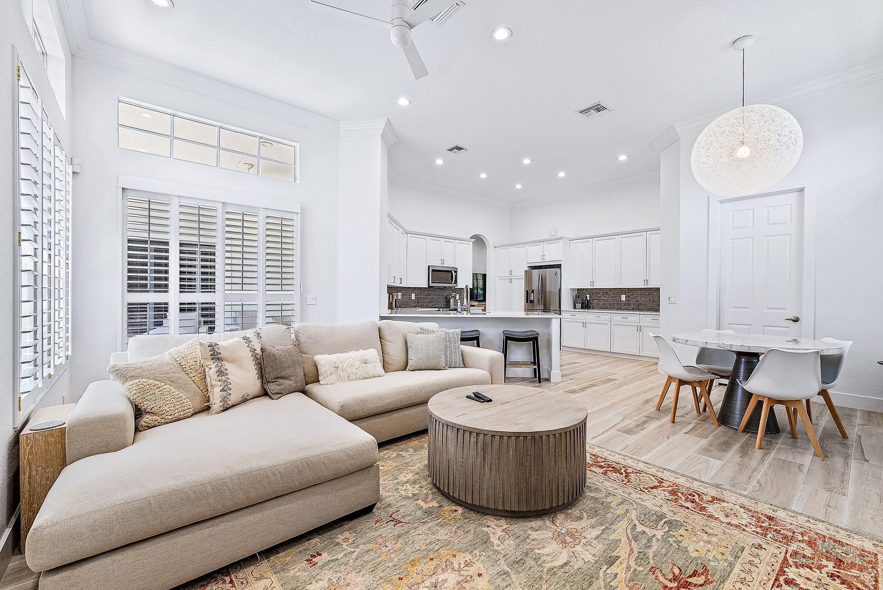 BEAUTIFULLY UPDATED AND FURNISHED TWO STORY HOME WITH THE MASTER SUITE ON THE GROUND FLOOR. SPACIOUS OPEN KITCHEN WITH BREAKFAST AREA AND LARGE FAMILY ROOM WHICH OPENS TO THE EXPANDED COVERED LANAI AND INVITING FENCED YARD WITH PRIVACY HEDGES. CABANA BATH WITH SHOWER. BEAUTIFUL LIVING ROOM AND DINING AREA OFF THE KITCHEN PERFECT FOR DINNER PARTIES. FIRST FLOOR GUEST SUITE OR GREAT HOME OFFICE WITH 2 ADDITIONAL GUEST SUITES UPSTAIRS. LUXURIOUS MASTER SUITE WITH DUAL CLOSETS AND SPACIOUS SPA LIKE BATHROOM. FULL LAUNDRY AND AN EXPANSIVE GARAGE AND DRIVEWAY. WONDERFUL CORNER LOCATION WITH NO HOMES ACROSS AND A HUGE GREEN SPACE. COMMUNITY HAS TENNIS AND POOL ALL MINUTES TO ABACOA AND ALTON PLUS THE BEACH.