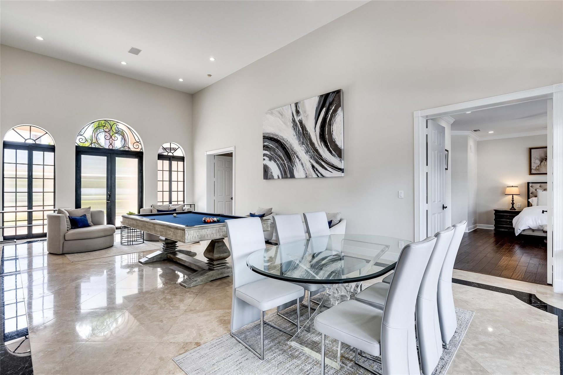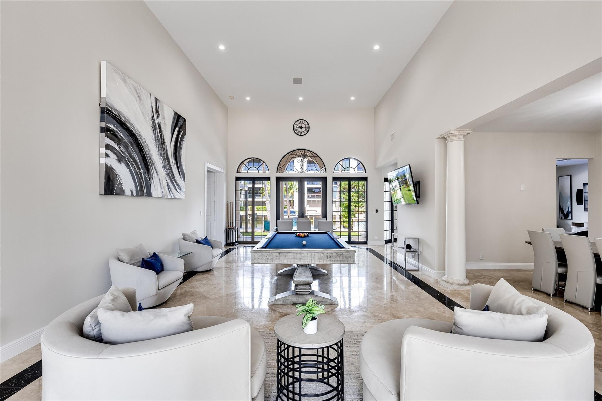 Waterfront Gated Estate in heart of the Las Olas Isles. Elegant Mediterranean-Contemporary that features exceptional Great Room with volume ceilings. Abundance of natural light. Great layout with 3+1 beds on first floor and 3 beds on 2nd floor. Marble and wood floors, granite countertops, chef's kitchen with Sub-Zero fridge and Wolf gas range open to family room. Primary Suite on 1st floor with 2 walk-in closets and spa-like bathroom. Large Guest/In-Law Suite with sitting room. Stunning heated salt water pool w/ new summer kitchen is ideal for entertaining. 90 ft dock w/ ocean access and no fixed bridges. Equipped with gas generator. 2 car garage. Freshly painted inside and out. Walking distance to beach and Las Olas Blvd. Perfect for private waterfront enclave or a luxury vacation rental!