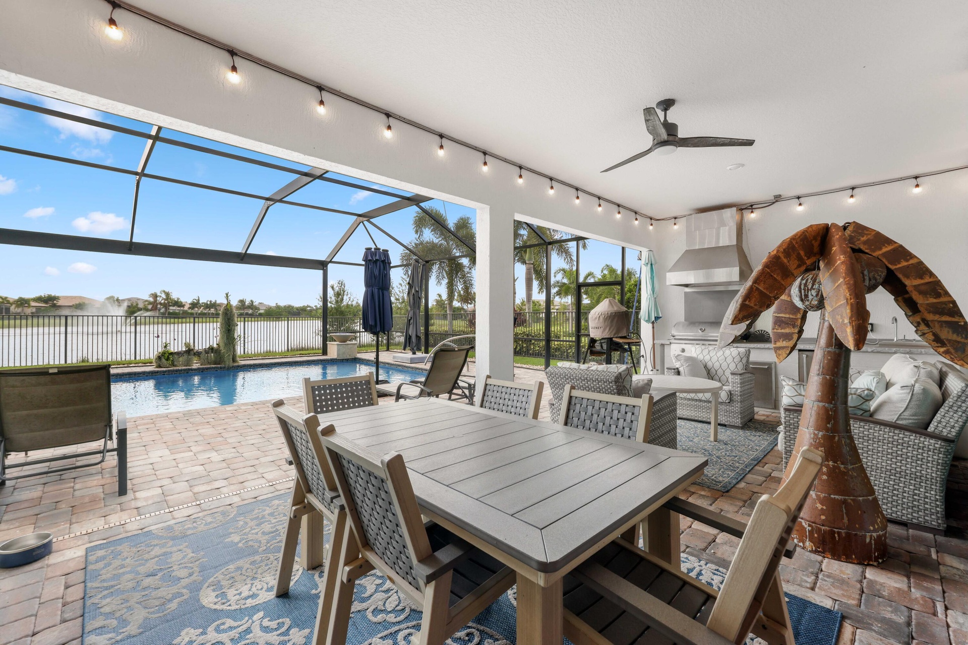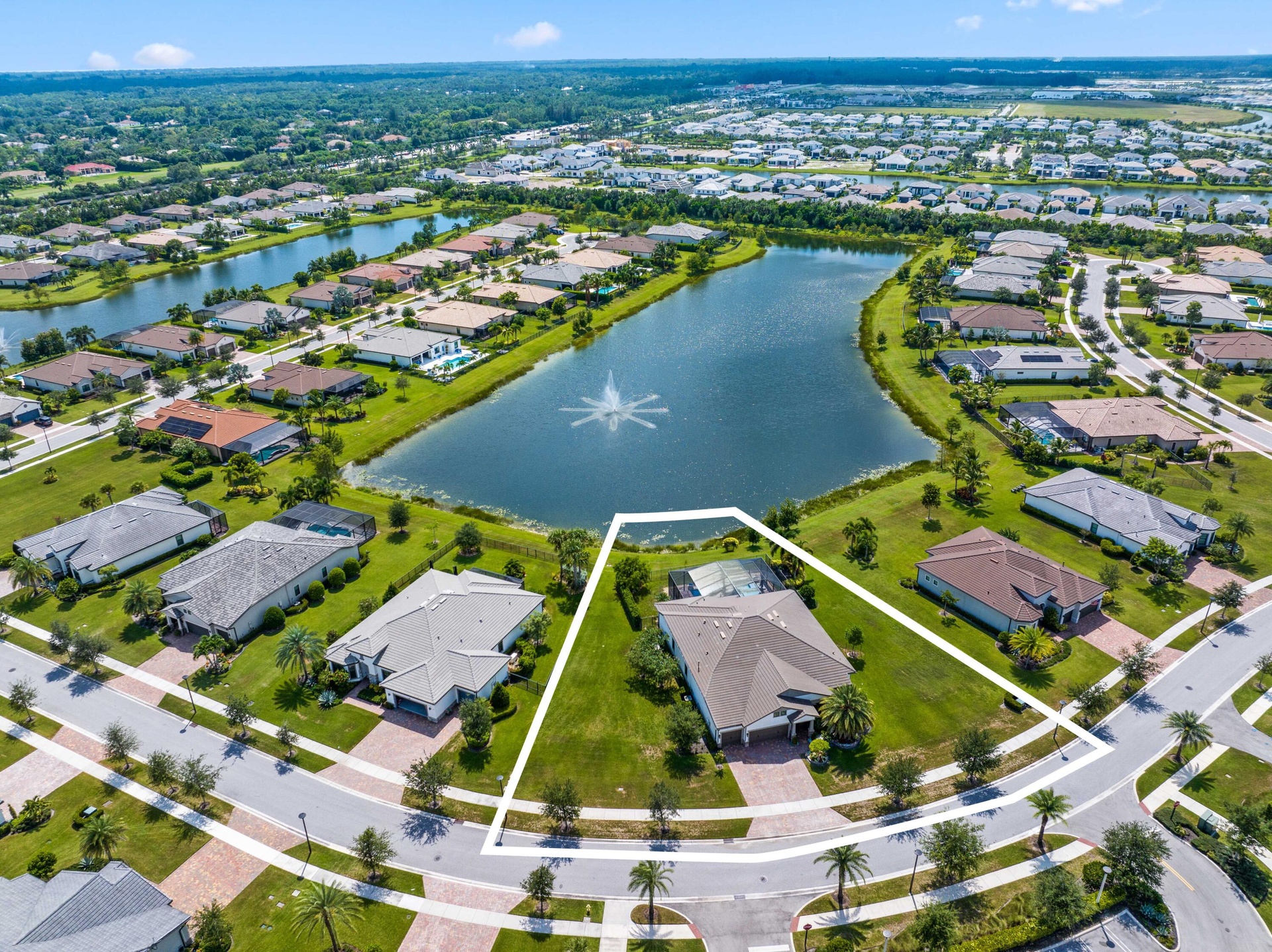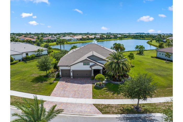 On one of the largest lots in Ancient Tree, this half-acre lakefront home offers wide fountain views and a backyard built for enjoyment. The saltwater heated pool, 6 1/2 feet deep, with fire bowls, hot tub, and panoramic screen enclosure, creates the perfect outdoor retreat. Entertain with ease on the patio featuring a summer kitchen with grill, fridge, ice machine, and trash. Inside, the custom kitchen includes 42'' upper cabinets, upgraded quartz, built-in pet bowls, and premium appliances: Fulgor range with gas burners and double electric ovens, wall oven, microwave, and pot filler. The open great room has coffered ceilings, while the primary suite offers generous closet space. Natural gas serves the dryer, water heater, grill, and burners. Oversized 3-car garage plus golf cart space. Golfers will love being next to Sandhill Crane Golf Club or The Nest, with options for a round on the championship course, the ideal place to practice your short game, or a fun time at the two-story driving range. Enjoy drinks or a meal too. There are new dining and shopping options coming soon for ultimate convenience, including a new Publix. Northlake Boulevard improvements make commuting and errands easy. This property combines outstanding upgrades, a prime location, and a lifestyle that's hard to match in Palm Beach Gardens.