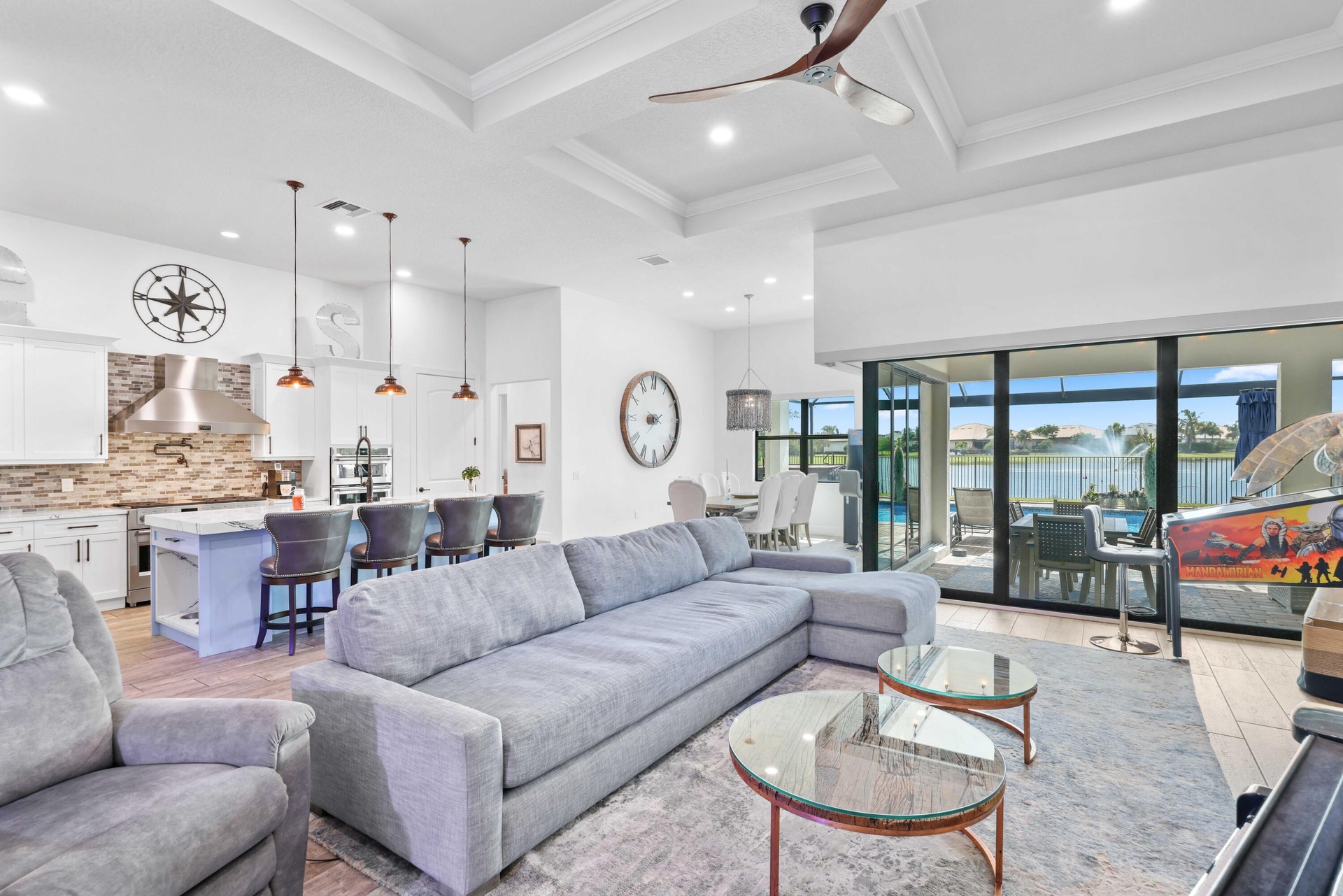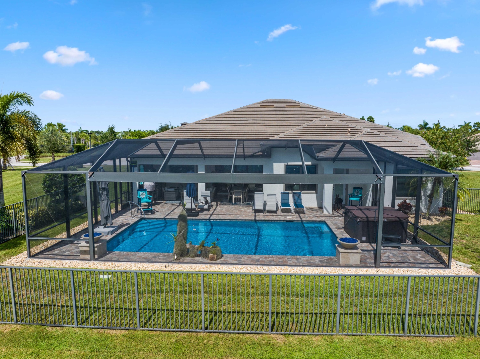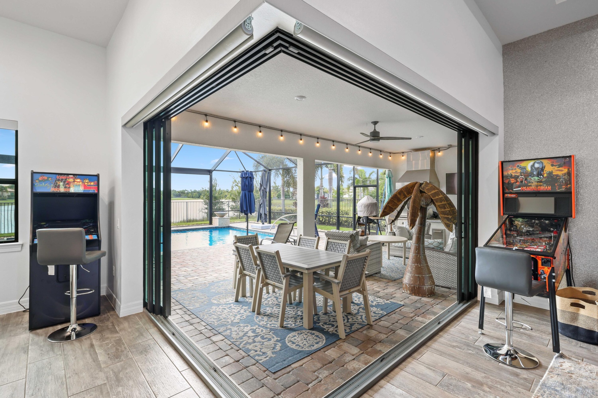 On one of the largest lots in Ancient Tree, this half-acre lakefront home offers wide fountain views and a backyard built for enjoyment. The saltwater heated pool, 6 1/2 feet deep, with fire bowls, hot tub, and panoramic screen enclosure, creates the perfect outdoor retreat. Entertain with ease on the patio featuring a summer kitchen with grill, fridge, ice machine, and trash. Inside, the custom kitchen includes 42'' upper cabinets, upgraded quartz, built-in pet bowls, and premium appliances: Fulgor range with gas burners and double electric ovens, wall oven, microwave, and pot filler. The open great room has coffered ceilings, while the primary suite offers generous closet space. Natural gas serves the dryer, water heater, grill, and burners. Oversized 3-car garage plus golf cart space. Golfers will love being next to Sandhill Crane Golf Club or The Nest, with options for a round on the championship course, the ideal place to practice your short game, or a fun time at the two-story driving range. Enjoy drinks or a meal too. There are new dining and shopping options coming soon for ultimate convenience, including a new Publix. Northlake Boulevard improvements make commuting and errands easy. This property combines outstanding upgrades, a prime location, and a lifestyle that's hard to match in Palm Beach Gardens.