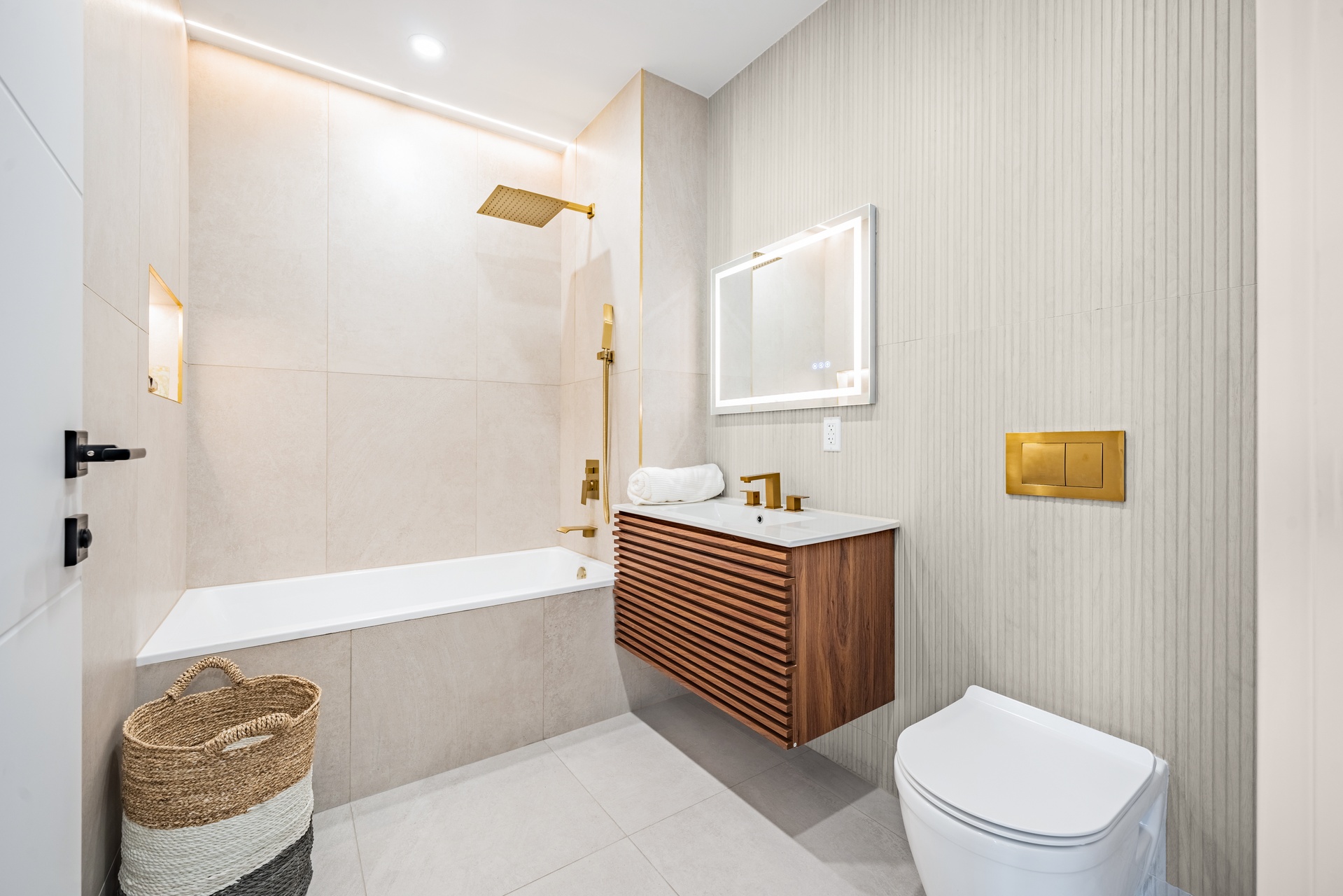 The primary bedroom is a serene retreat, offering ample space and an inviting ambiance created by soft natural light and elegant design. It’s the perfect setting to unwind, offering comfort and tranquility in every detail. The bathrooms at CORA are designed to offer a luxurious, spa-like experience. The primary ensuite bath features elegant herringbone tile, a sleek floating vanity, and a rain shower, creating a serene retreat. The second bathroom continues this refined aesthetic with neutral tiles and warm wood accents, maintaining a calm, sophisticated atmosphere. Both bathrooms combine timeless design and high-end finishes to provide a perfect blend of comfort and style.