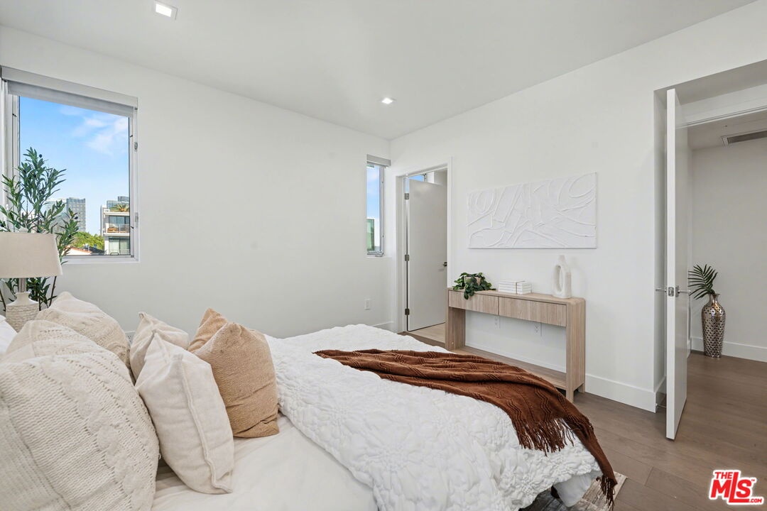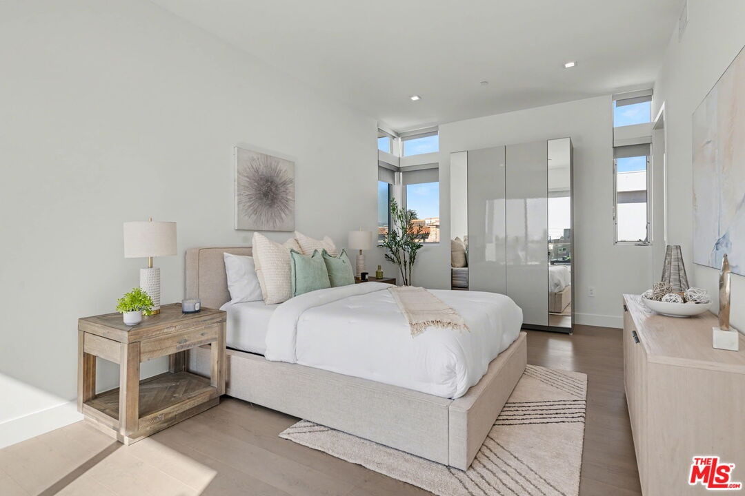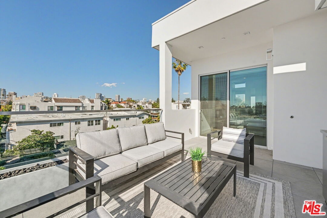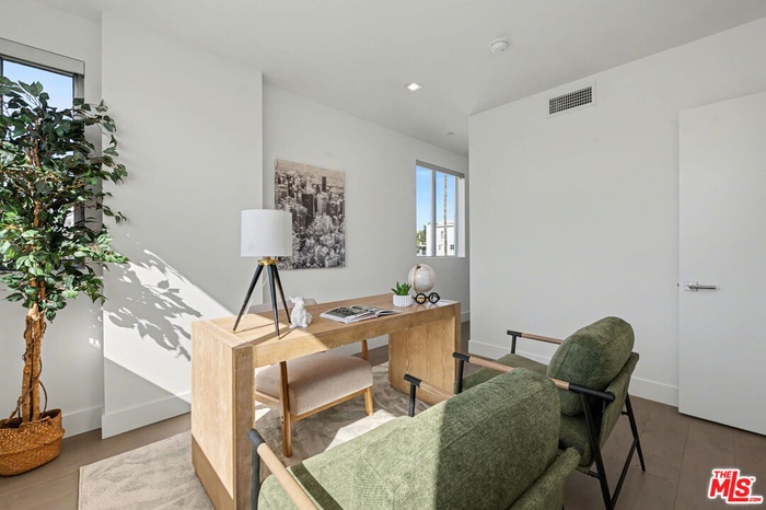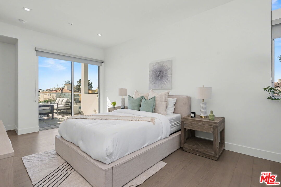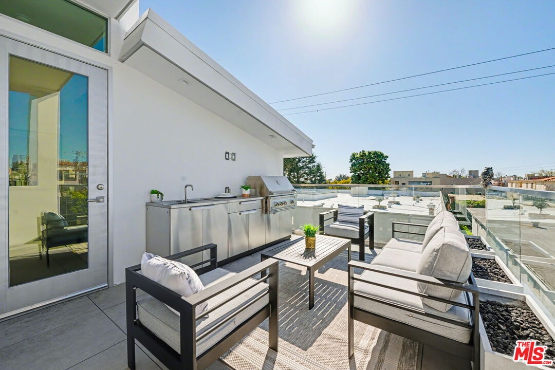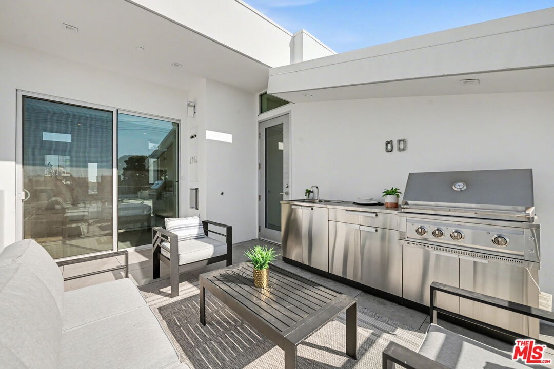 Experience elevated modern living in this newly constructed 2022 Contemporary 3 Bed/3.5 Bath + Bonus Room residence, ideally situated in an exclusive four-home single-lot subdivision. Designed with modern style and functionality, this property offers a sophisticated lifestyle in one of the Westside's most desirable locations. Upon entry, you're welcomed into a versatile bonus room (perfect for a home office, gym, or guest retreat), featuring sleek tile flooring and sliding doors that open to a private, gated patio with built-in planters. Contemporary tiled flooring flows throughout the first and second levels, complemented by clean-design steel stair-railings and abundant natural light. The main living area showcases an open-concept offers seamless indoor-outdoor living with a sliding glass door leading to a sleek glass-enclosed balcony off the living and dining areas, stunning chef's kitchen with a dramatic quartz backsplash, contemporary cabinetry, breakfast bar seating, and stainless-steel appliances, including a 5-burner gas range with griddle, microwave, oven, and hood. LED recessed lighting, dual-pane windows, and designer window shades enhance the home's refined finishes. A stylish powder room with custom sink and backlit mirror, along with a thoughtfully designed entry closet with built-in shelving. Two spacious bedrooms on the 3rd level feature wide-plank light oak hardwood floors, custom closets, and beautifully finished ensuite bathrooms with a floating vanity and tiled shower, the other with a luxurious rain showerhead. A dedicated laundry area with storage and a linen closet in hallway. The top-level primary suite is a private sanctuary boasting high ceilings, breathtaking Century City views, and treetop vistas. Enjoy a walk-in closet, built-in cabinetry with beverage refrigerator, and direct access to an expansive tiled rooftop balcony with sunset views. The rooftop retreat is designed for entertaining with a full outdoor kitchen, including barbecue and sink. The spa-inspired primary bath features a floating vanity, backlit mirror, and a curb-less tiled shower. Additional highlights include all bedrooms with ensuite baths and custom closets, multi-zone AC and heat, wired alarm system, diirect-access 2-car garage with storage and auto glass garage door. Low HOA dues of $29.42/month. Located moments from Westfield Century City, UCLA and Beverly Hills. Westwood Charter Elementary School. Move-in ready Contemporary California living!