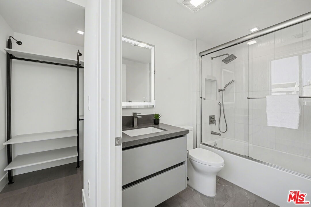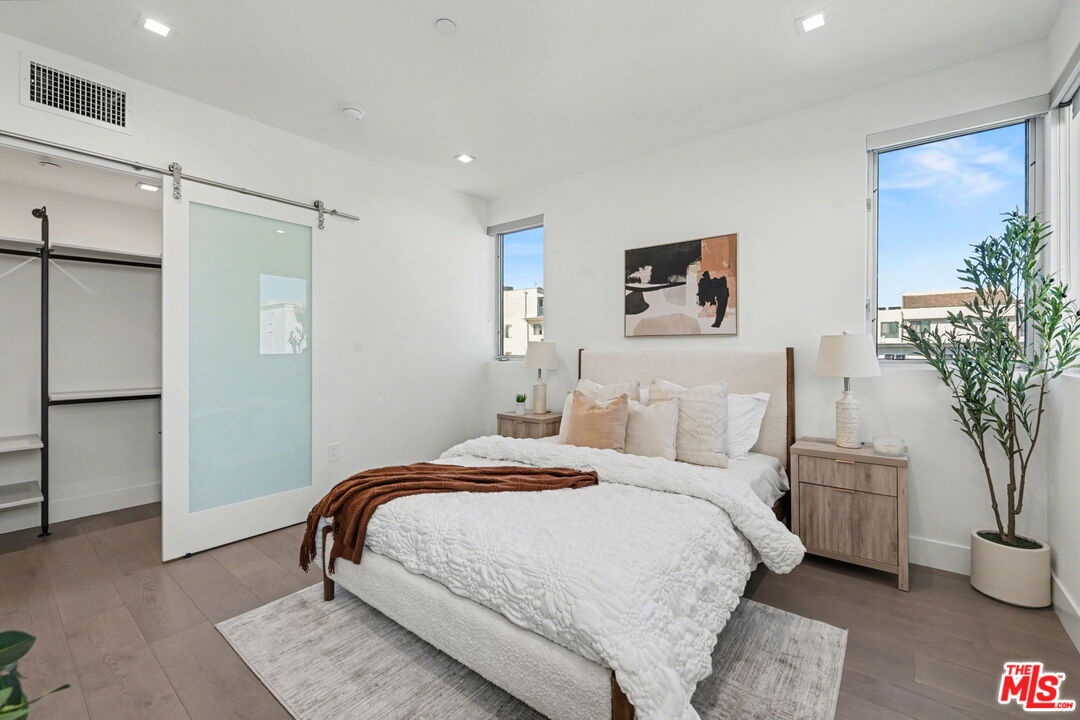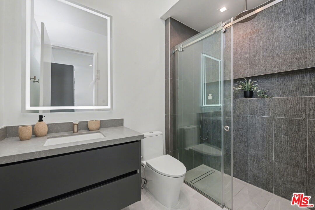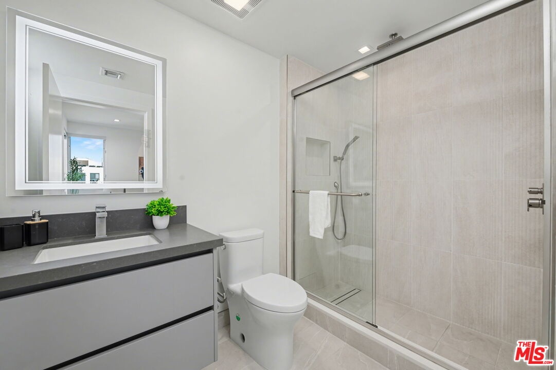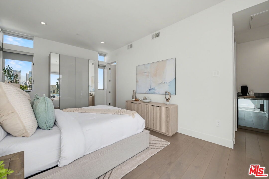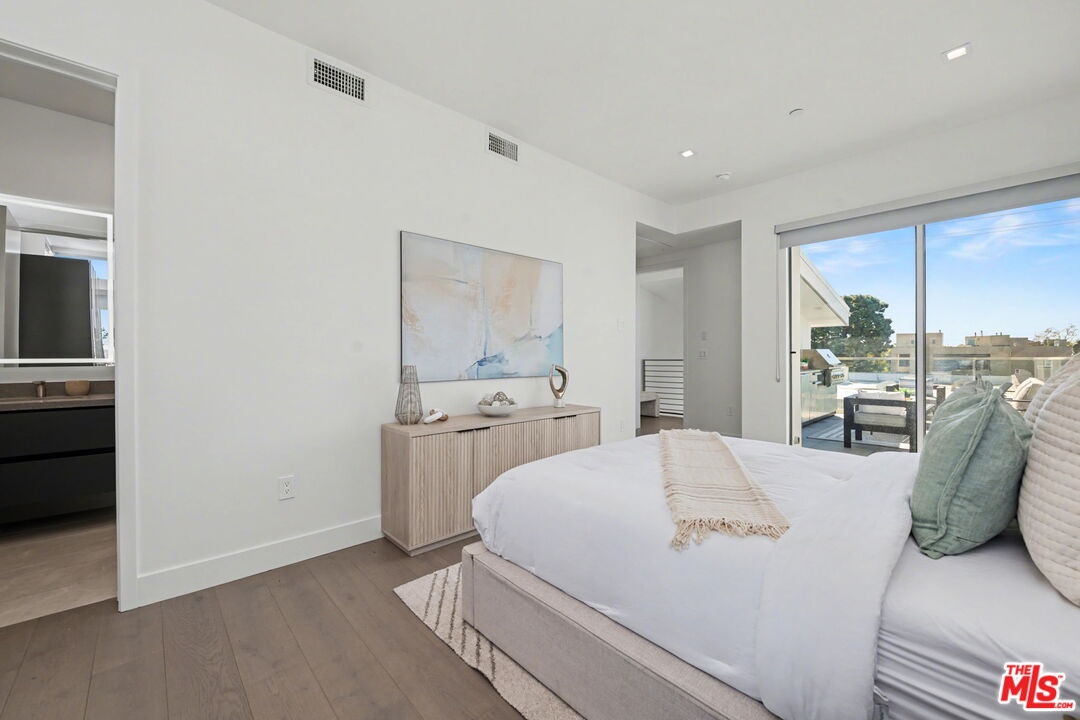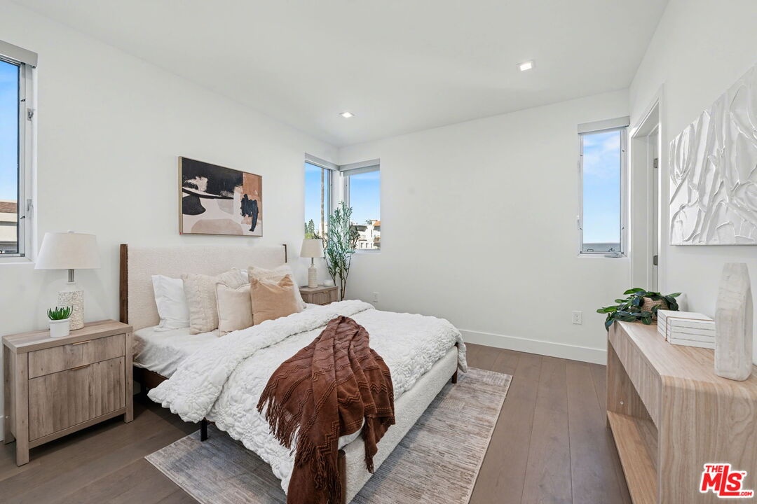 Experience elevated modern living in this newly constructed 2022 Contemporary 3 Bed/3.5 Bath + Bonus Room residence, ideally situated in an exclusive four-home single-lot subdivision. Designed with modern style and functionality, this property offers a sophisticated lifestyle in one of the Westside's most desirable locations. Upon entry, you're welcomed into a versatile bonus room (perfect for a home office, gym, or guest retreat), featuring sleek tile flooring and sliding doors that open to a private, gated patio with built-in planters. Contemporary tiled flooring flows throughout the first and second levels, complemented by clean-design steel stair-railings and abundant natural light. The main living area showcases an open-concept offers seamless indoor-outdoor living with a sliding glass door leading to a sleek glass-enclosed balcony off the living and dining areas, stunning chef's kitchen with a dramatic quartz backsplash, contemporary cabinetry, breakfast bar seating, and stainless-steel appliances, including a 5-burner gas range with griddle, microwave, oven, and hood. LED recessed lighting, dual-pane windows, and designer window shades enhance the home's refined finishes. A stylish powder room with custom sink and backlit mirror, along with a thoughtfully designed entry closet with built-in shelving. Two spacious bedrooms on the 3rd level feature wide-plank light oak hardwood floors, custom closets, and beautifully finished ensuite bathrooms with a floating vanity and tiled shower, the other with a luxurious rain showerhead. A dedicated laundry area with storage and a linen closet in hallway. The top-level primary suite is a private sanctuary boasting high ceilings, breathtaking Century City views, and treetop vistas. Enjoy a walk-in closet, built-in cabinetry with beverage refrigerator, and direct access to an expansive tiled rooftop balcony with sunset views. The rooftop retreat is designed for entertaining with a full outdoor kitchen, including barbecue and sink. The spa-inspired primary bath features a floating vanity, backlit mirror, and a curb-less tiled shower. Additional highlights include all bedrooms with ensuite baths and custom closets, multi-zone AC and heat, wired alarm system, diirect-access 2-car garage with storage and auto glass garage door. Low HOA dues of $29.42/month. Located moments from Westfield Century City, UCLA and Beverly Hills. Westwood Charter Elementary School. Move-in ready Contemporary California living!