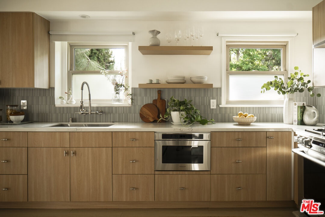 Welcome home to this Mar Vista Estate. Set high above the street on an unusually generous 9,286-square-foot lot, this fully renovated Mid-Century residence offers a rare trifecta of architectural character, modern luxury, and endless future possibilities. Every detail has been thoughtfully curated to honor the home's iconic roots while embracing a sophisticated, contemporary lifestyle.The interior unfolds into a bright, open floor plan where clean lines and classic details take center stage. A signature sunken living area draws the eye toward a dramatic picture window, creating a seamless connection between the chic indoors and the sweeping city and mountain outlooks. The social heart of the home flows into a gourmet kitchen and dining space, outfitted with high-end appliances, quartz countertops, custom modern cabinetry, a dedicated pantry, and designer tile accents that add a touch of warmth and texture.Three well-appointed bedrooms provide flexible comfort for any lifestyle. The primary suite is a serene sanctuary, offering expansive views and direct access to a refreshed, contemporary bathroom. The third bedroom, a standout space featuring soaring wood-beamed ceilings and sliding glass doors, opens directly to the gardens, making it the perfect home office, creative studio, or nursery.The massive backyard truly sets this property apart from anything else on the Westside. Featuring an oversized backyard, lush open lawn, and a private hillside backdrop, it serves as the ultimate setting for alfresco dinner parties or quiet relaxation. This expansive lot offers unrivaled privacy and the potential to add a substantial ADU or expand the existing footprint, all while maintaining your own private outdoor park.Situated in the hills near the highly regarded Mar Vista Elementary School, you are just moments away from local markets, parks, and the vibrant Westside culture. This is a rare opportunity to own a compelling blend of style, significant land, and prestige on one of Mar Vista's most sought-after streets.