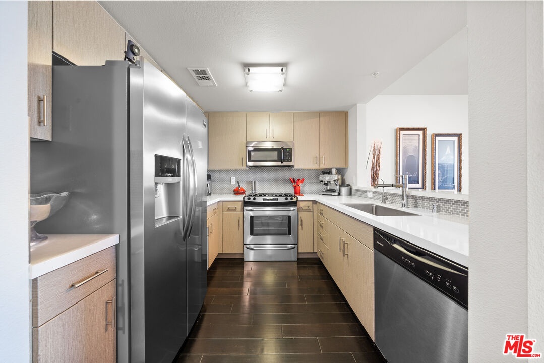 Penthouse 7 sits at the very top of The Element Building and offers a bright, modern 3-bedroom, 2-bath layout with amazing city views, including the DTLA and Koreatown skyline. The open floor plan feels airy and comfortable, with wide-plank hardwood floors, recessed lighting, and lots of windows that bring in natural light throughout the day. The kitchen is clean and contemporary, featuring polished quartz countertops, modern cabinetry, and stainless steel appliancesincluding a refrigerator, range, and dishwasher. The spacious primary bedroom opens to the balcony and includes a walk-in closet and a private en-suite bath. The second bedroom is well-sized and offers great privacy. The third can be used as an additional room for guests or an office for those that work from home. A separate laundry room with a full-size washer and dryer adds everyday convenience. This penthouse comes with two side-by-side parking spaces and bicycle storage in a gated garage. Residents also enjoy access to a full fitness center with boxing and yoga areas, a landscaped courtyard with lounge seating, a community BBQ, and a pet-friendly dog walk. Located in the heart of Koreatown, The Element puts you close to some of LA's best restaurants, cafes, and nightlifefrom popular Korean BBQ spots to cocktail lounges and local coffee shops. With quick access to DTLA, Larchmont Village, and the Metro, this penthouse offers a great mix of comfort, style, and vibrant city living.