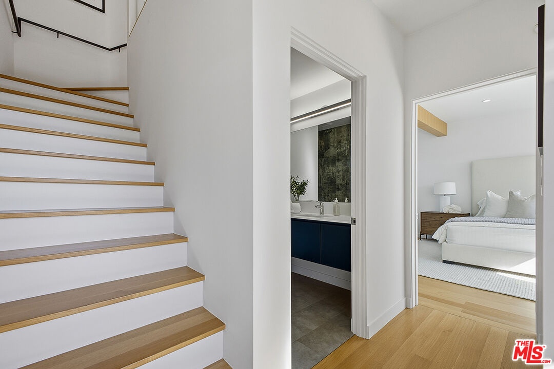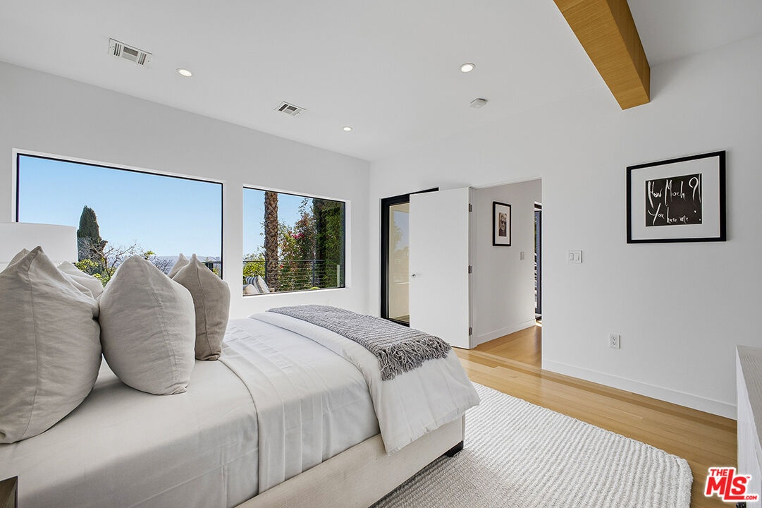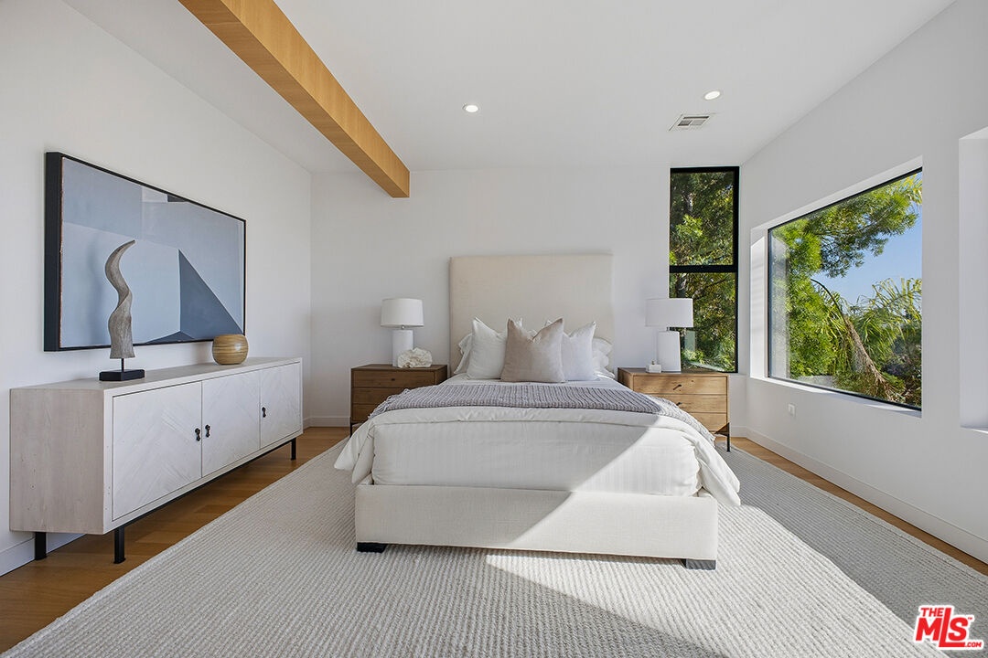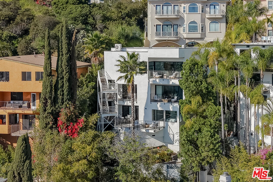 Commanding panoramic views from its coveted Hollywood Hills setting, this striking contemporary residence delivers elevated design and effortless indoor-outdoor living. Walls of glass invite an abundance of natural light, while multiple decks create seamless transitions from refined interiors to sweeping city vistas. The open-concept main level is designed for both everyday living and sophisticated entertaining, anchored by sleek Caesarstone flooring and a chef-caliber kitchen appointed with premium Miele appliances, Italian cabinetry, Hansgrohe fixtures, and sculptural Artemide lighting. Every finish reflects a commitment to modern luxury and thoughtful craftsmanship. The primary suite serves as a private retreat, with a generous walk-in closet and spa-inspired bath featuring a deep-soaking Corian tub and separate rainfall shower. Three additional bedrooms offer substantial scale, warm white oak floors, custom built-ins, and a dedicated laundry room. An integrated smart home system enhances comfort and security, including surveillance cameras, Nest climate control, and EV charger readiness. Privately positioned on a tranquil street, this Hollywood Hills residence pairs contemporary sophistication with the ultimate Southern California lifestyle.