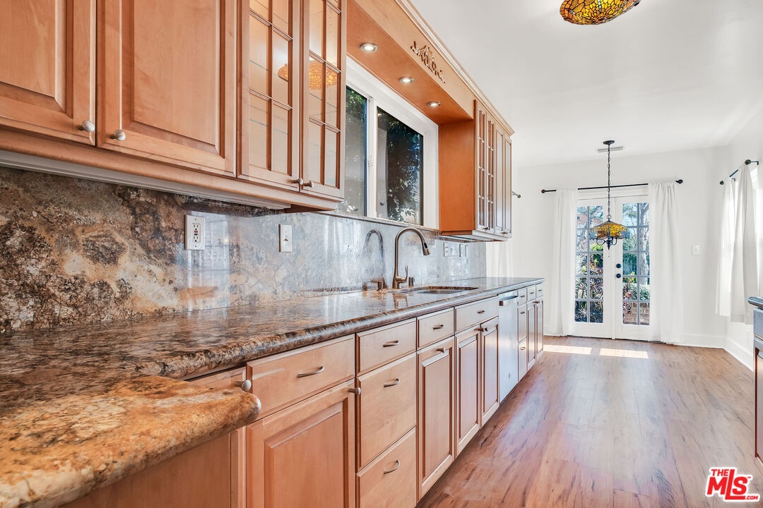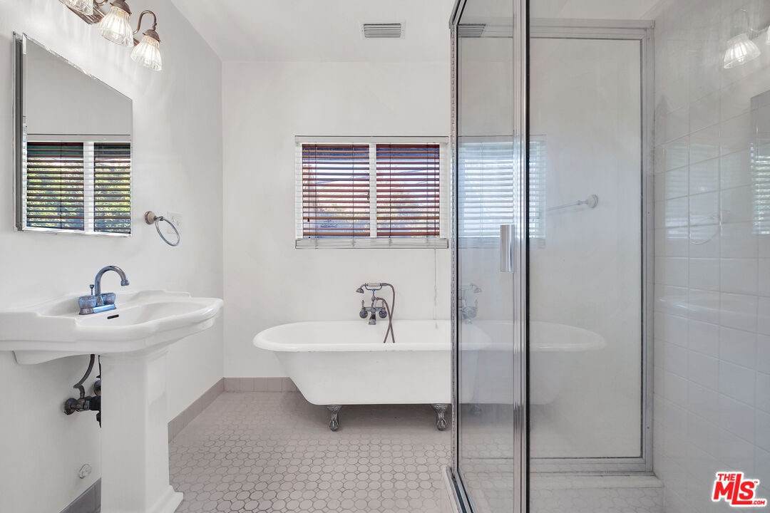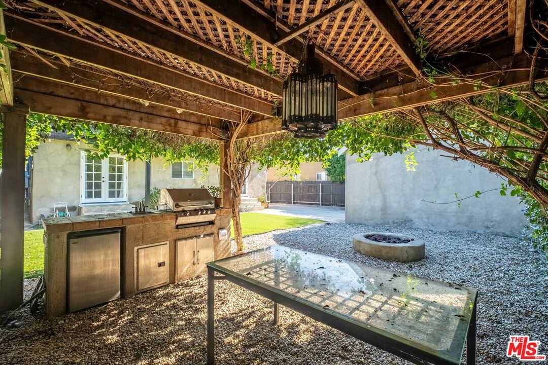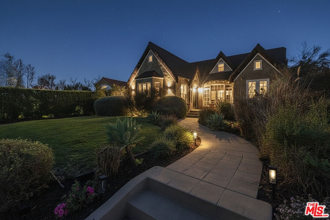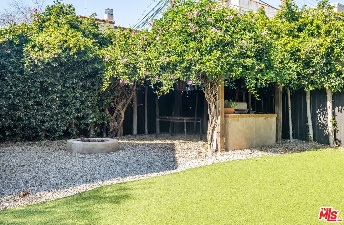 Kind of like a "Spa Day." New look and price for this Sycamore Square storybook charmer!! Bright and airy, 4 bedroom, 3 bath, English Tudor with surprise after surprise! Up the winding pathway from the lushly tree-lined street you enter in to a sun drenched living room with an elegant coved ceiling, leaded glass windows and a wood burning fireplace. The dining room features an enormous mult-paned arched window set in it's own cove and a beautiful Tiffany style ceiling fixture. The updated kitchen includes a cozy, east facing breakfast area with a set of french doors that open out to the herb garden. 3 bedrooms down stairs including 2 that open through french doors directly out to the rear yard and one with it's own, en-suite bath and direct access to the laundry room, perfect as a maids room. Generous and varied options for storage in the hall linen closet and laundry. And speaking of storage, how about a secret wine cellar accessed beneath the remote controlled lifting stairway (!) to the second floor. Upstairs an enormous primary bedroom suite is it's own world and includes a large fitted walk-in closet, areas for an office, TV watching, reading and tons more easily accessible storage options. The sumptuous primary bath features, dual vanity, a sexy oversized spa tub and separate 2-person shower stall with dual rainfall shower heads and shower wand. An enormous 2nd story balcony across the rear is perfect for morning coffee, a little yoga or an end of the day cocktail. Outside a combination of gravel and nicely done artificial turf make for easy maintenance and great place for kids and adults. A natural gas firepit cuts the evening chill and invites conversation while a delightful vine covered pergola with built-in barbeque, sink and mini fridge offers shaded comfort. A detached 2 car garage with high pitched ceiling/roof teases options for any number of alternate uses. Copper plumbing, upgraded electrical with 220-amp service. Sycamore Square is a wonderful neighborhood so named for the classic sycamore trees that line the streets of this pocket of beautiful Miracle Mile homes south of Wilshire. World class museums, performance venues, restaurants and shopping are all within easy walking distance and a new subway station opening at Wilshire and LaBrea, just blocks away, present an auto-free way to engage with our fair city