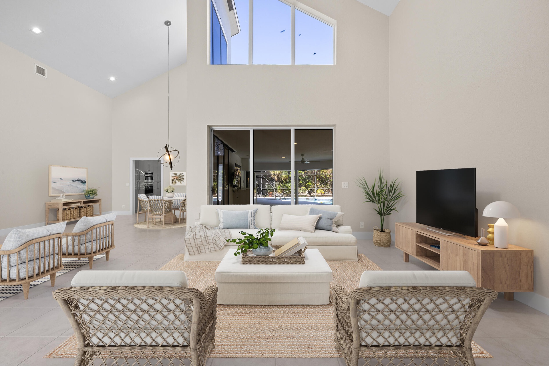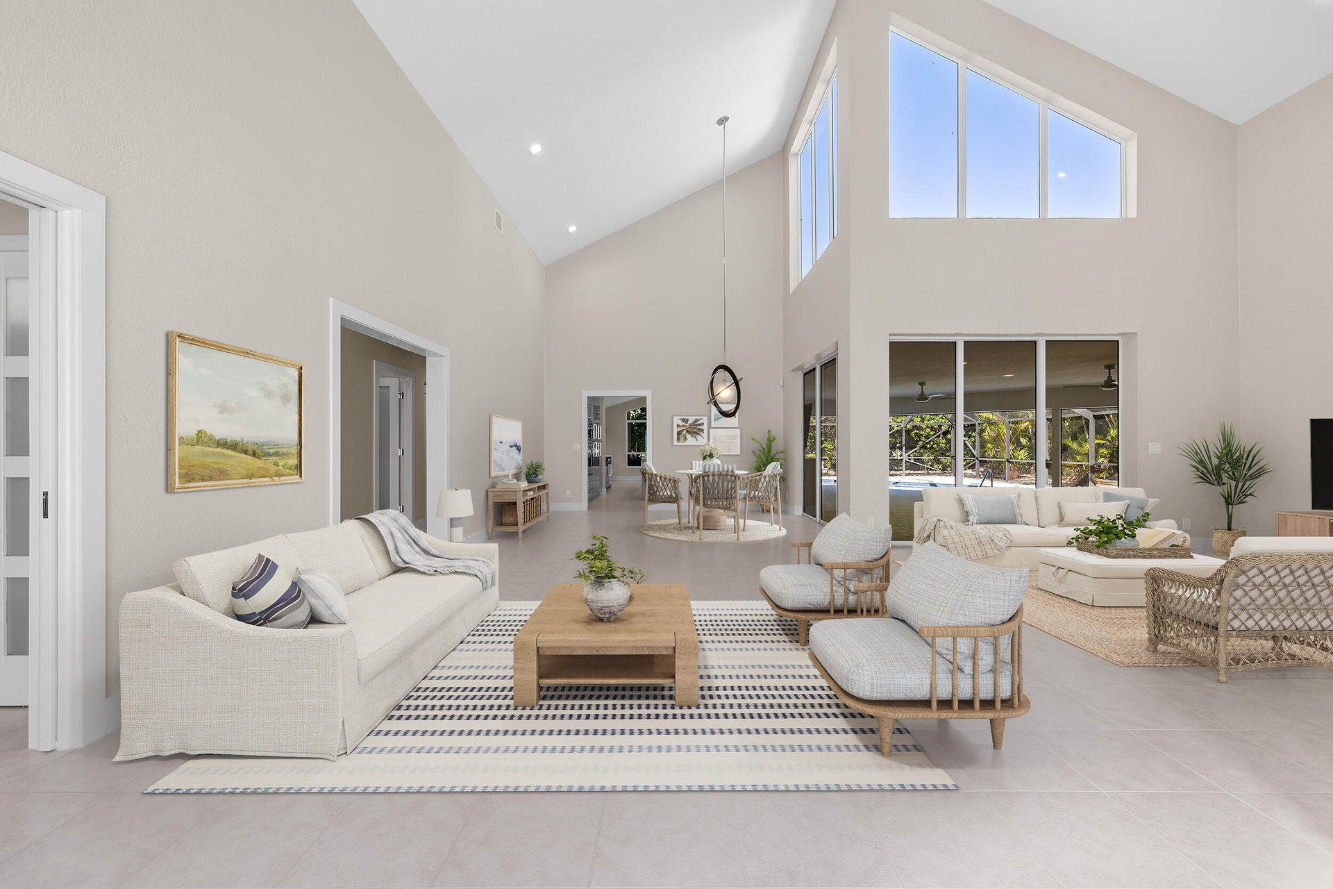 Situated within the gated community of Eastpointe Country Club, this impeccably updated executive residence offers 3,159 square feet of refined living. The home features four bedrooms, including a newly finished media room, along with two full baths and two half baths. A brand-new kitchen with premium appliances anchors the living spaces, complemented by elegant tile and wood flooring. The covered lanai with television and private cabana bath is ideal for entertaining. Complete with hurricane protection, whole-house generator, newer A/C systems, and a two-car plus golf cart garage, this turnkey home offers exceptional club living in Palm Beach Gardens.