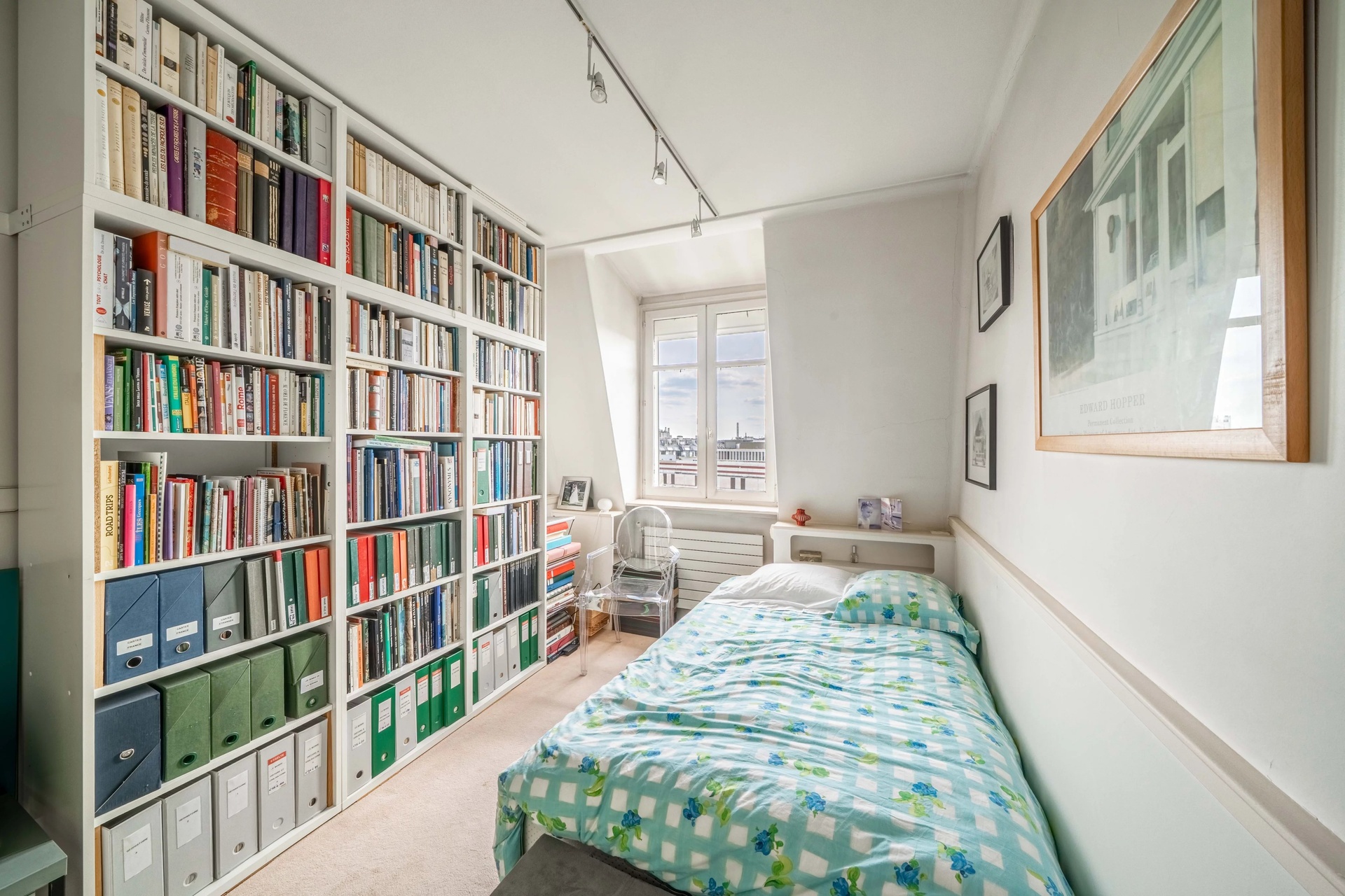The second level features a custom-fitted bedroom with private shower room and separate toilet. This walk-through apartment, recently refurbished by a renowned house, offers a modular layout and an unobstructed view over the rooftops of Paris.