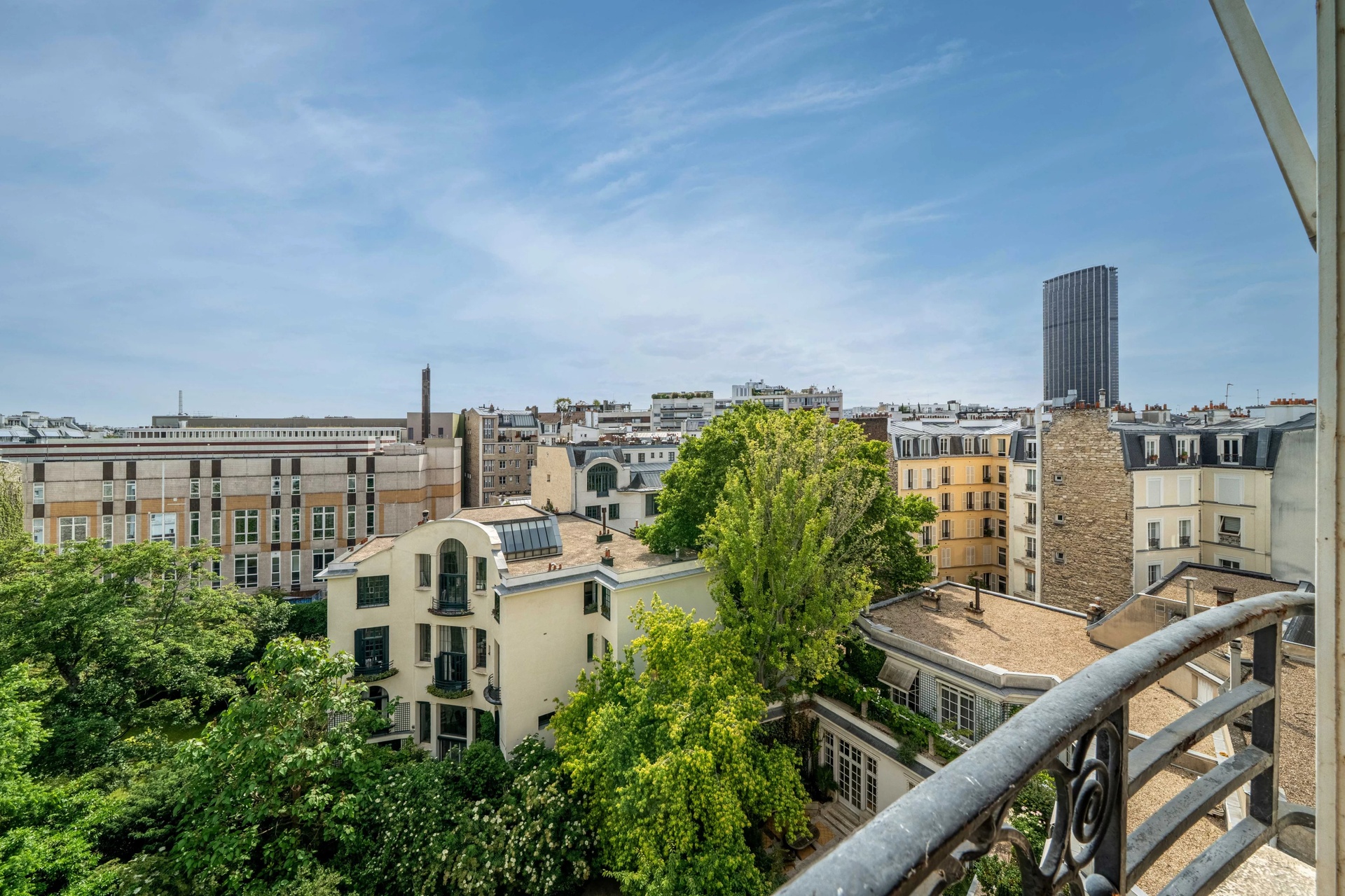 This rare property, located on the 6th and 7th floors with double elevators, comprises: On the first level, an entrance gallery leading to a vast, luminous, south-east-facing living room opening onto a quiet courtyard, an office with a completely unobstructed view over the garden and the rooftops of Paris, a master bedroom suite with its solid mahogany dressing room, its vast bathroom and shower, a second bedroom with its own shower room, a separate, fully fitted and equipped kitchen with its own laundry area.