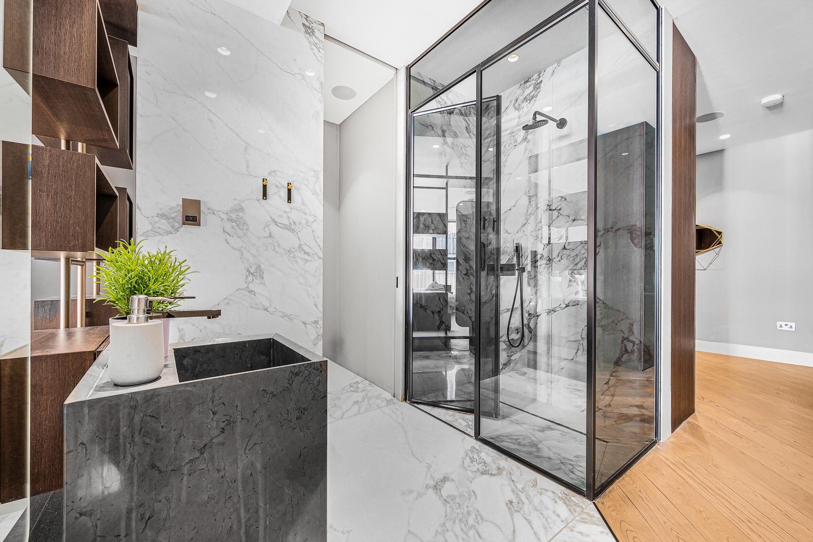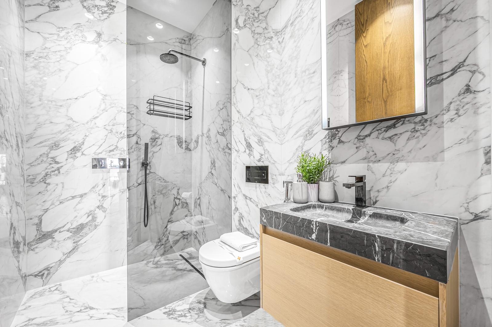 Architecturally designed with marble-effect porcelain tiles and smoked glass detailing: