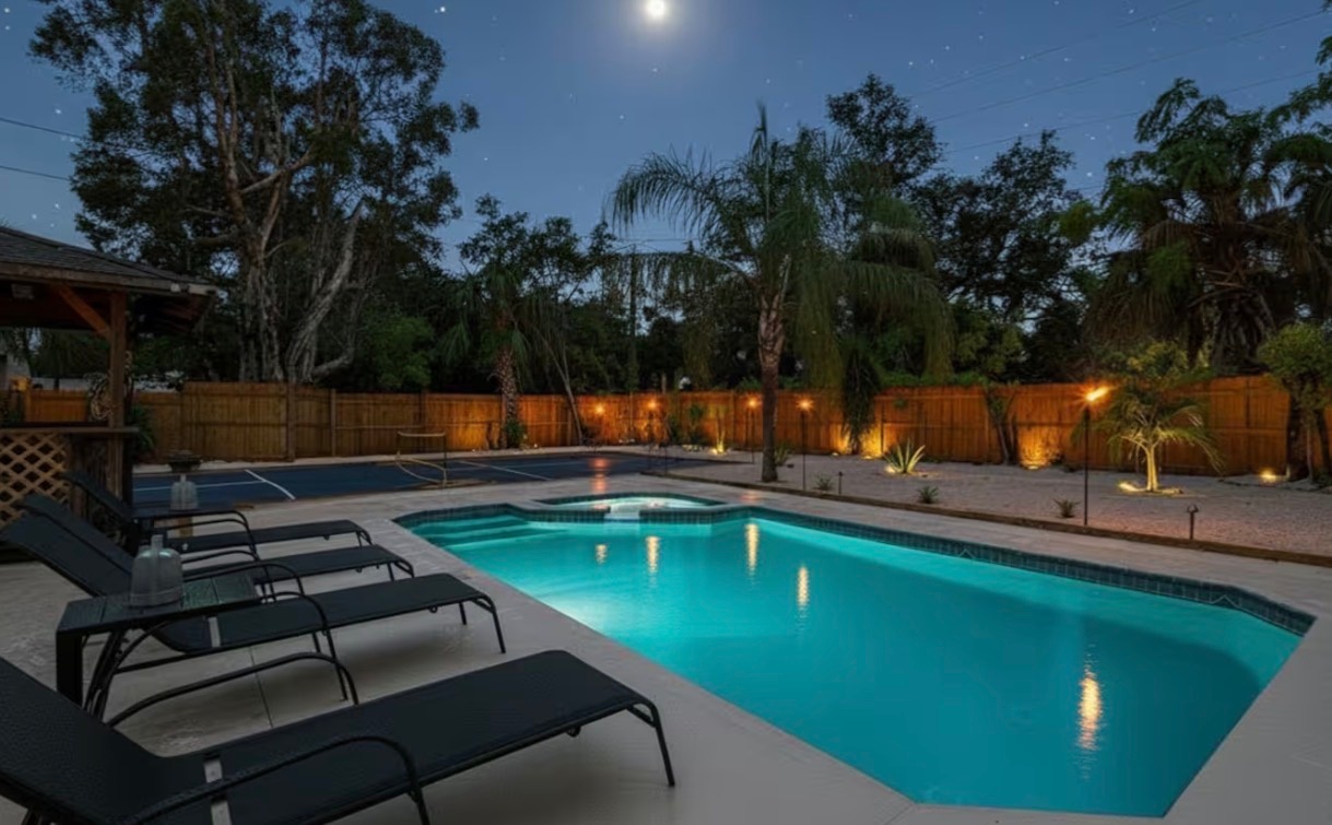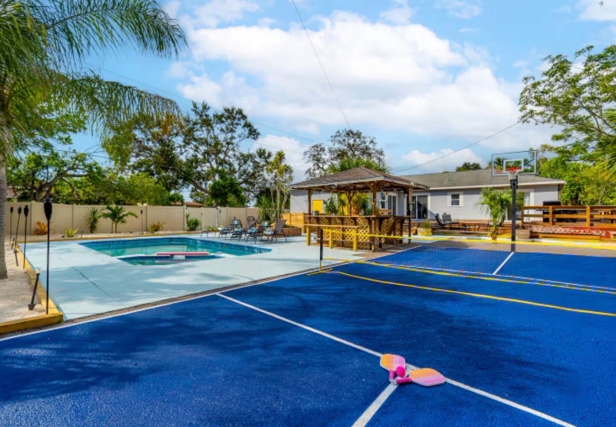 Step outside to experience a private, resort-style backyard that elevates this property above the rest. The home boasts a fully redone designer pool with surrounding lounge areas, private cabanas, and a covered lanai, creating the perfect atmosphere for entertaining or unwinding in complete privacy. Sports enthusiasts will appreciate the dedicated basketball court and paddle ball court, offering endless opportunities for recreation and family fun just steps from the pool.