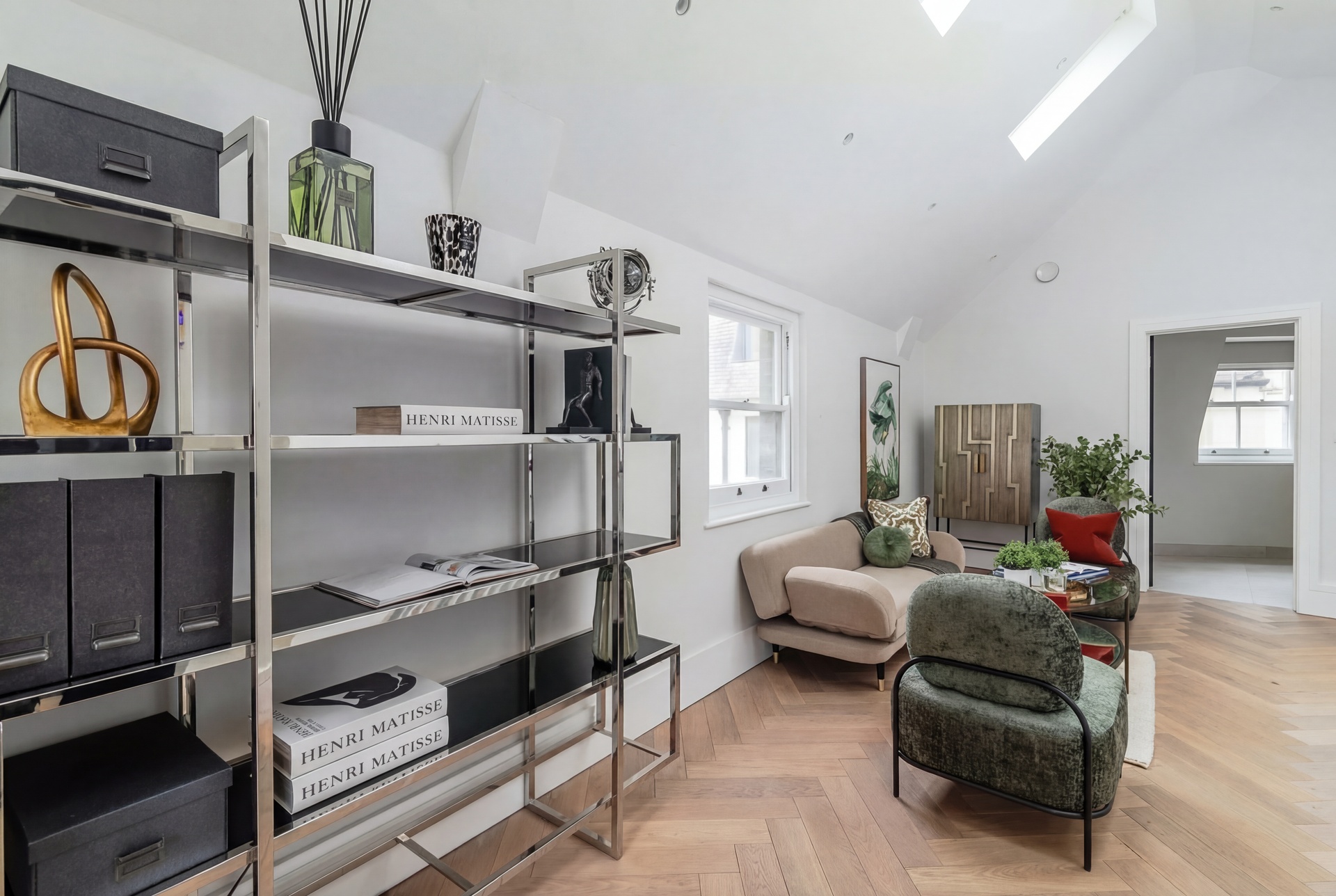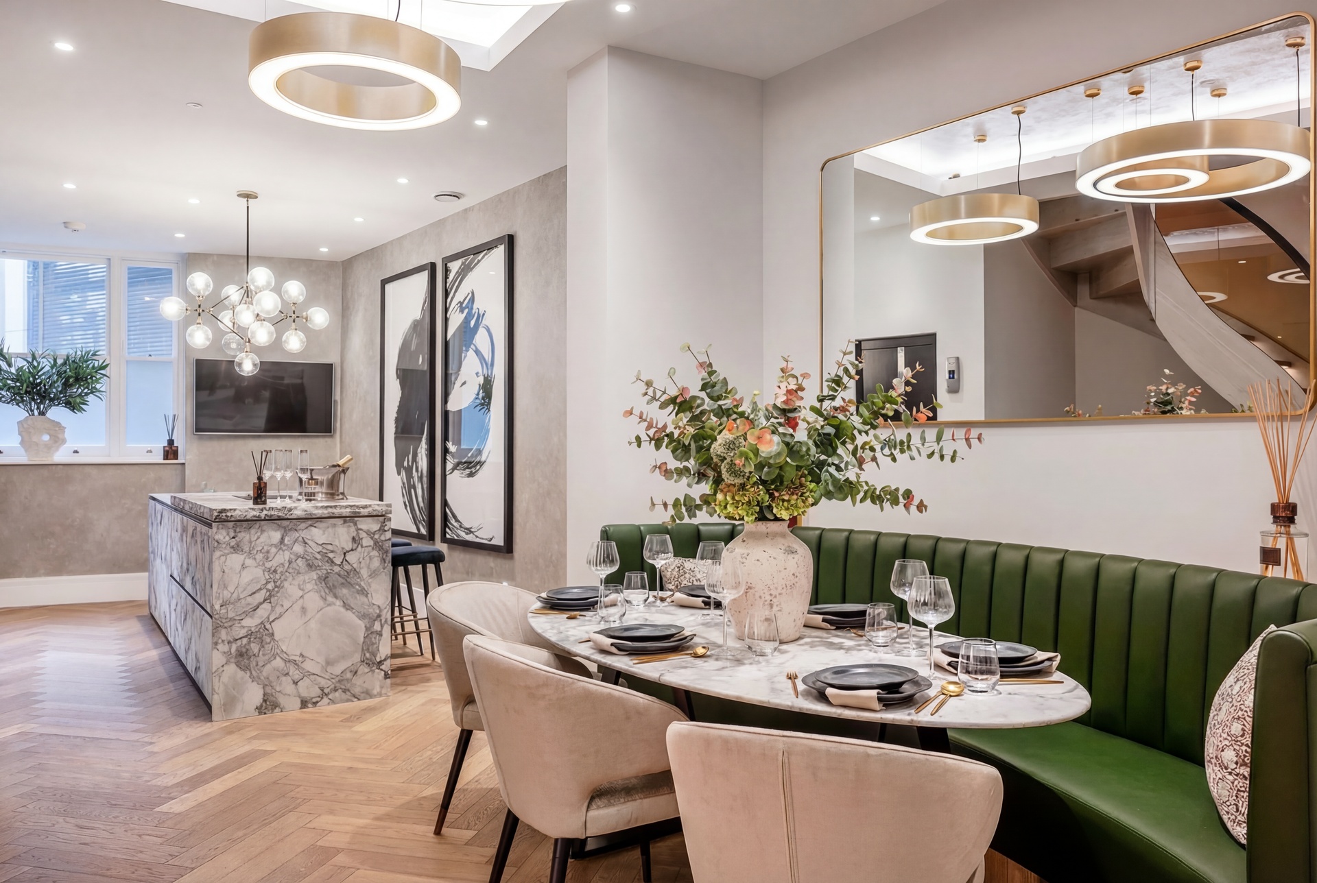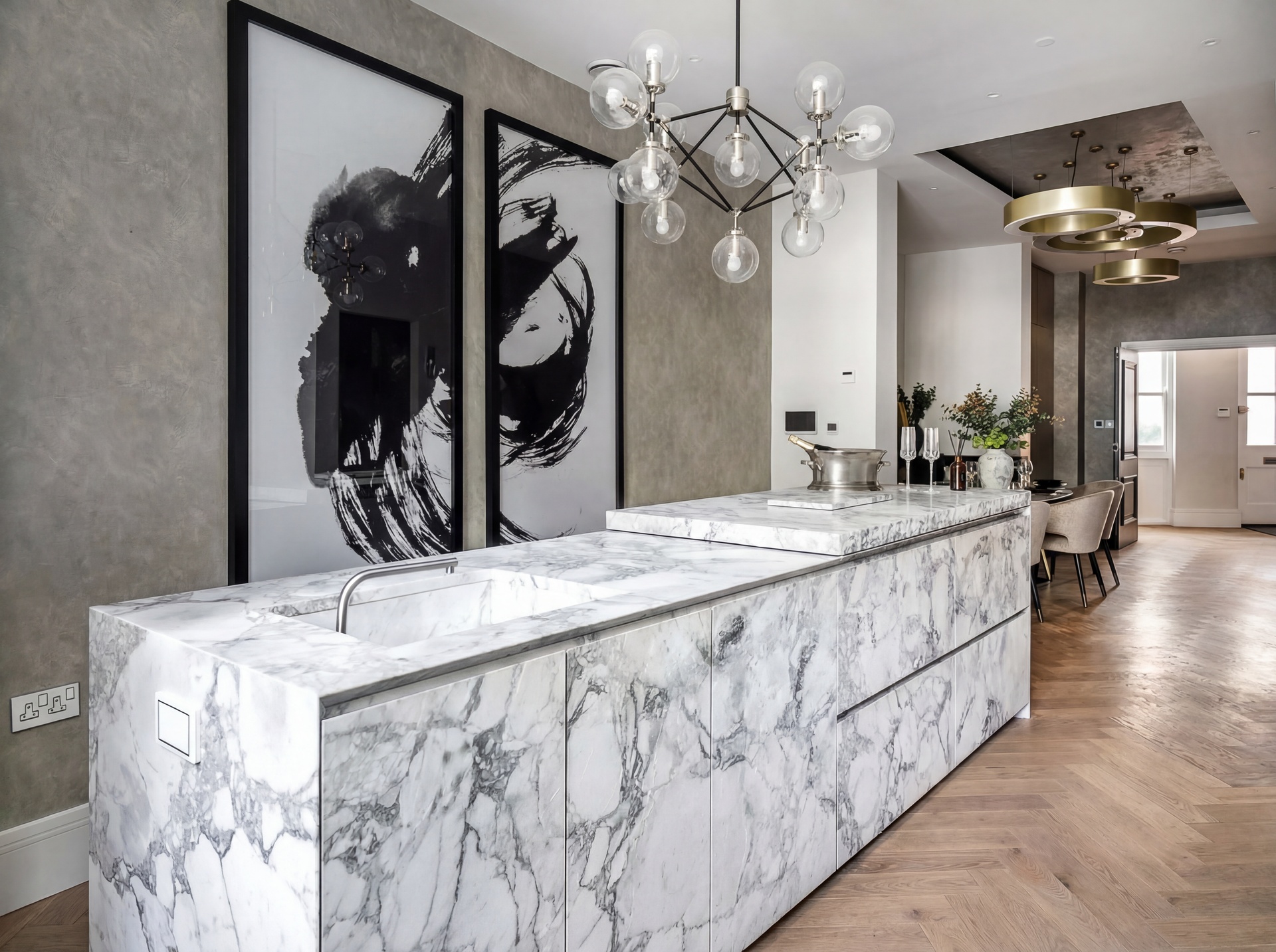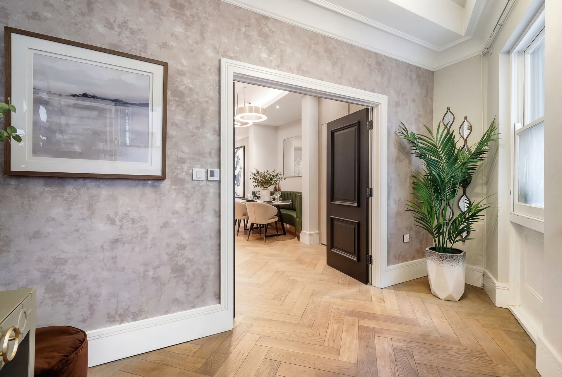 Upon entry, a generous reception hall sets the tone, leading through double doors into an elegant ground floor arranged as a formal dining area and bespoke kitchen. Oiled oak floors laid in a herringbone pattern flow seamlessly throughout the level, enhancing the sense of proportion and craftsmanship. The Minotti kitchen, recently installed, is truly bespoke, finished in honed stone and fitted with discreetly integrated Gaggenau appliances.