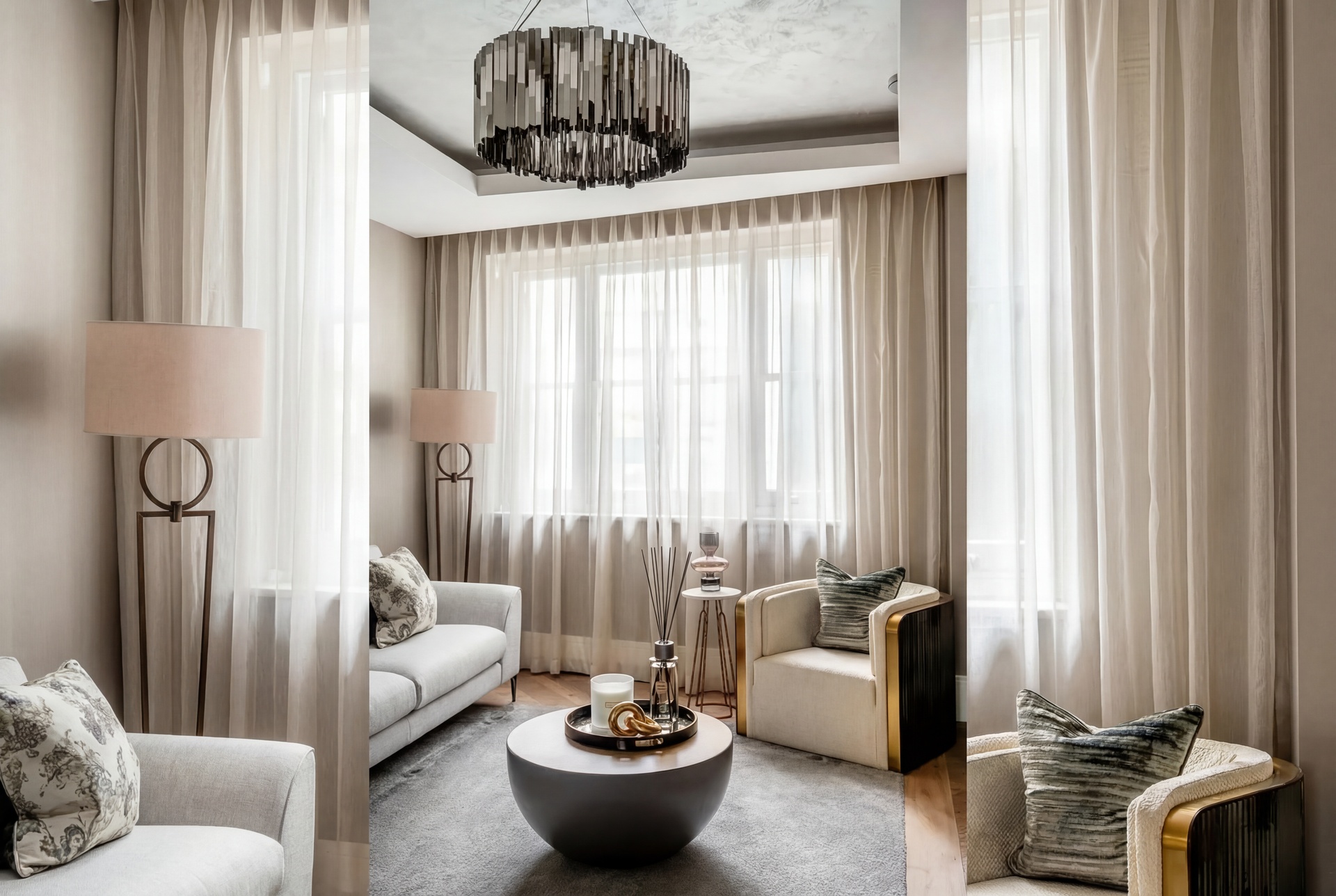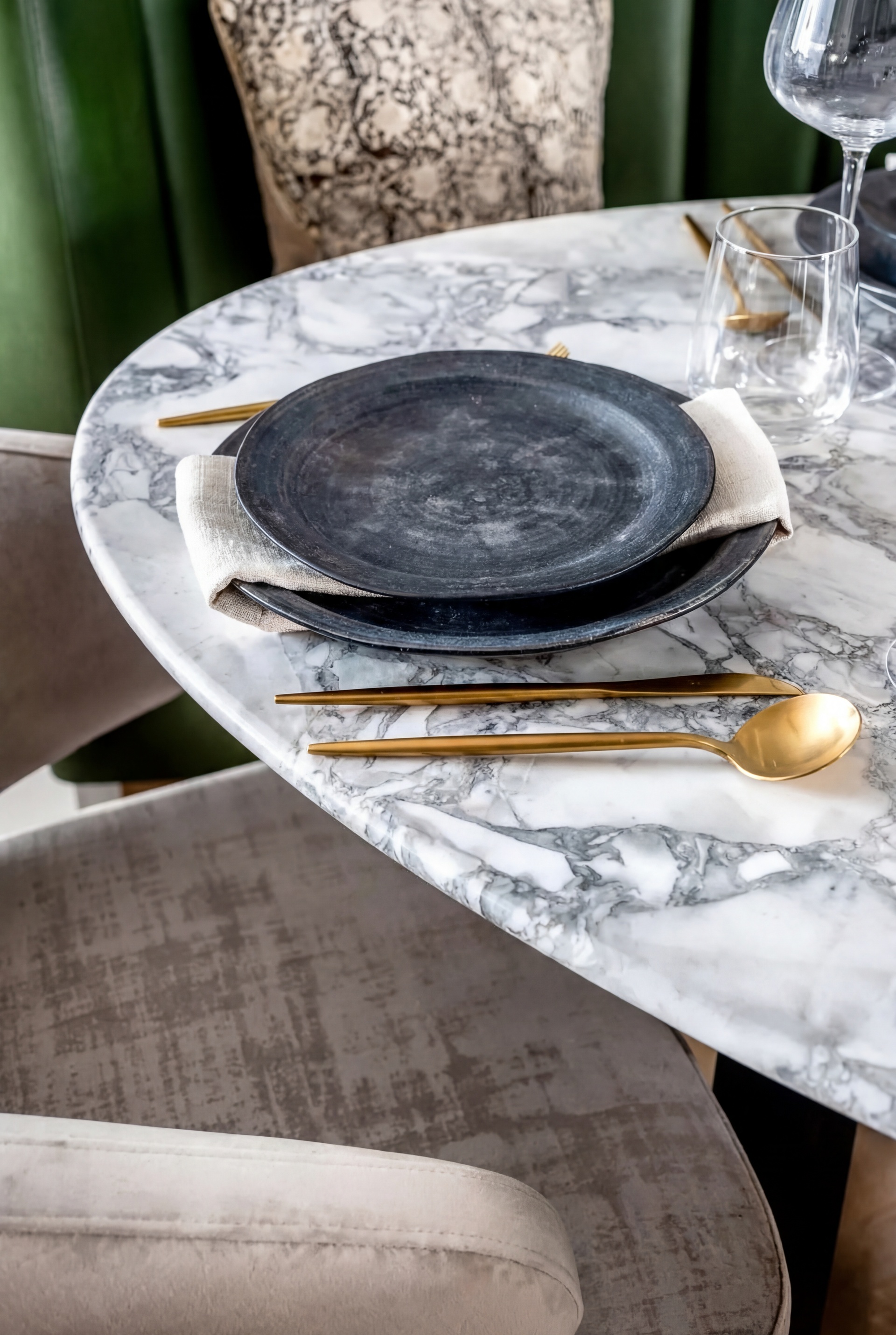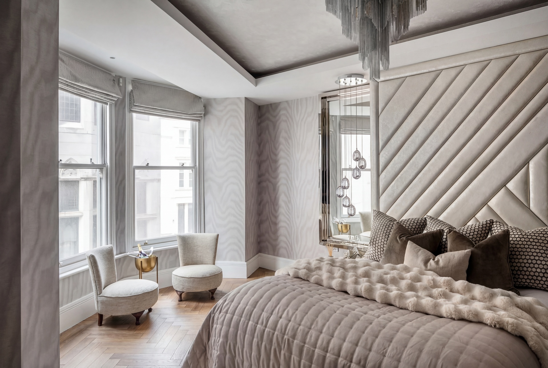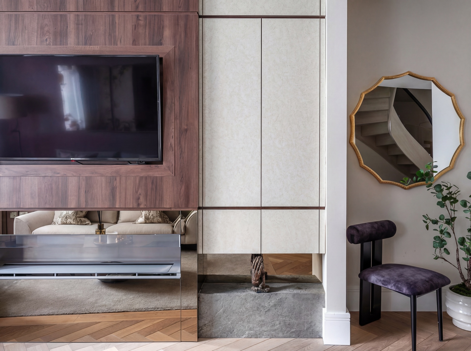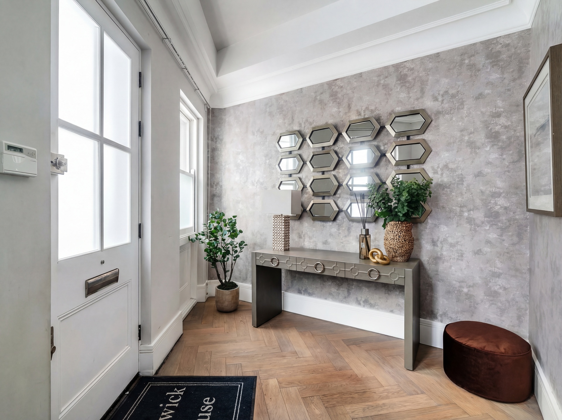 Upon entry, a generous reception hall sets the tone, leading through double doors into an elegant ground floor arranged as a formal dining area and bespoke kitchen. Oiled oak floors laid in a herringbone pattern flow seamlessly throughout the level, enhancing the sense of proportion and craftsmanship. The Minotti kitchen, recently installed, is truly bespoke, finished in honed stone and fitted with discreetly integrated Gaggenau appliances.