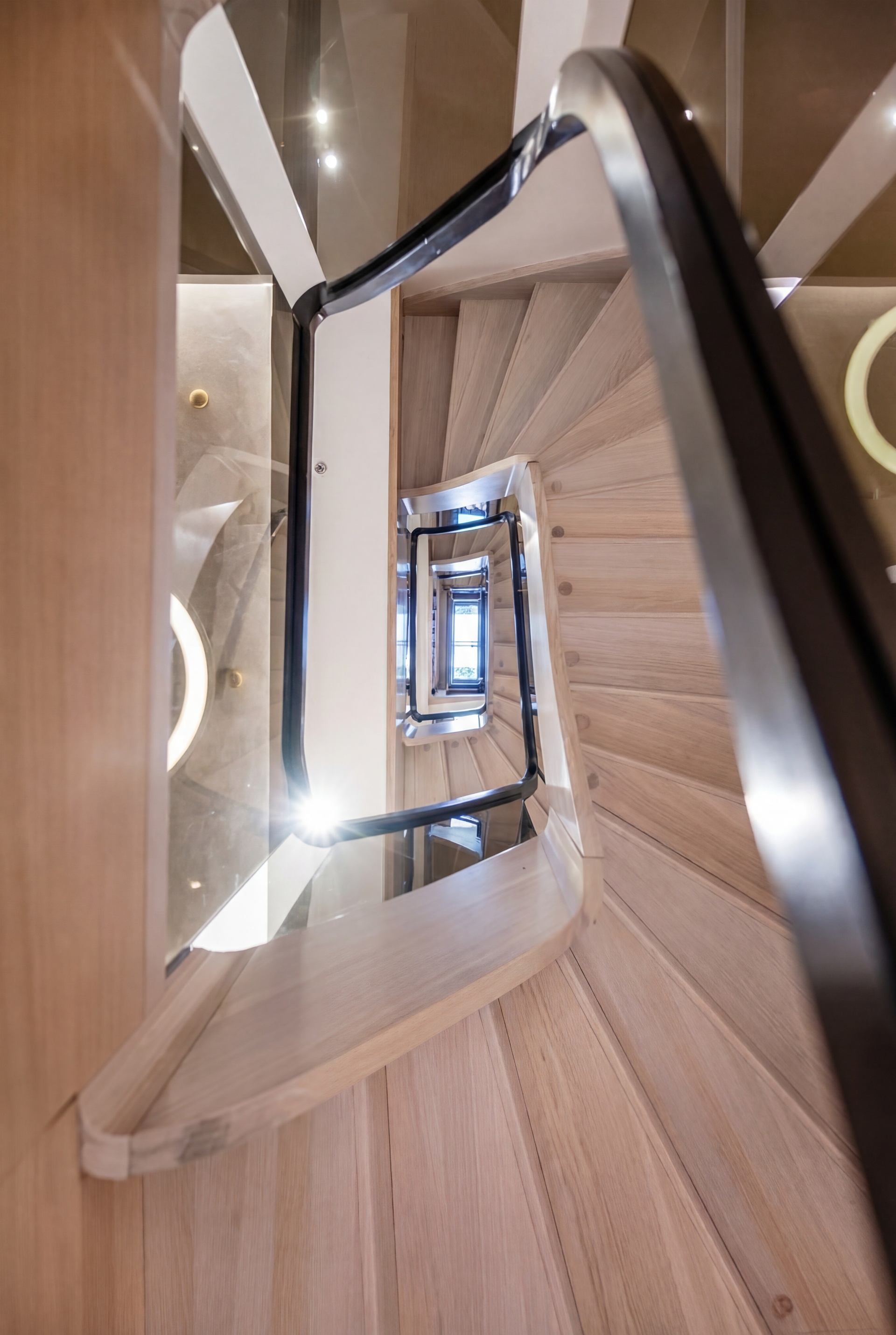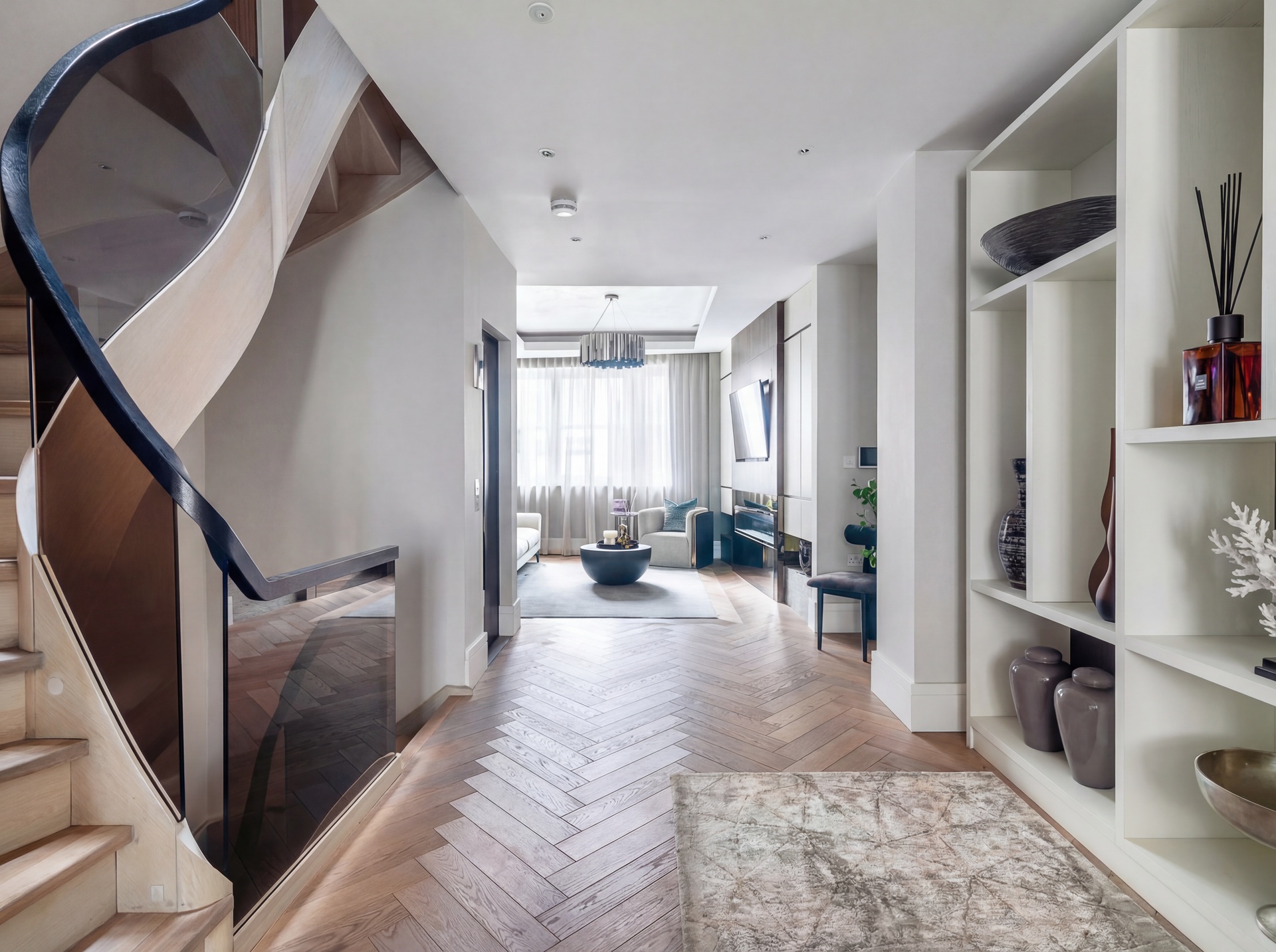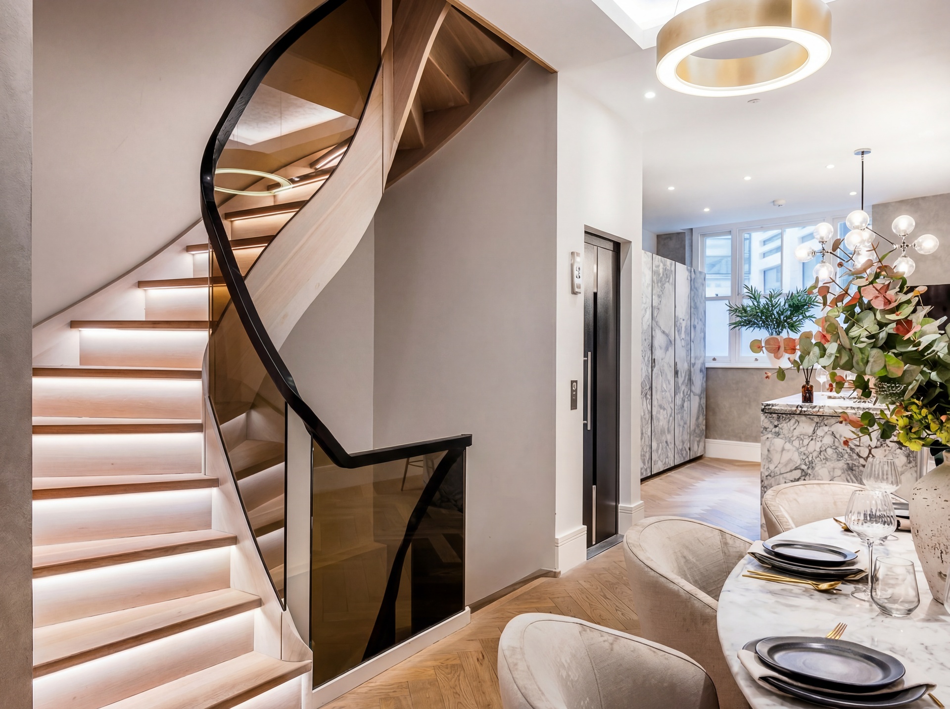 A passenger lift serves all six floors, complemented by a striking bespoke staircase that acts as a central architectural feature and connects the home with ease.