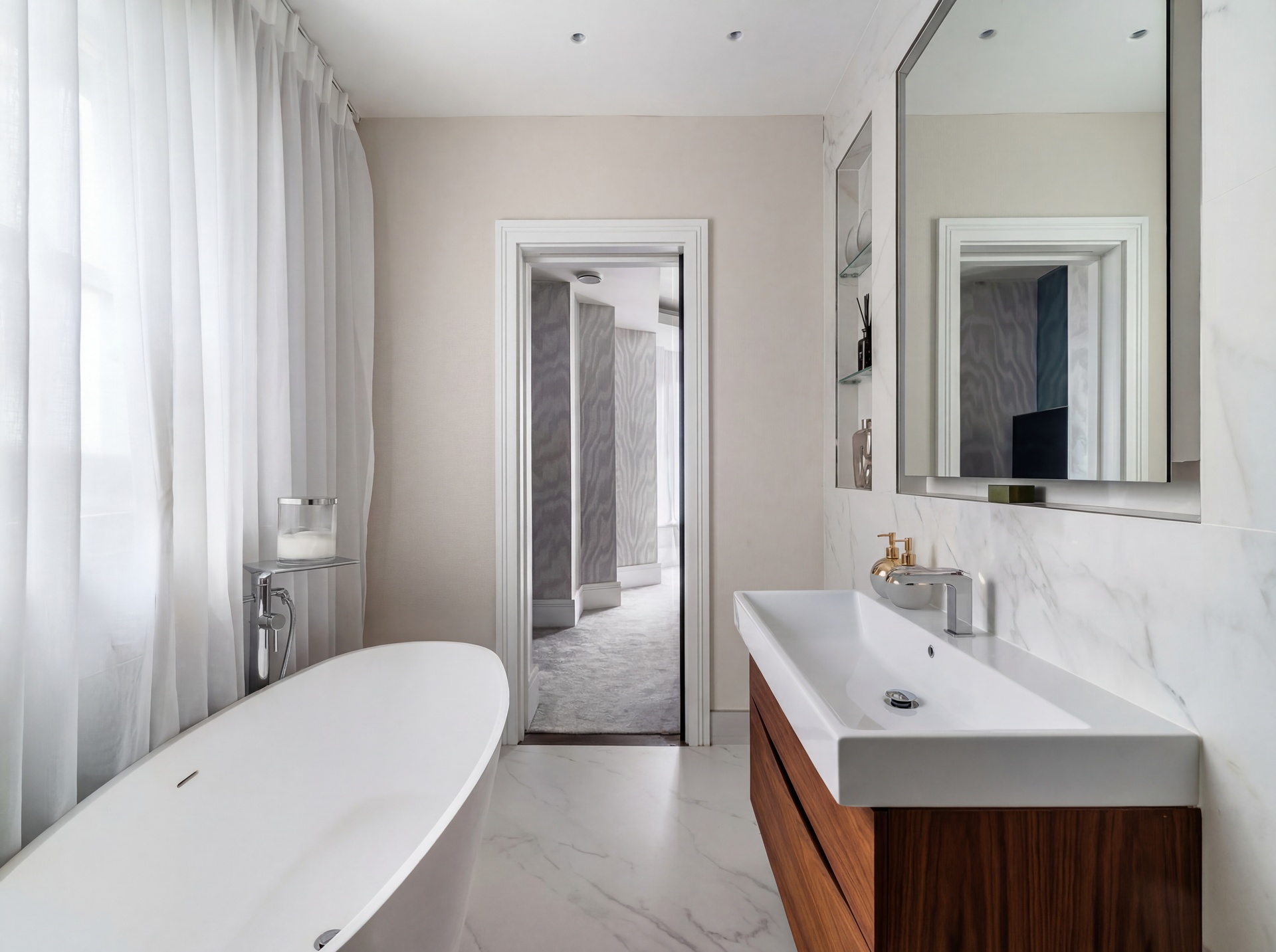The principal bedroom suite occupies the entire second floor, creating a private retreat. The bay-fronted bedroom is finished in calming, neutral tones and luxurious materials. A contemporary en-suite bathroom features a freestanding bath and separate shower, while a generous dressing room with bespoke joinery is positioned to the rear.