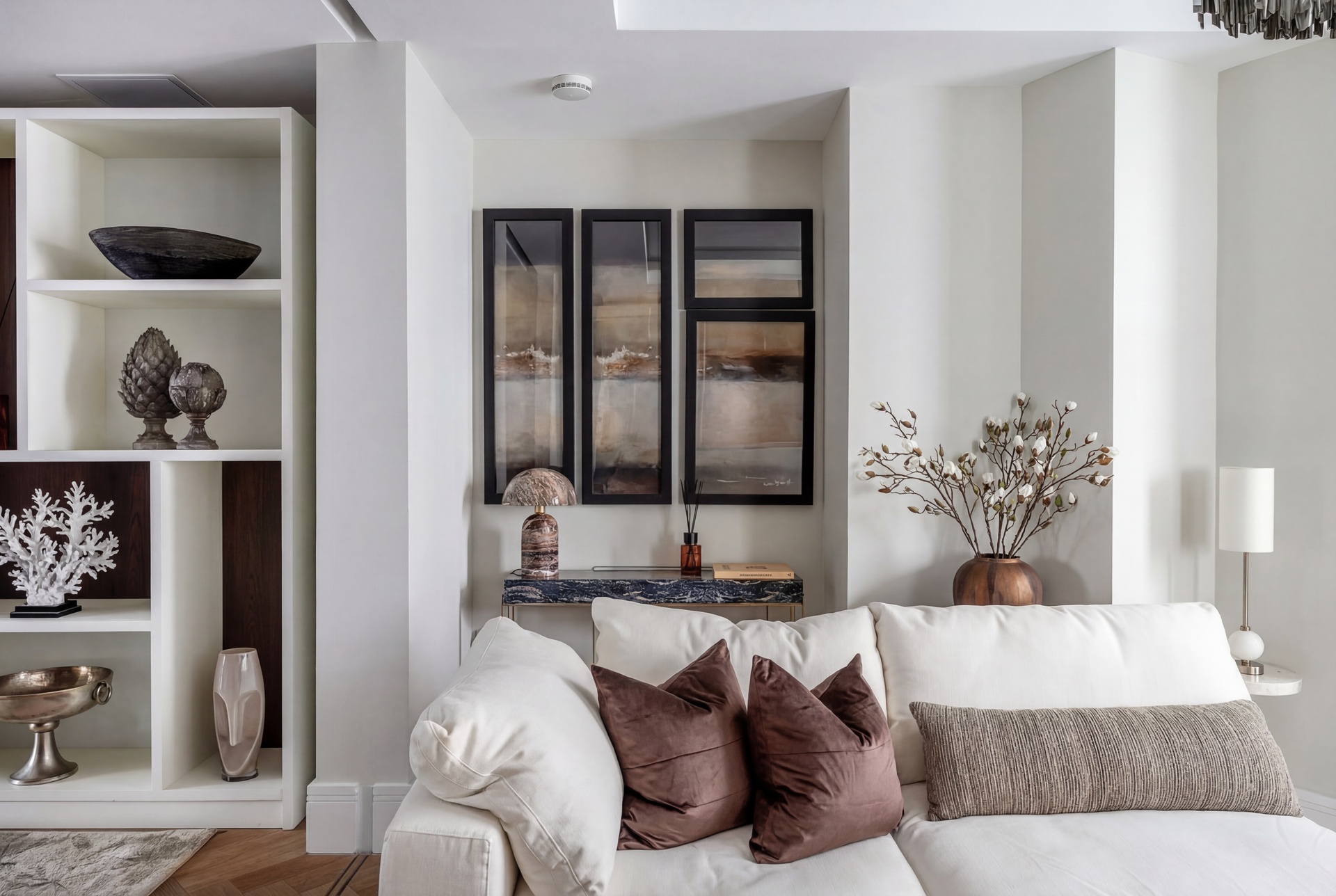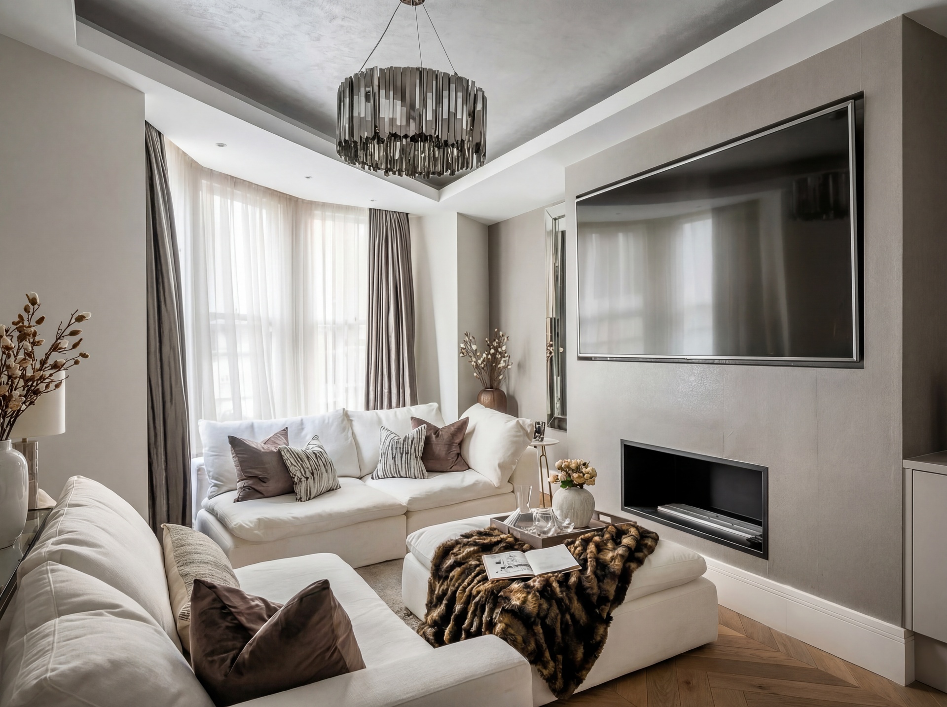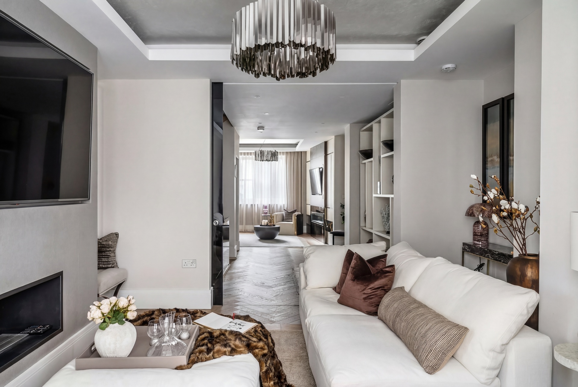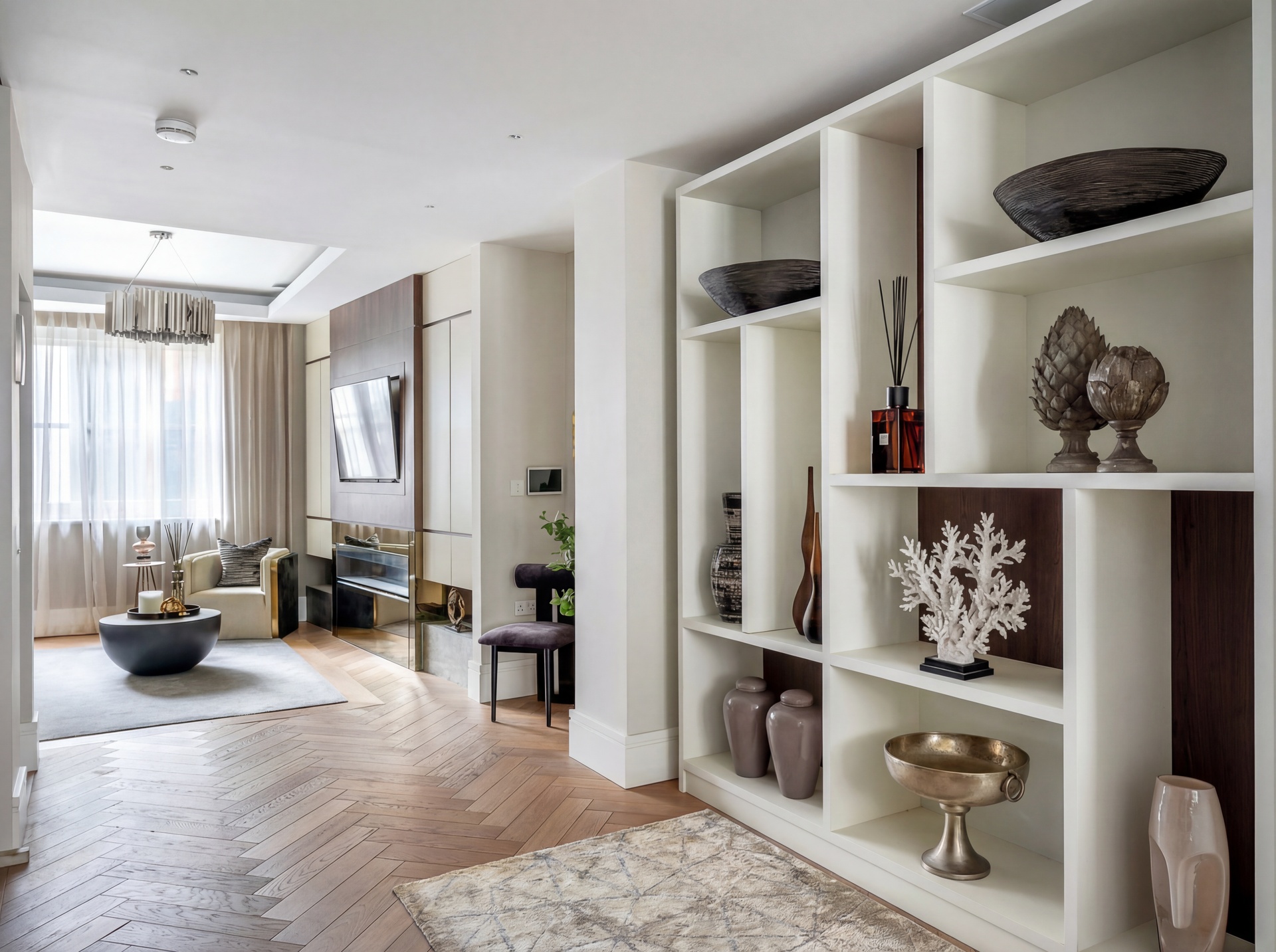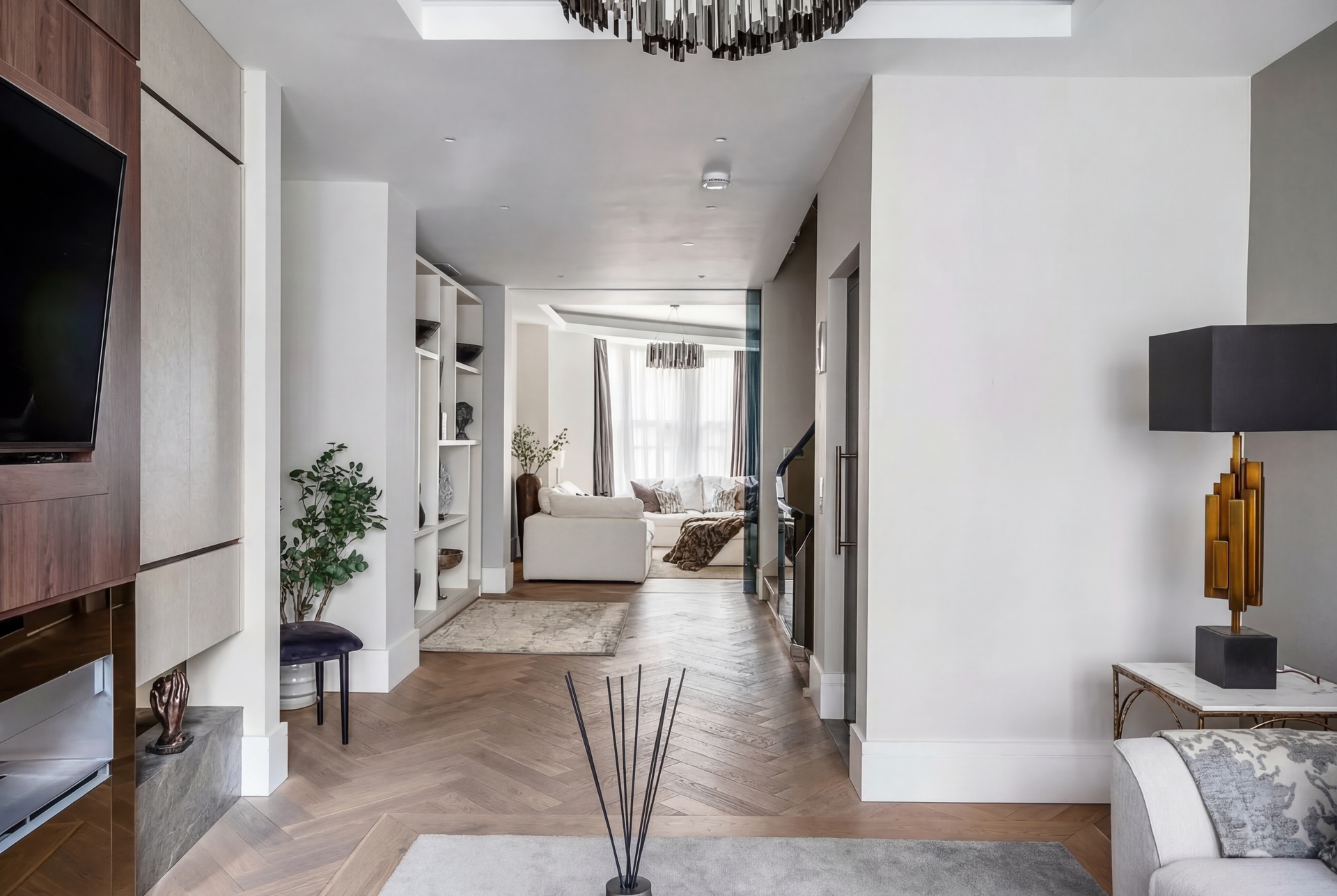 The first floor offers a refined balance of formal and informal living, with a rear reception room and a more intimate front snug, divided by glazed pocket doors. Both spaces benefit from app-controlled integrated AV systems, programmable lighting, living-flame fireplaces, and underfloor heating.
