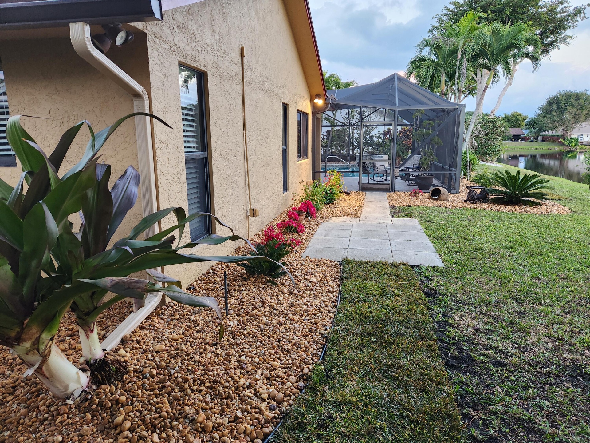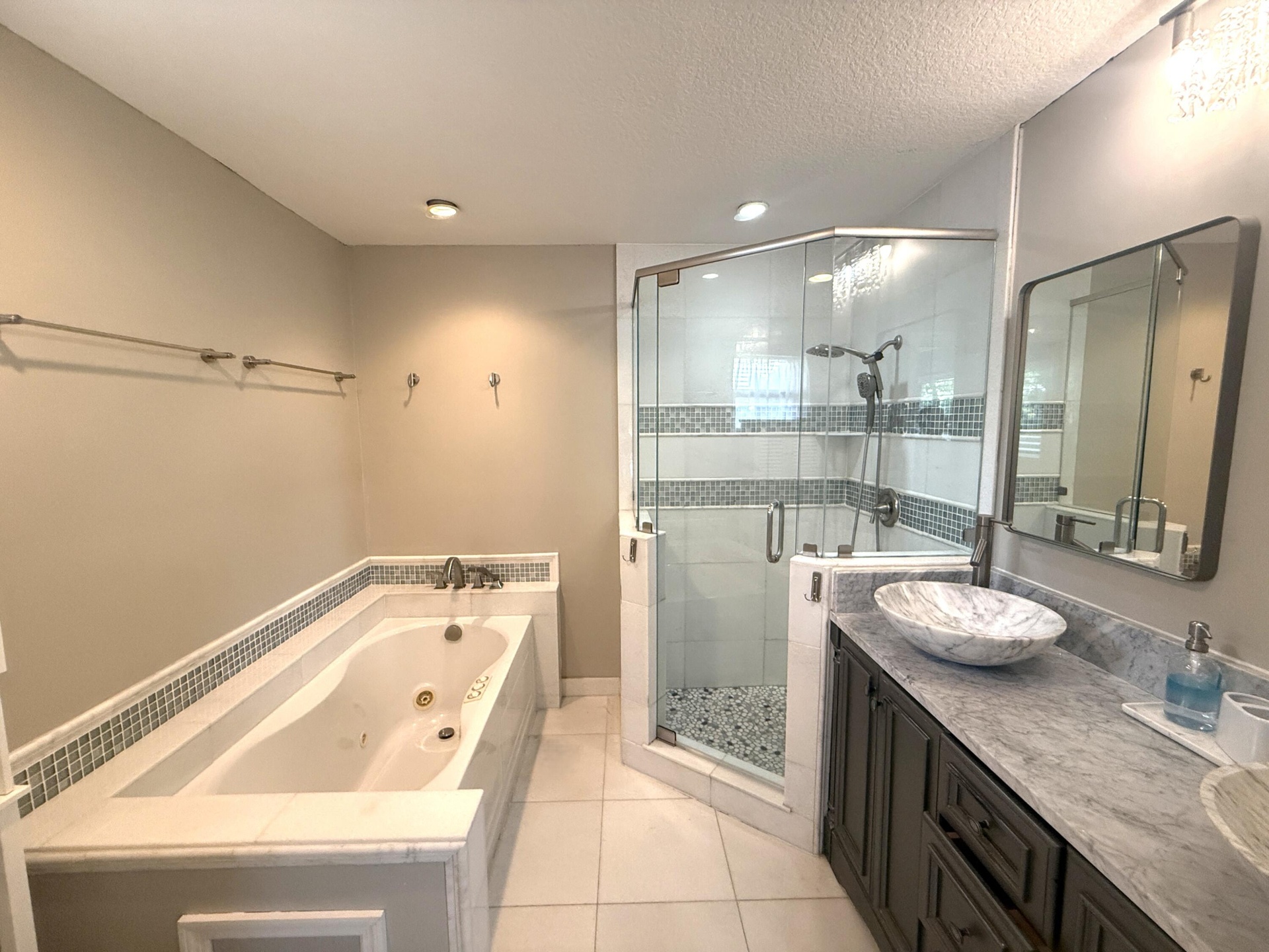 The split floor plan features a formal living and dining room that opens to a screened pool and patio area, perfect for relaxing or entertaining. The updated kitchen boasts wood cabinets, granite countertops, and stainless-steel appliances. The spacious master suite includes a California closet, a sitting area, and a luxurious bath with a Jacuzzi tub, double-sink vanity, custom lighting, and a glass-enclosed shower This home is fully renovated with impact windows and doors throughout, tile flooring, and thoughtful updates, including a new AC (2024), new washer and dryer, and a 4-year-old roof. The screened patio offers comfort from the Florida sun and a barrier from mosquitoes, making it perfect for year-round enjoyment.