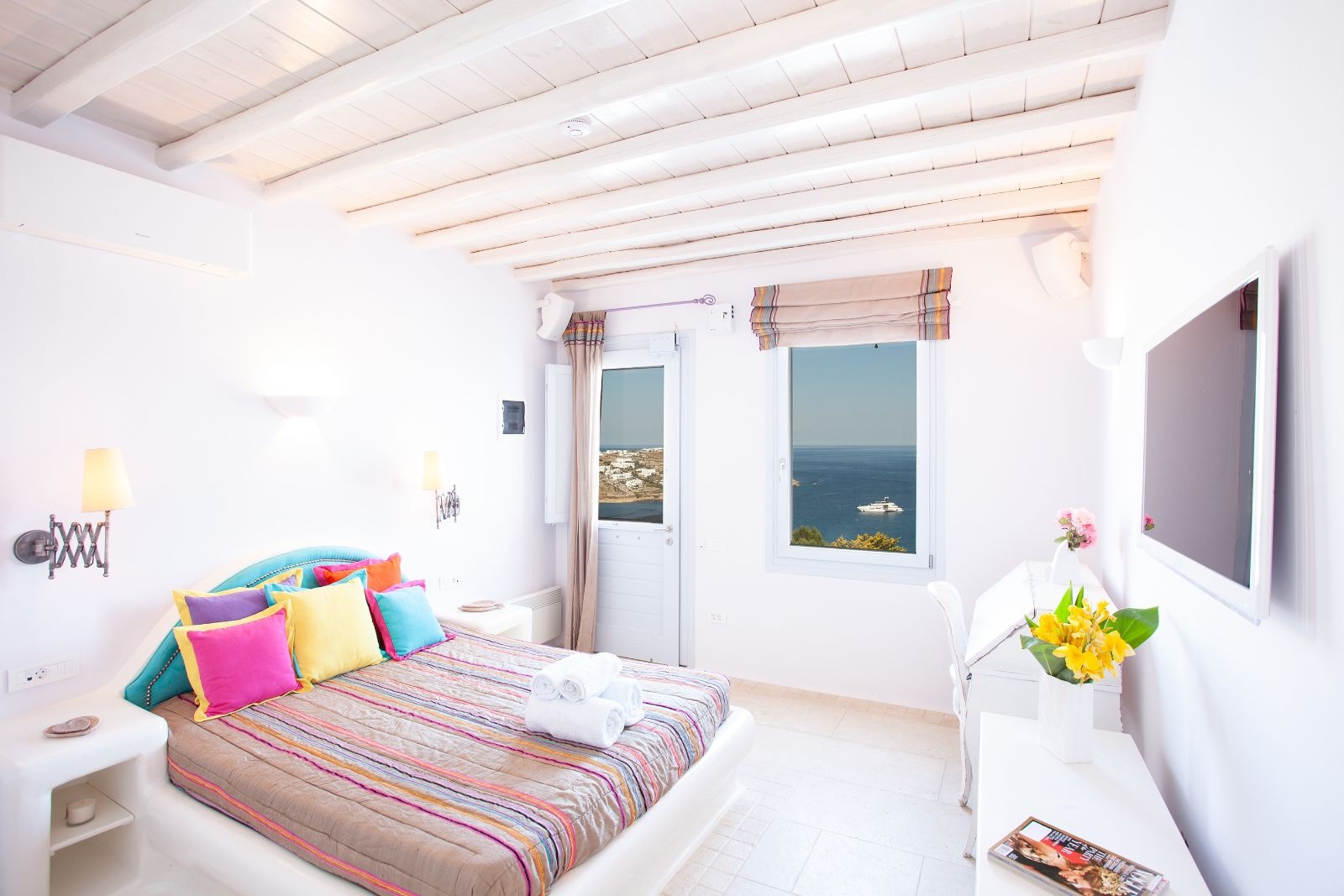One of the second bedroom suite's most captivating features is its stunning sea views. Large windows frame the breathtaking panorama of the Aegean Sea, inviting the beauty of the outside in. From the comfort of the suite, guests can witness the ever-changing hues of the sea and sky, from the vibrant colors of sunrise to the tranquil shades of twilight.