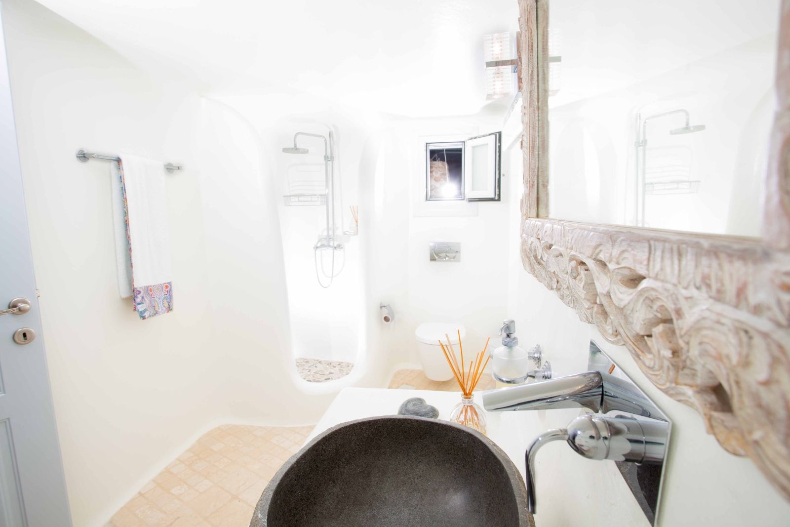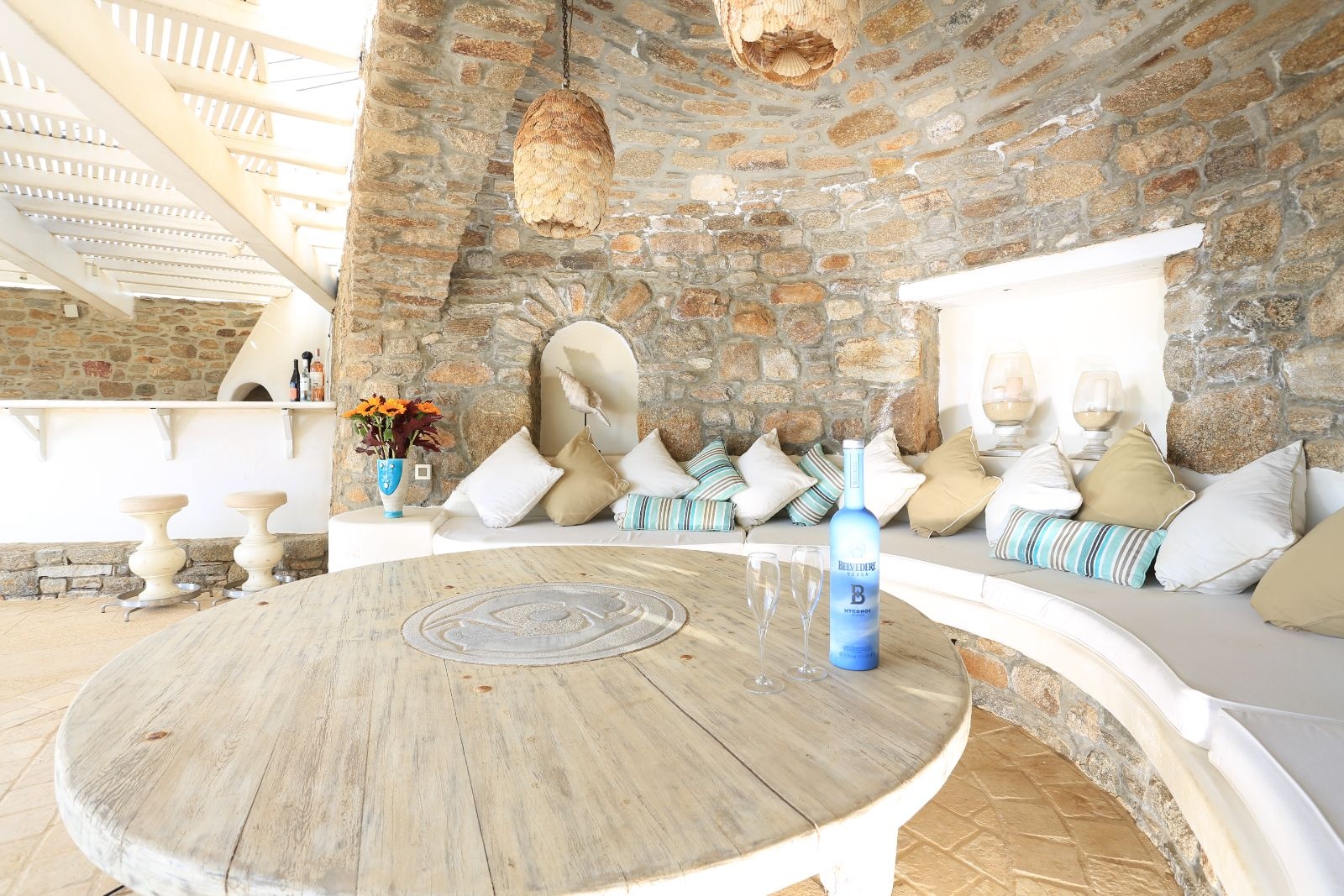 At the heart of this opulent suite are two ensuite bathrooms, each meticulously crafted from traditional Mykonian stone materials. These bathrooms exude a timeless charm, their textures and colors echoing the natural beauty of the island's landscape. The use of stone not only pays homage to local architectural traditions but also adds an element of rustic luxury to the space, providing a spa-like atmosphere where one can unwind in absolute serenity.