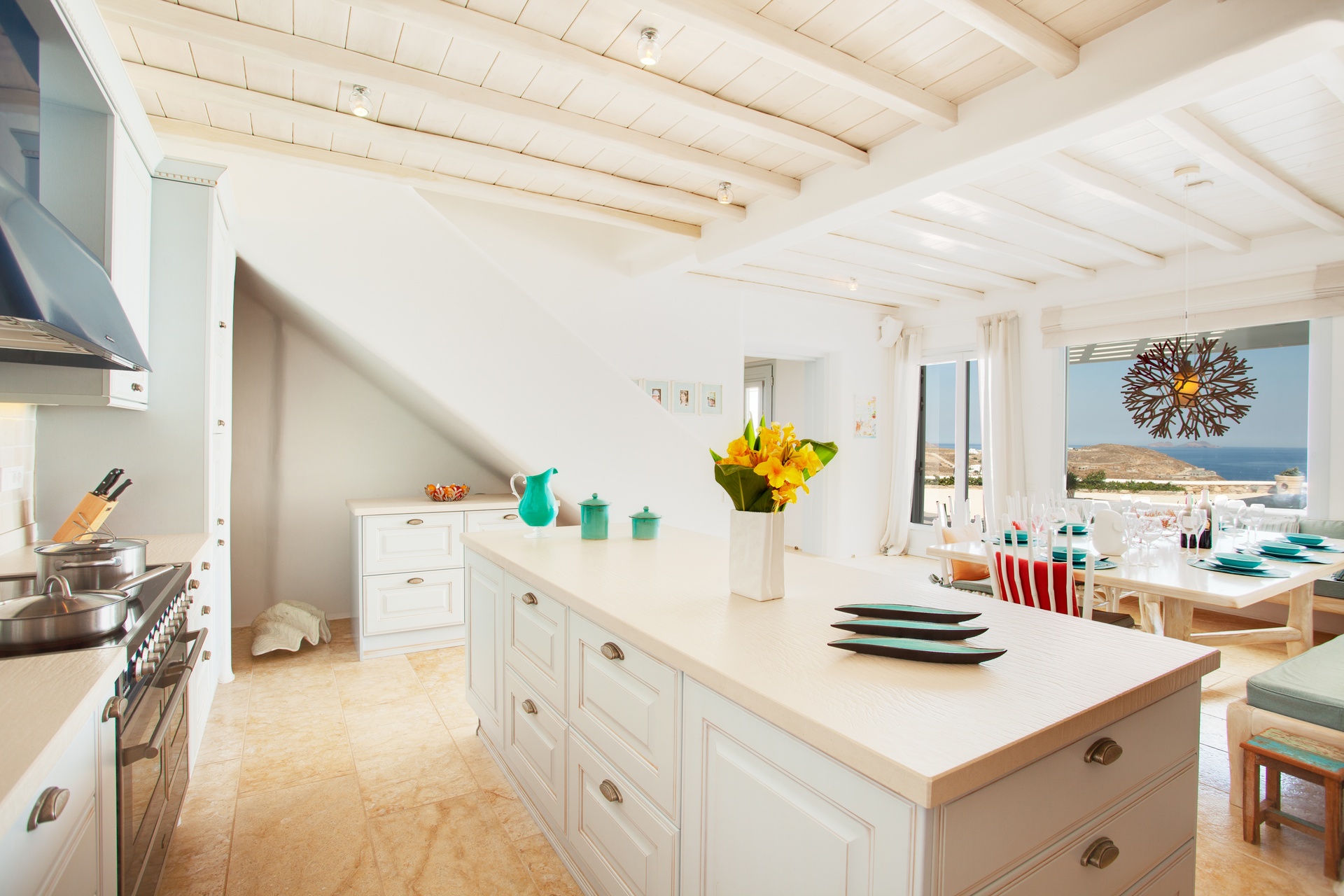 The kitchen's open-plan layout ensures that it remains a part of the villa's social space, allowing the cook to engage with guests without barriers. Natural light floods the area through strategically placed windows, enhancing the welcoming ambiance and highlighting the beauty of the materials used throughout the kitchen.