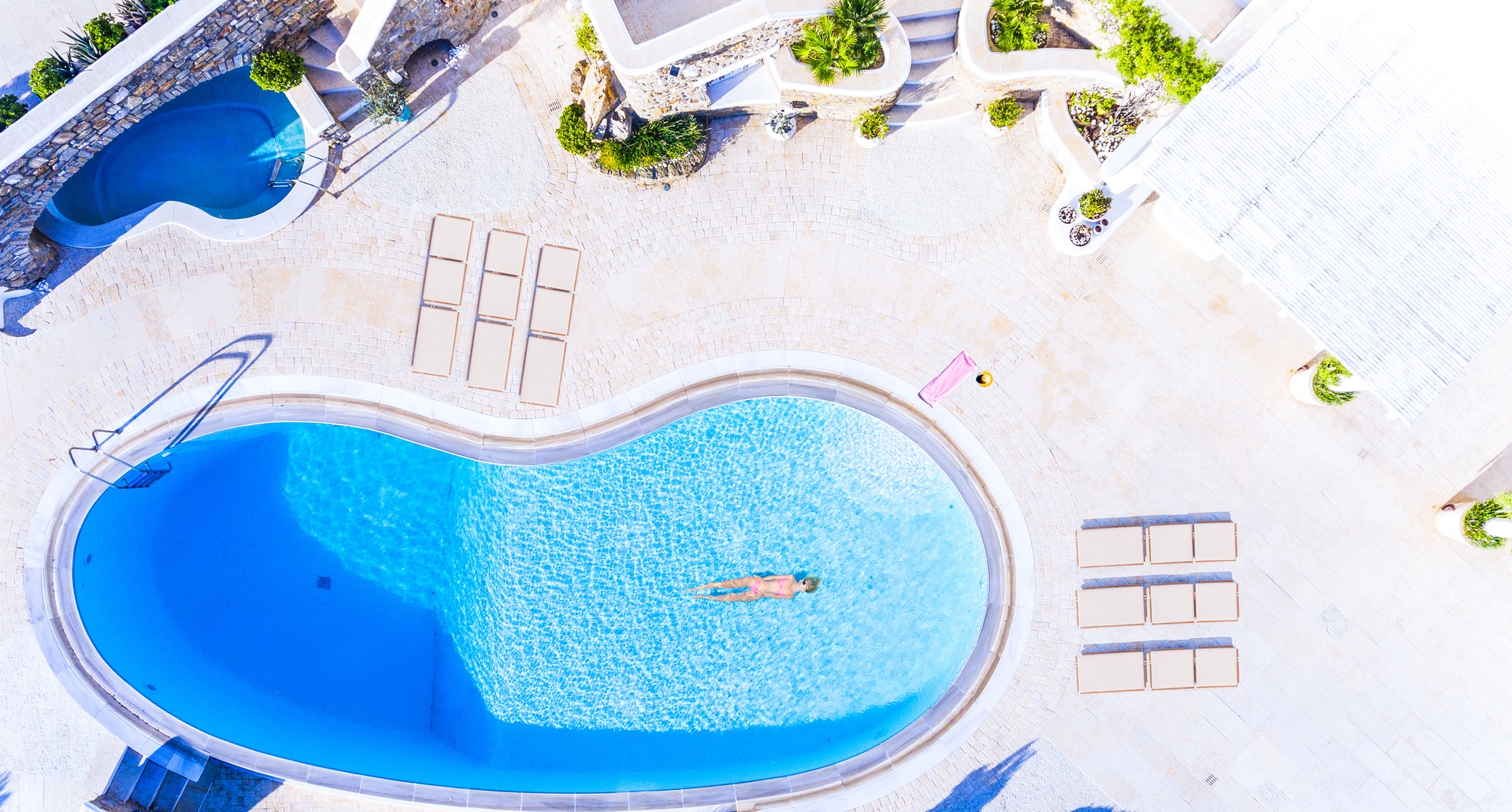 Whether it's witnessing the sky's canvas painted with the colors of dawn, celebrating under the glow of a full moon, or simply enjoying the day's warmth on a bamboo sofa bed, the experiences here are bound to be as memorable as they are diverse. Villas infinity pool area is not just a place but a journey into the heart of Cycladic luxury, where every detail is curated to offer an unparalleled experience of beauty, comfort, and celebration.
