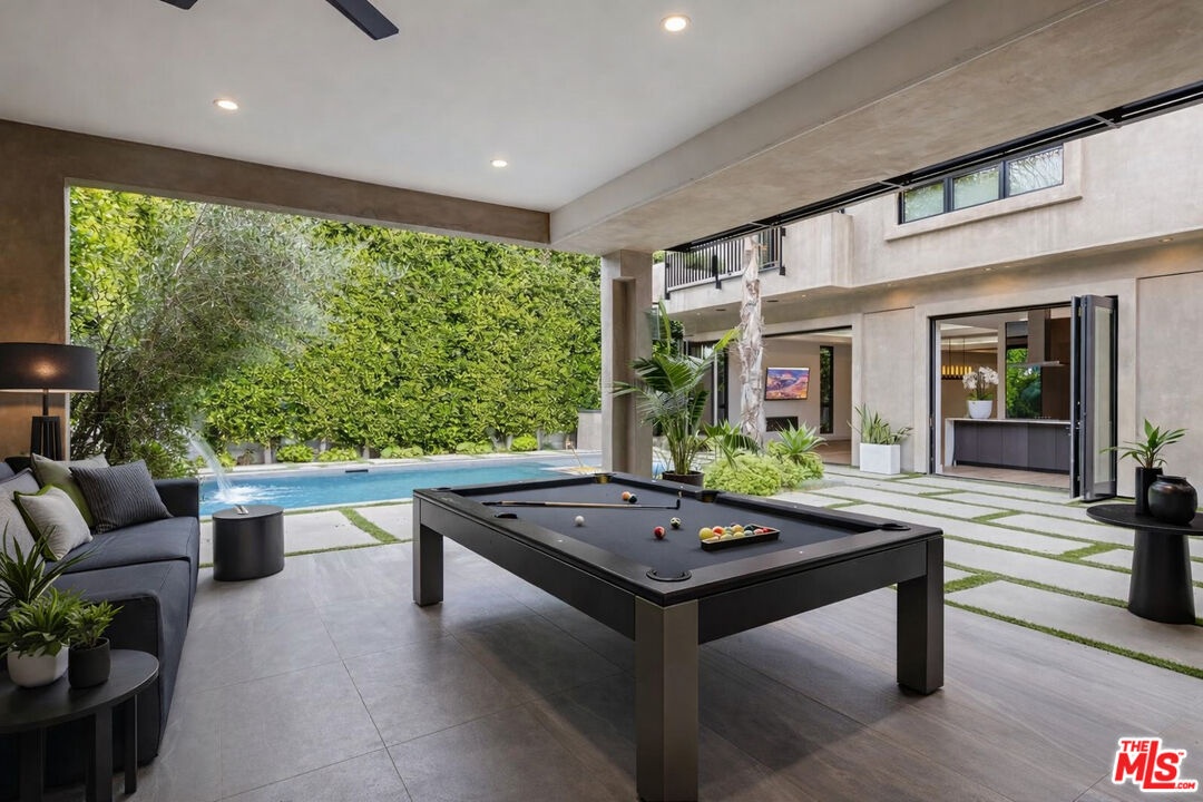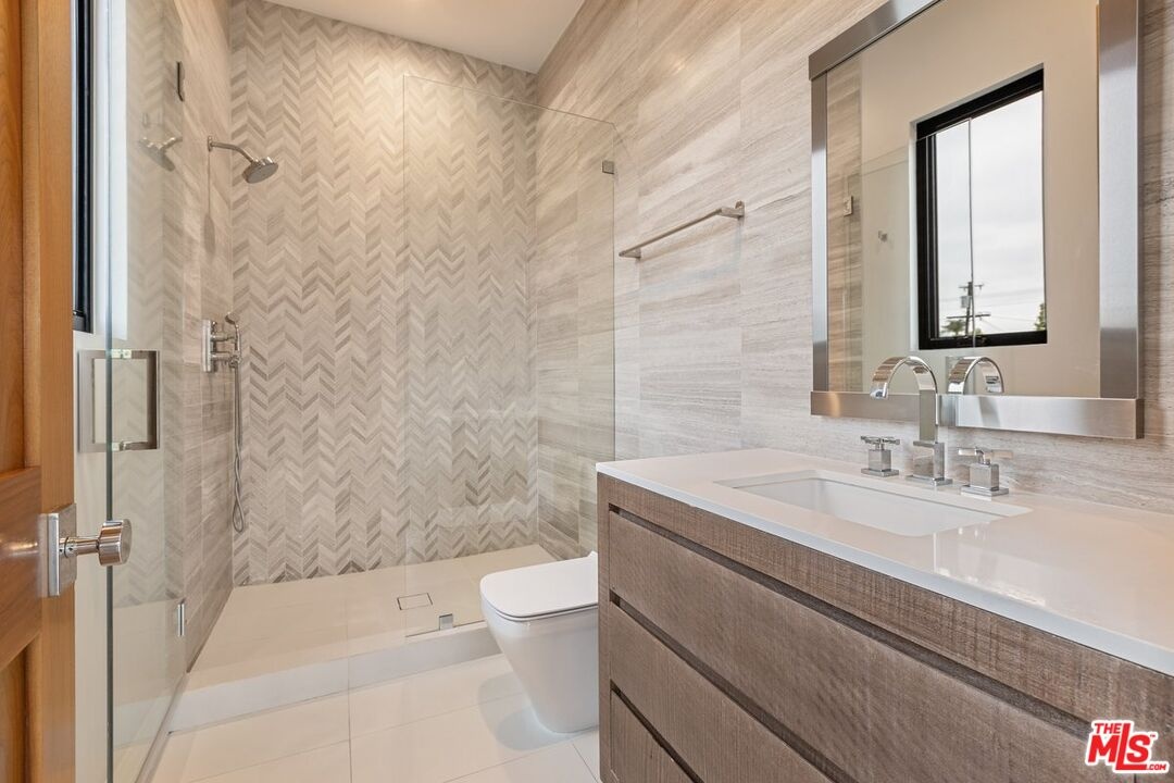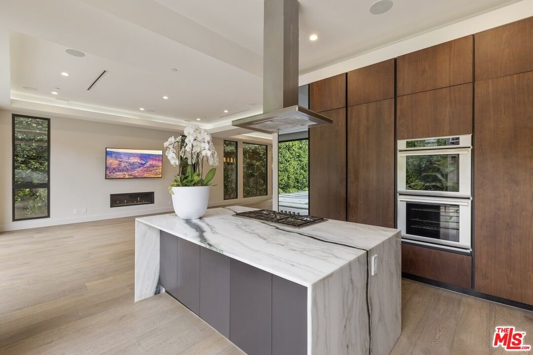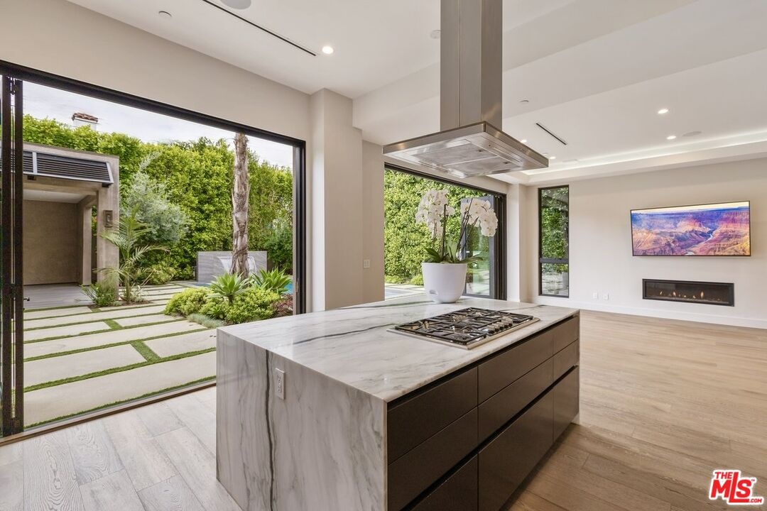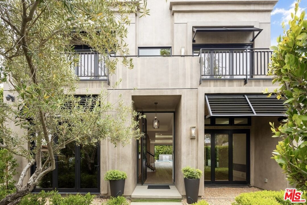 Sophisticated, gated modern residence in the highly sought-after Beverly Grove neighborhood. Masterfully blending architectural design with rich, warm tones throughout. This exceptional Control 4 smart home showcases a seamless open-concept floor plan enhanced by soaring ceilings, expansive bi-folding doors, hardwood floors, and two striking fireplaces that create an inviting yet refined ambiance. The gourmet chef's kitchen is beautifully appointed with premium Thermador appliances and an oversized island, flowing effortlessly into the family and entertaining spaces. Walls of glass open to a private backyard retreat featuring a resort-style pool and spa with waterfall, cabana lounge, and built-in BBQ an ideal setting for sophisticated indoor-outdoor living. The home offers four generously sized ensuite bedrooms, including a luxurious primary suite complete with its own fireplace, private balcony, custom walk-in closet, and an elegant spa-inspired bath featuring a soaking tub framed by a picturesque window. A rooftop entertainer's deck crowns the residence, offering sweeping panoramic views of Los Angeles and the iconic Hollywood Sign. Ideally located moments from LACMA, 3rd Street's celebrated dining, The Grove, and Beverly Center. Select images have been digitally staged. Offered unfurnished.