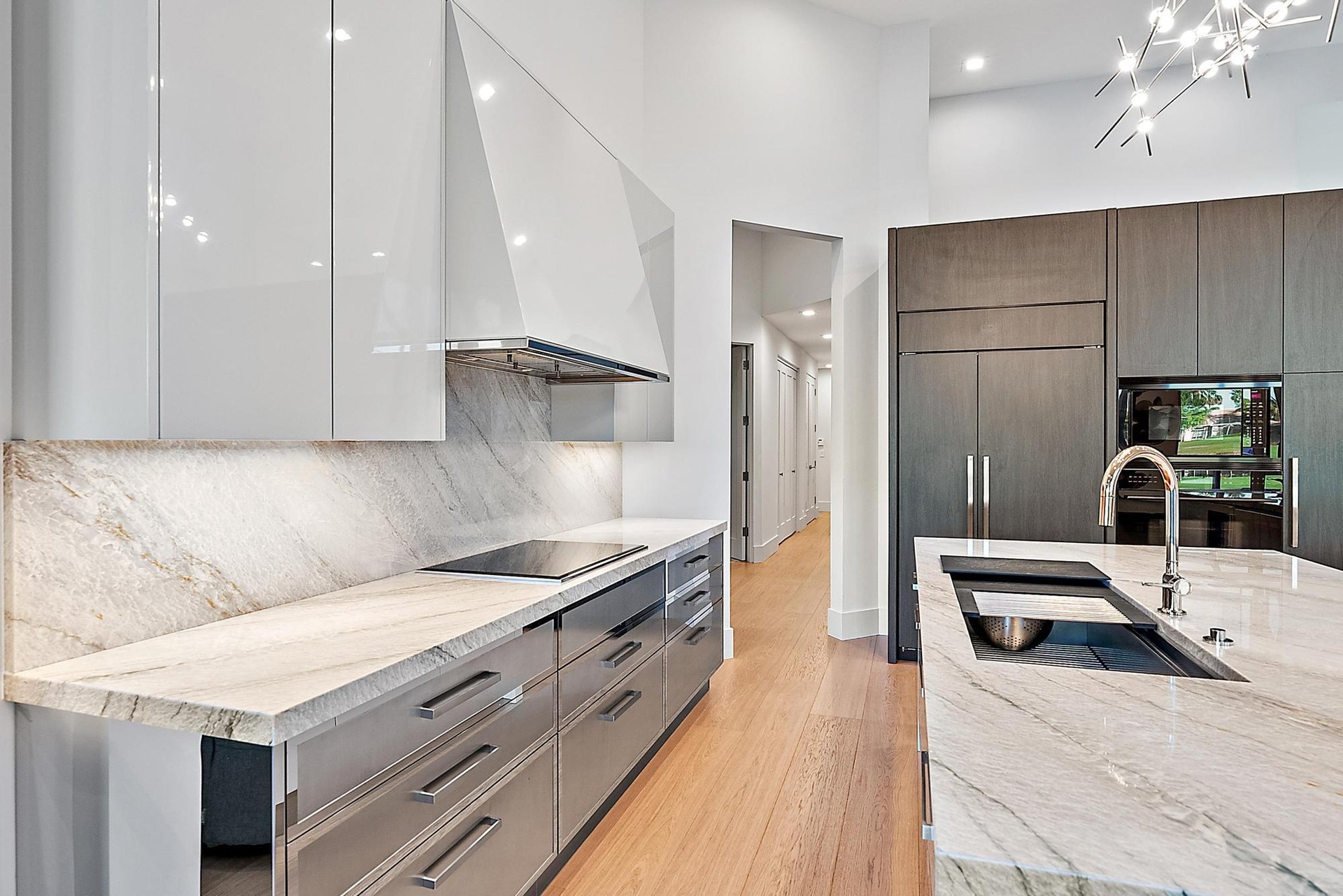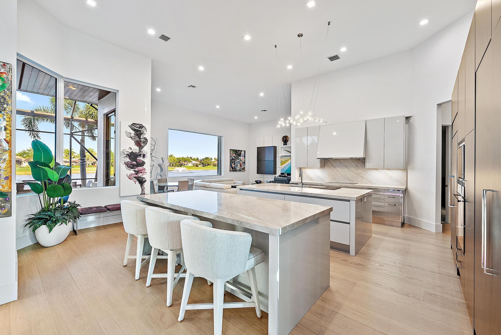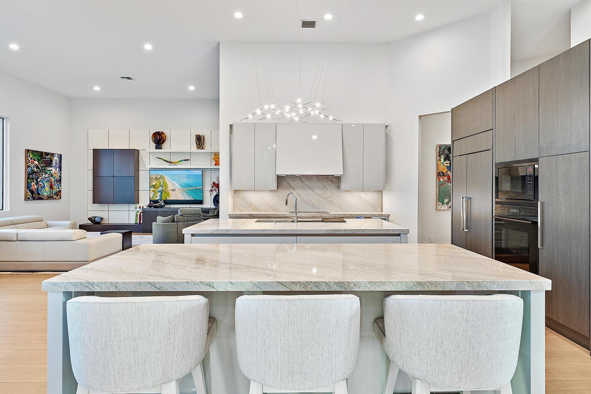 Inside, the scale of renovation continues. In 2023, the main living areas were dramatically redesigned with new architectural walls, ceiling treatments, custom lighting, and engineered hardwood flooring, culminating in the installation of a stunning twin-island Downsview kitchen featuring a Wolf induction cooktop and Galley sink--a chef's showpiece blending innovation and refinement. The following year, the two guest baths were fully updated, and the primary suite was transformed into a spa-level retreat with all-new plumbing, custom fixtures, glass enclosures, and hand-painted wall coverings. An exterior pump was added to ensure superior and consistent water pressure--an often-overlooked but meaningful upgrade.