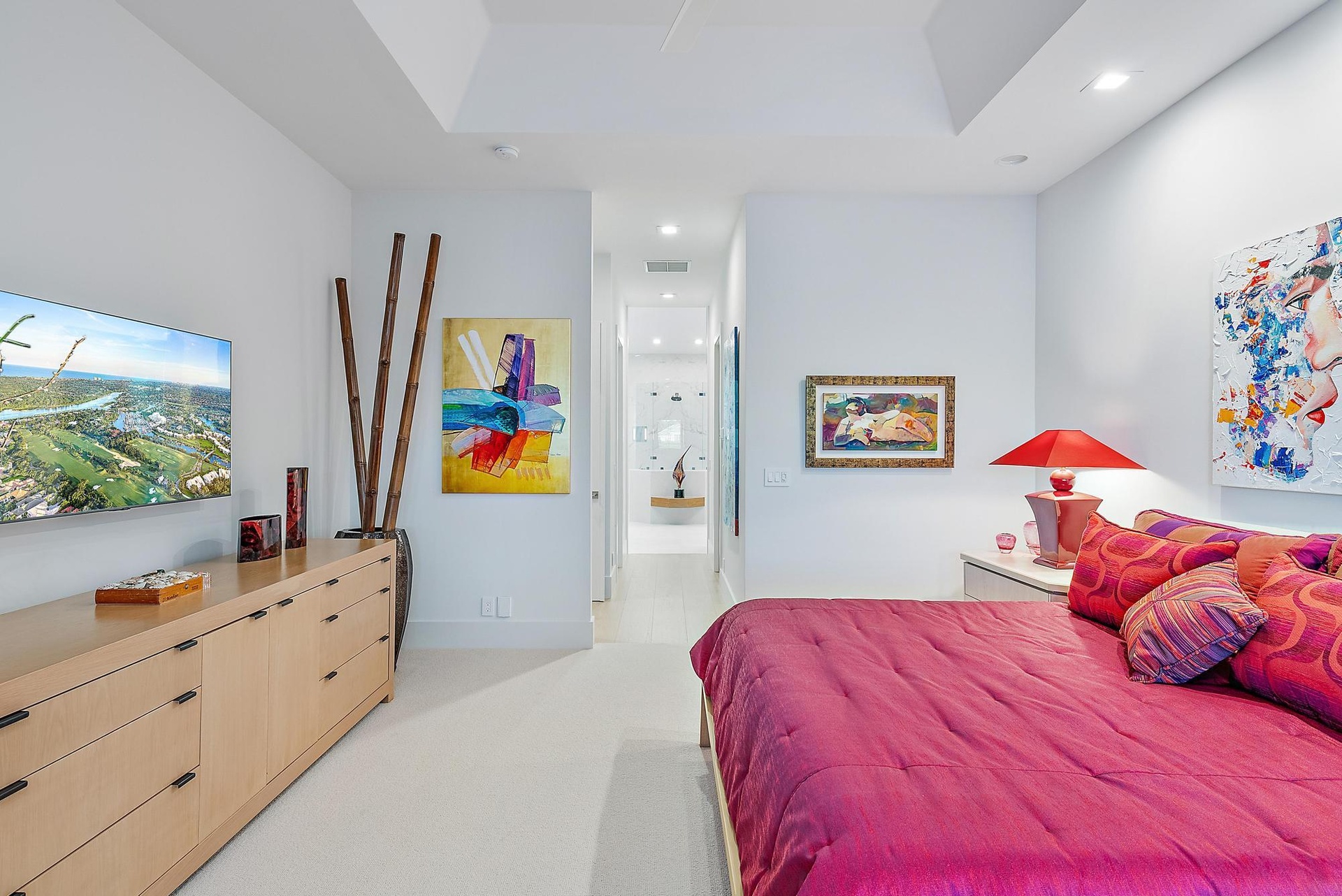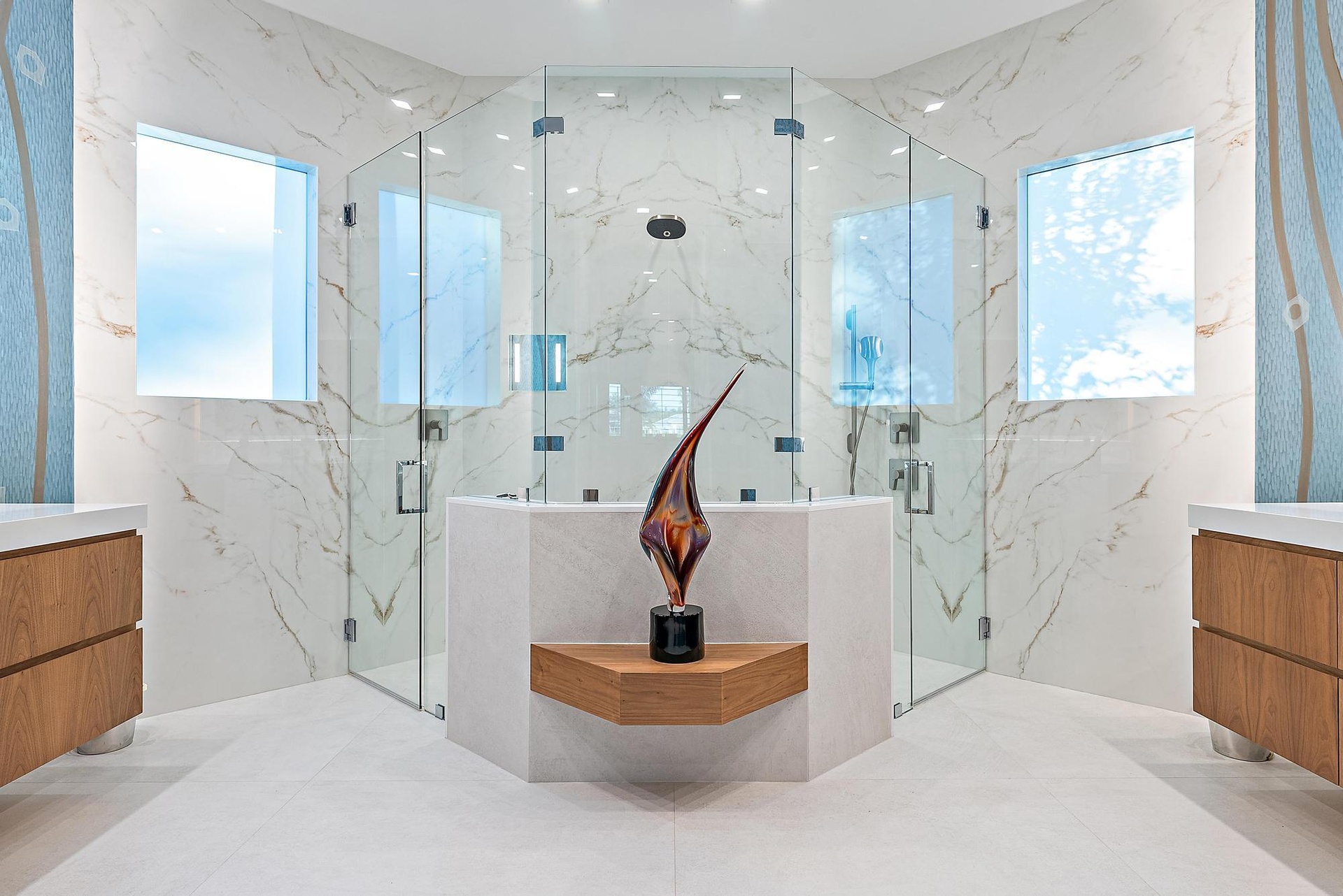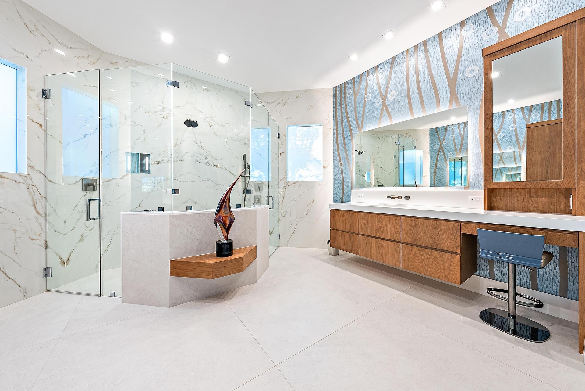 Inside, the scale of renovation continues. In 2023, the main living areas were dramatically redesigned with new architectural walls, ceiling treatments, custom lighting, and engineered hardwood flooring, culminating in the installation of a stunning twin-island Downsview kitchen featuring a Wolf induction cooktop and Galley sink--a chef's showpiece blending innovation and refinement. The following year, the two guest baths were fully updated, and the primary suite was transformed into a spa-level retreat with all-new plumbing, custom fixtures, glass enclosures, and hand-painted wall coverings. An exterior pump was added to ensure superior and consistent water pressure--an often-overlooked but meaningful upgrade.