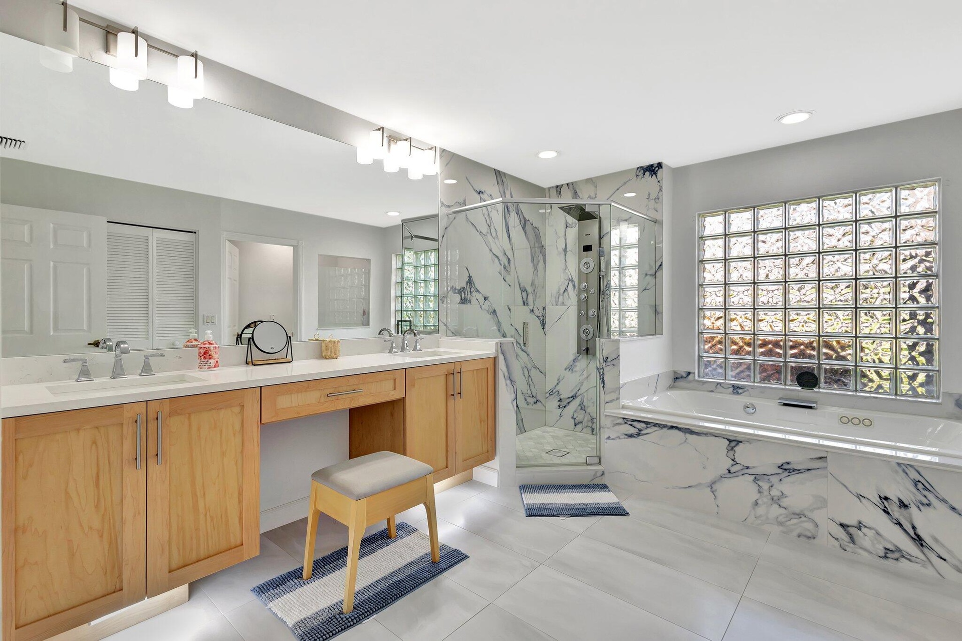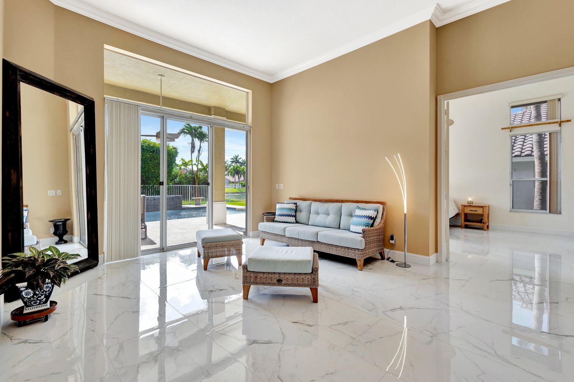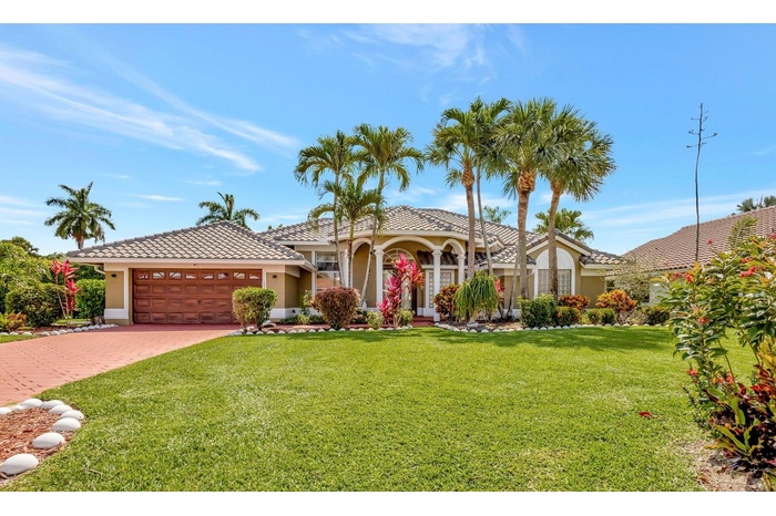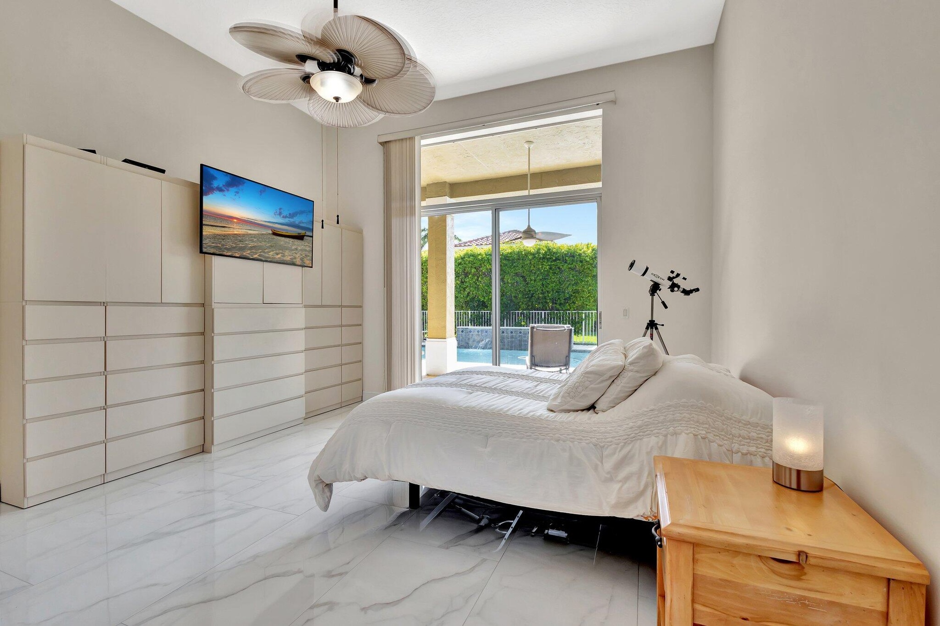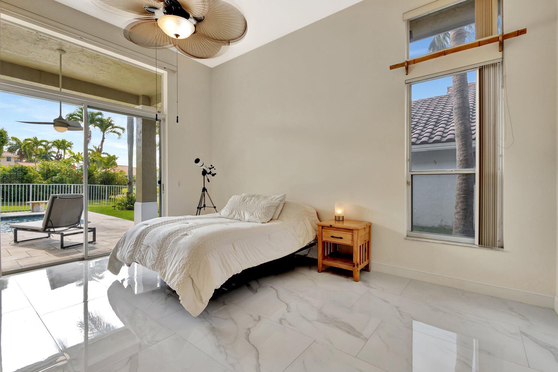 Welcome to your dream home, meticulously upgraded for modern luxury and comfort! This stunning residence boasts soaring ceilings for an airy, expansive feel; imported porcelain tile flooring throughout, creating a seamless and elegant flow. The three fully remodeled bathrooms are spa-inspired retreats, featuring ceiling fans, soothing ambient lighting, and Bluetooth connectivity for your favorite music. Stay comfortable year-round with two newer air conditioning units (2/2022) controlled by Wi-Fi-enabled Nest thermostats, complemented by two recently installed electric water heaters (8/2022) for endless hot water. The outdoor oasis is equally impressive, with a new salt system for the sparkling swimming pool (8/2023) and a state-of-the-art irrigation system with a new water pump to keep the lush lawn vibrant. Landscaping lights and new outdoor ceiling fans enhance the ambiance, while new spotlights and Nest flood lights with camera ensure security and style. The front yard, adorned with unique white stones sourced from New Jersey, adds distinctive charm, and a Ring doorbell provides peace of mind. All of this comfort on one of the community's largest lots. Inside, enjoy the convenience of a new washer and dryer (8/2024), a new dishwasher (8/2024). A dazzling new chandelier elevates the home's sophistication. The garage features a newer door motor (5/2022), and the five-year-old roof offers lasting durability. Amenities include a manned gate, cable, internet, clubhouse, pool, tennis, pickleball, & fitness. This home is a perfect blend of cutting-edge upgrades and timeless elegance, ready for you to move in and make it your own. Come see for yourself why this house isn't just a place to live it's a place to love.