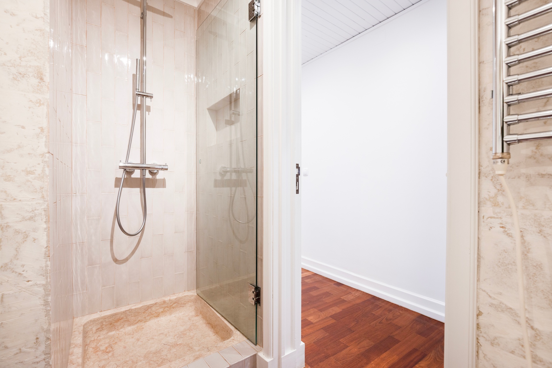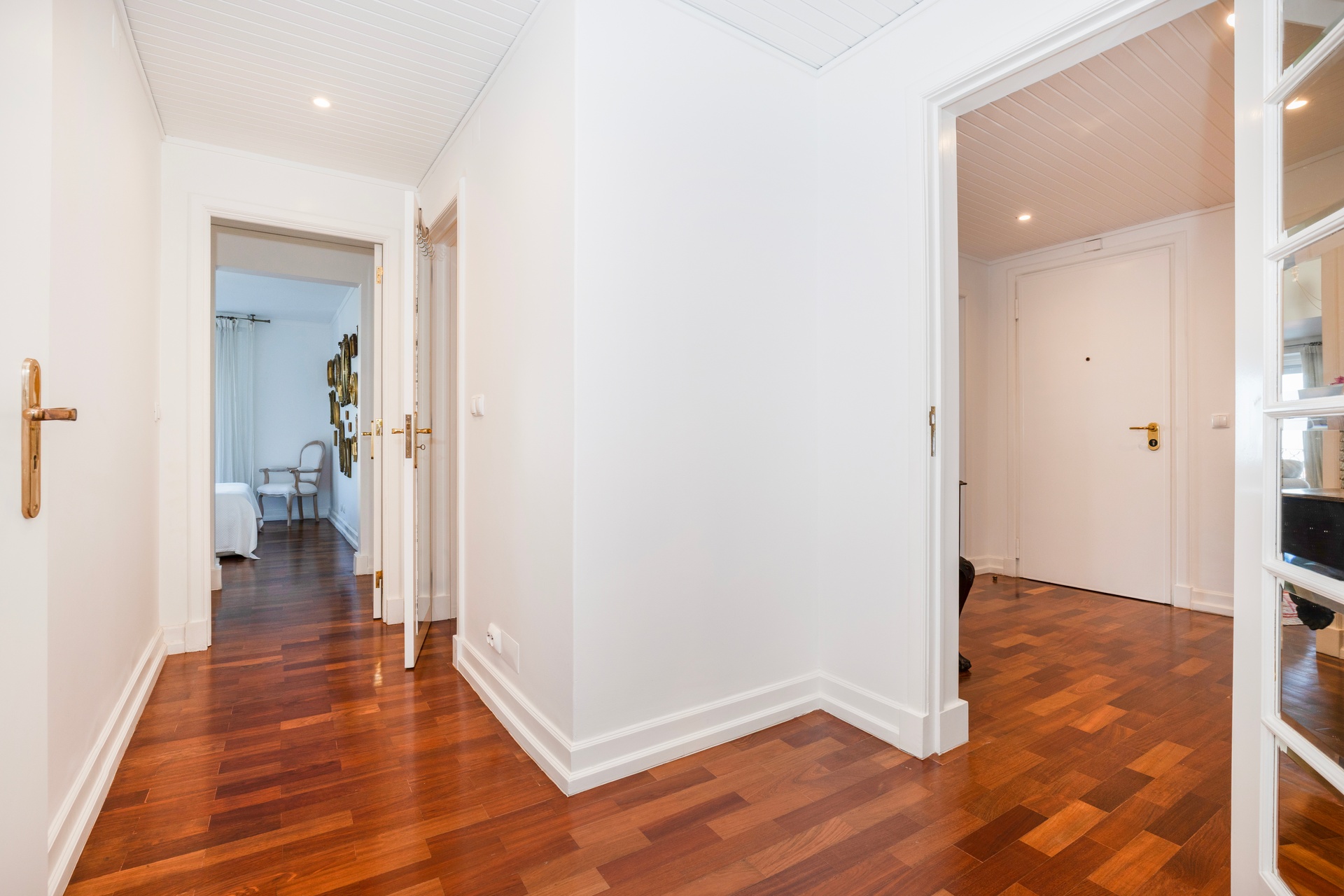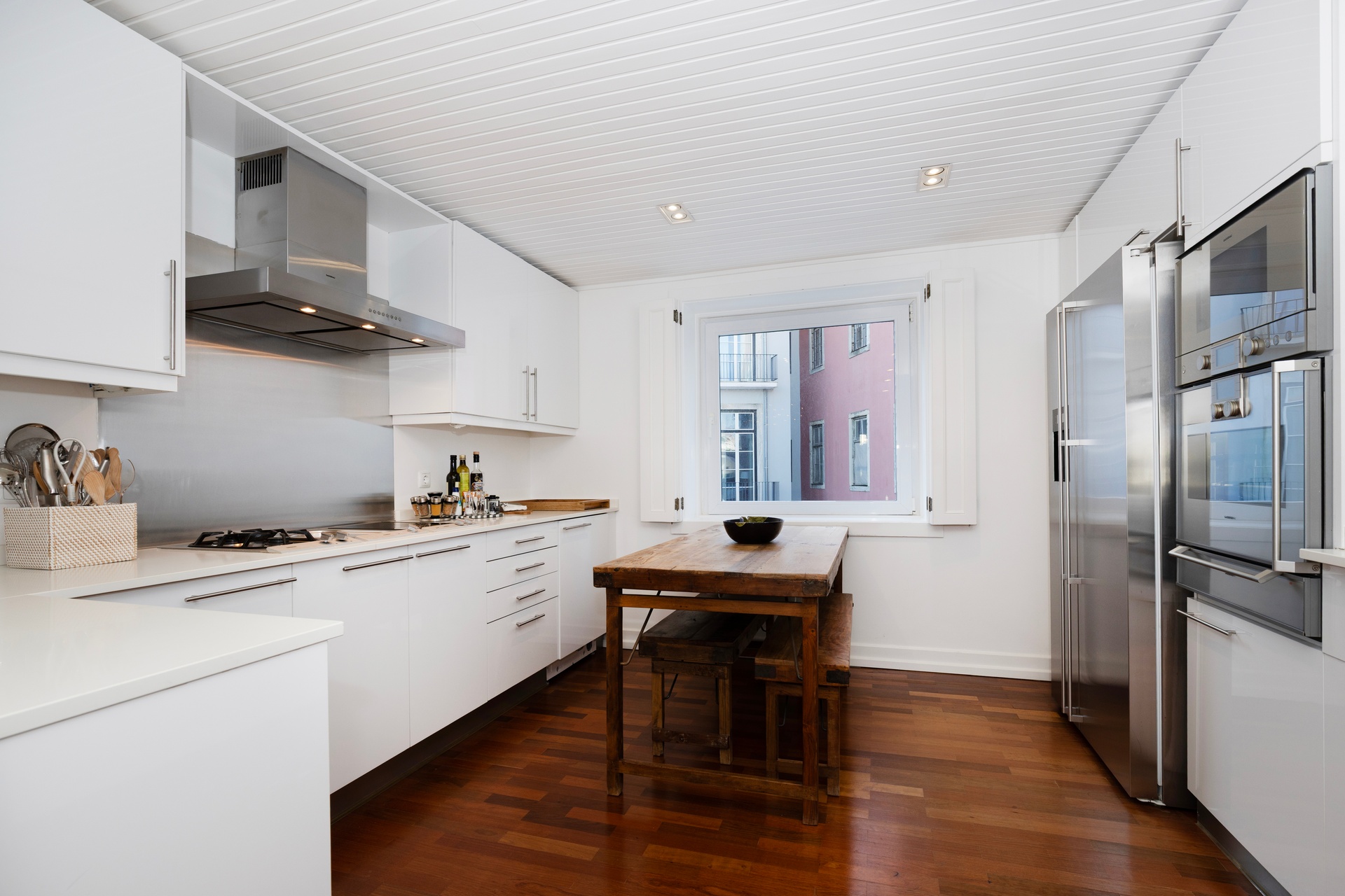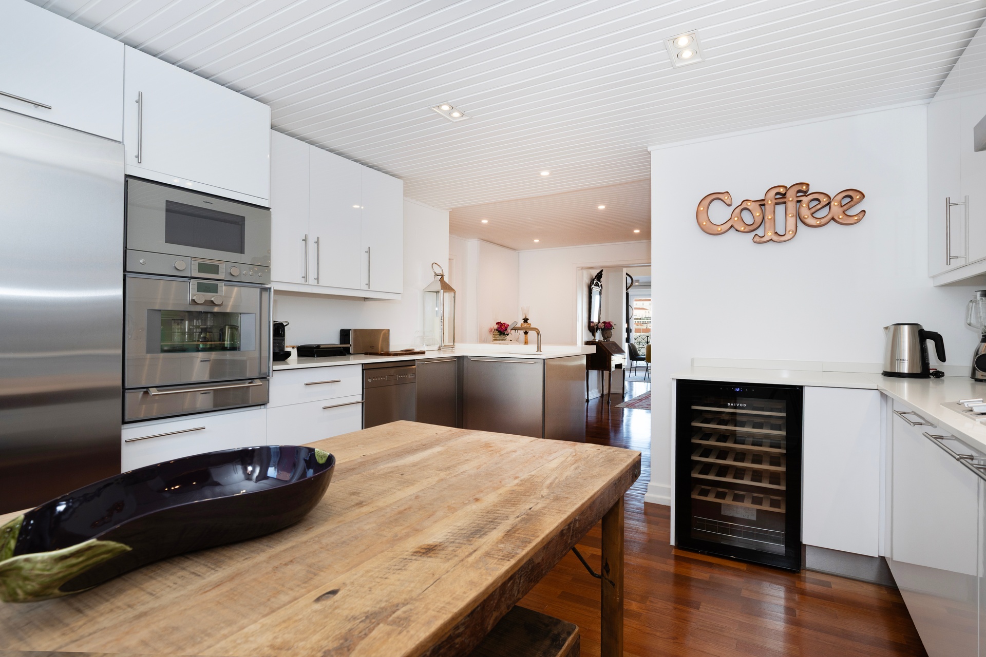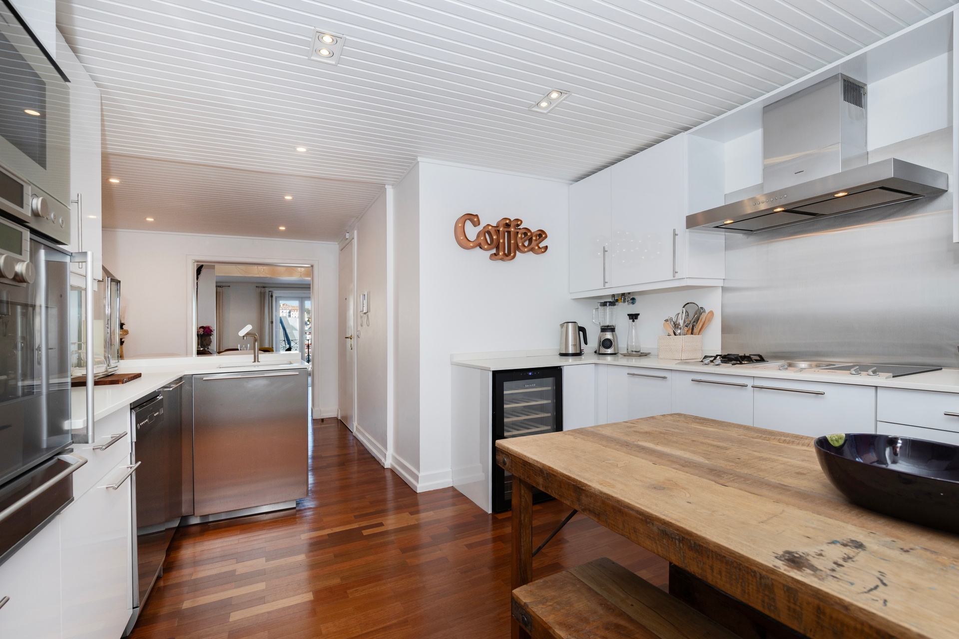 The kitchen is separate from the living area, offering both privacy and functionality. Fully equipped with Gaggenau appliances, it combines performance and refined design. Solid wood flooring throughout the apartment ensures warmth, continuity, and understated elegance.