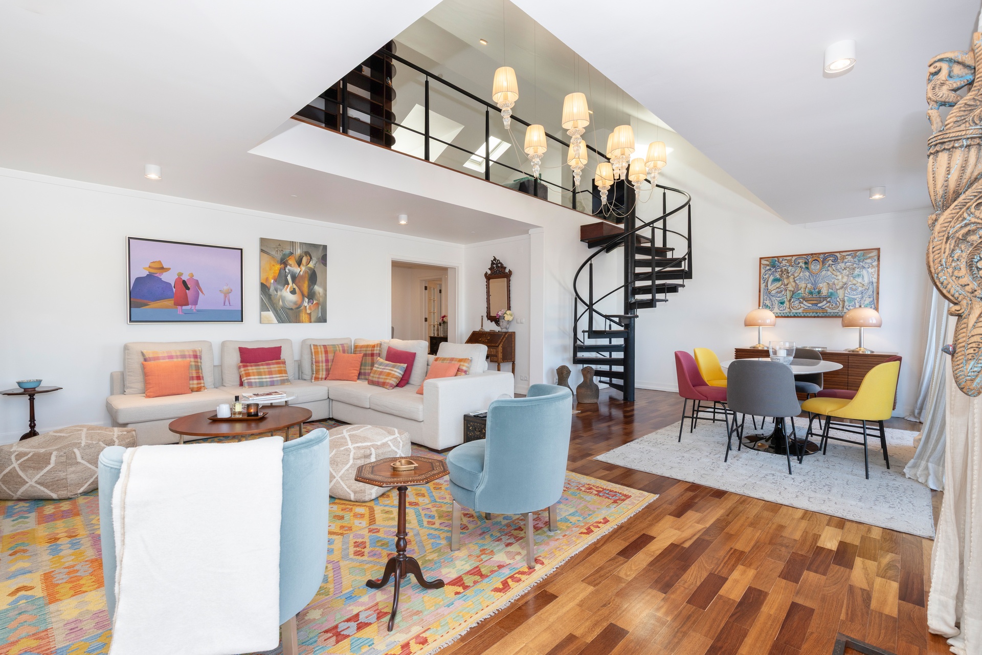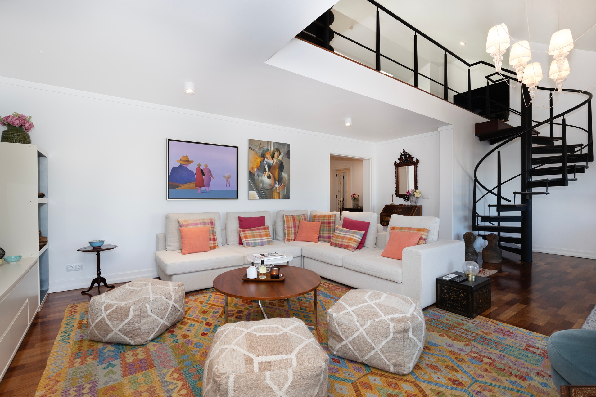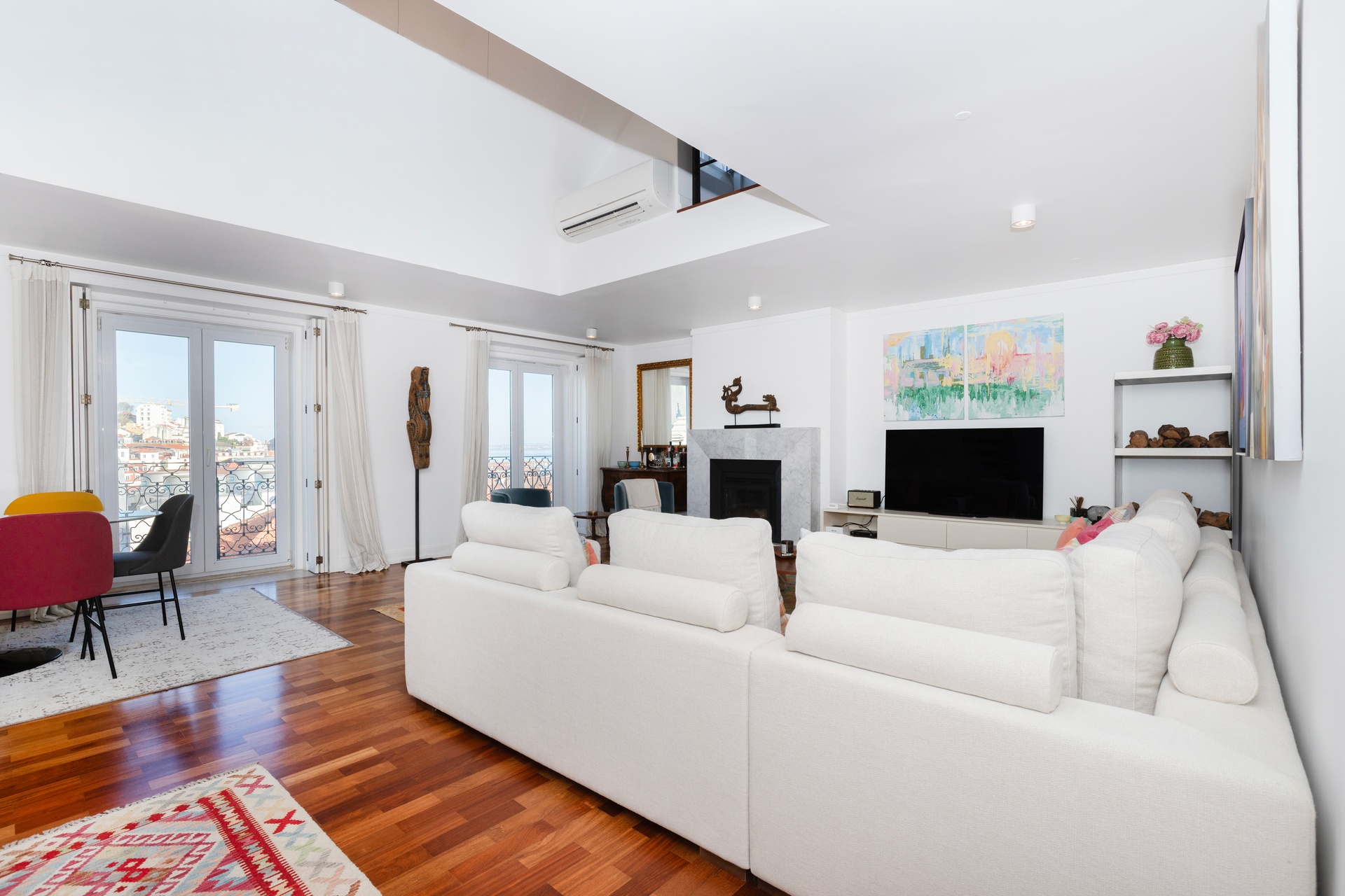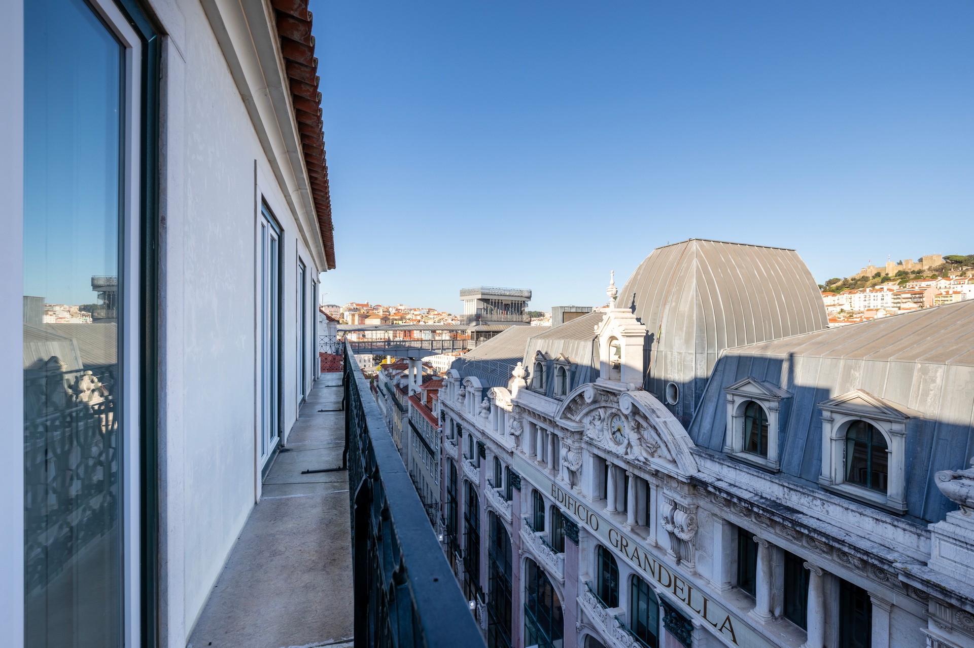 The living room opens onto a continuous balcony running along its full length, a true vantage point over Chiado. During the day, one experiences the vibrant cultural rhythm of historic Lisbon; by night, a serene and intimate atmosphere settles in, with the soft glow of the city lights enhancing the calm.