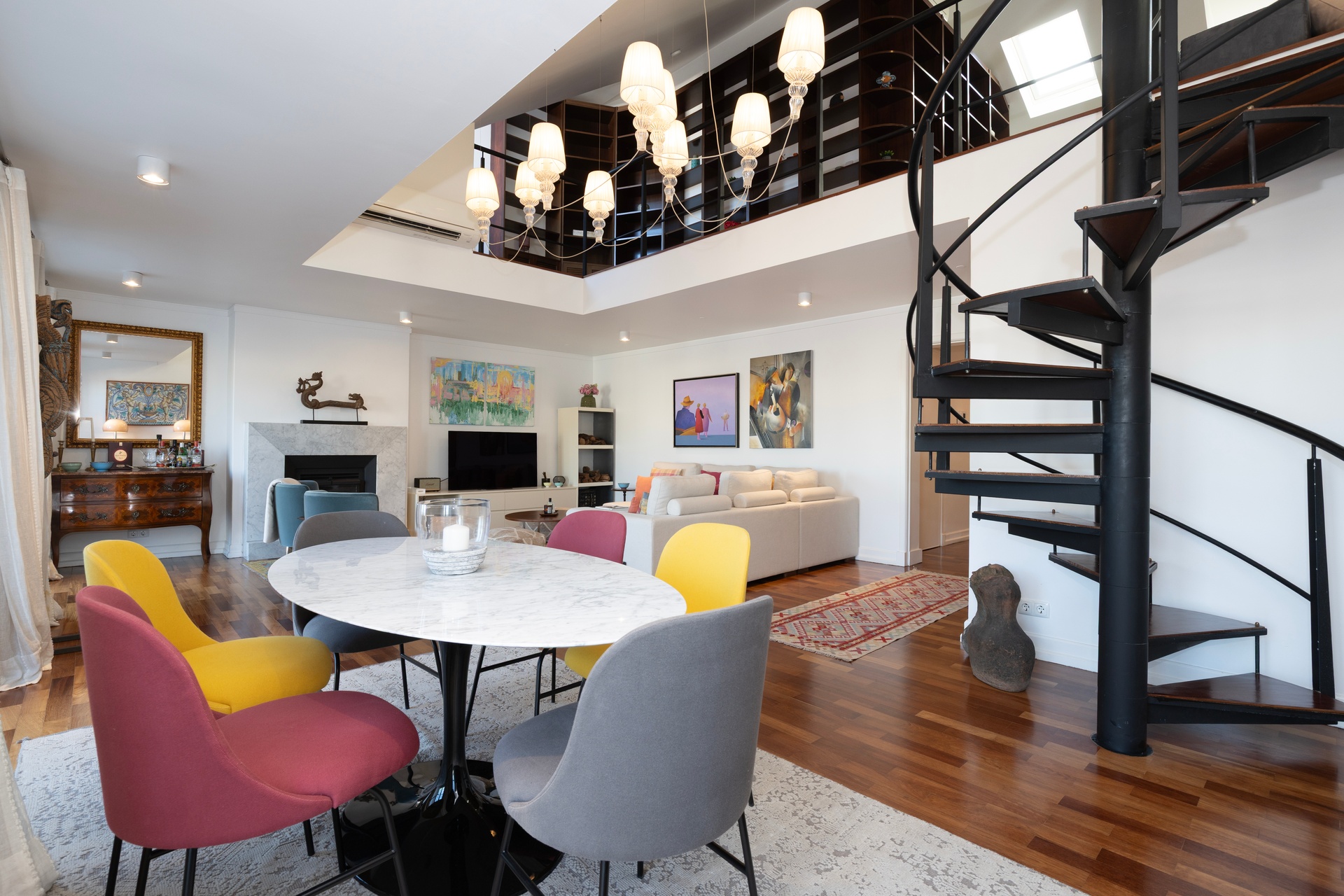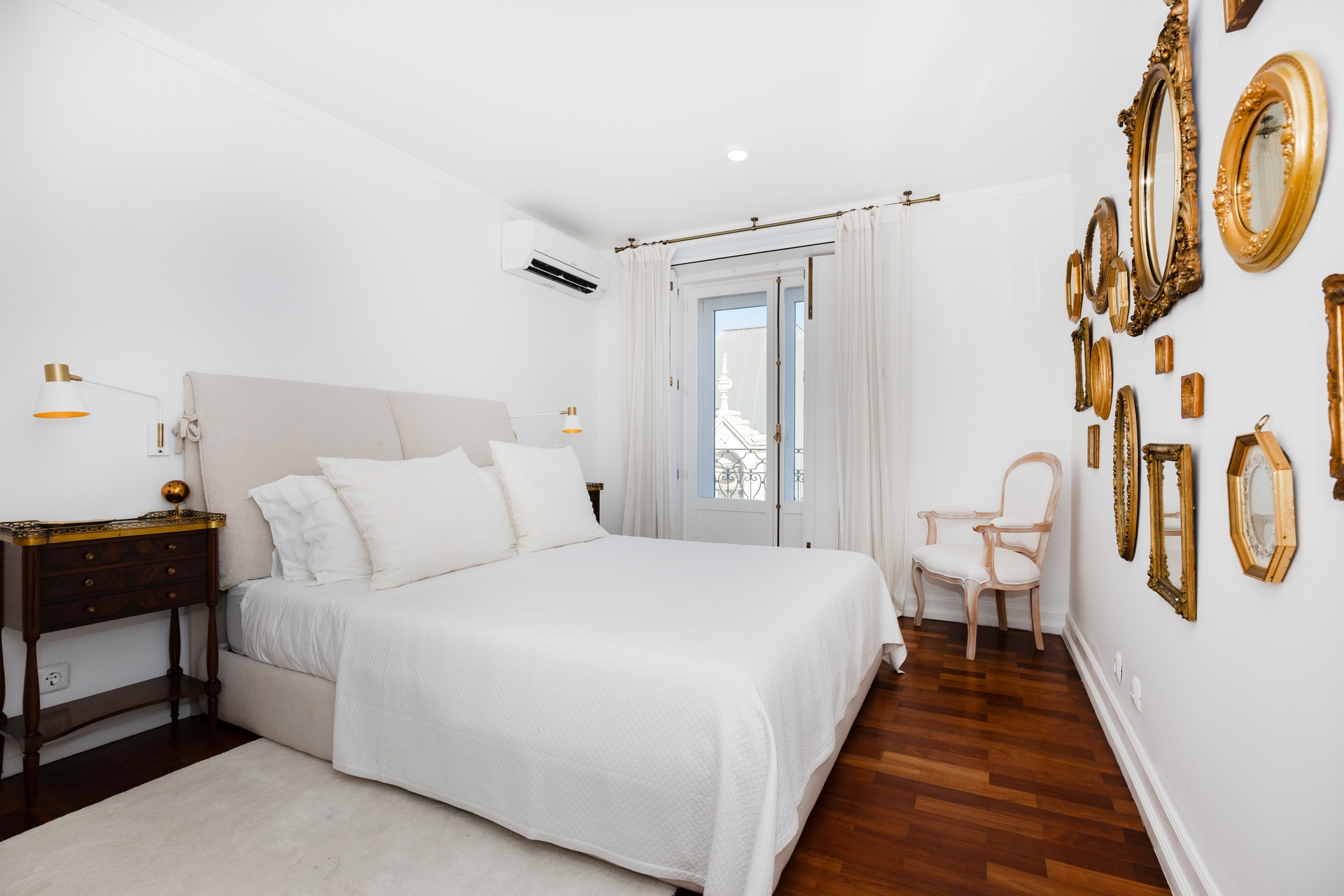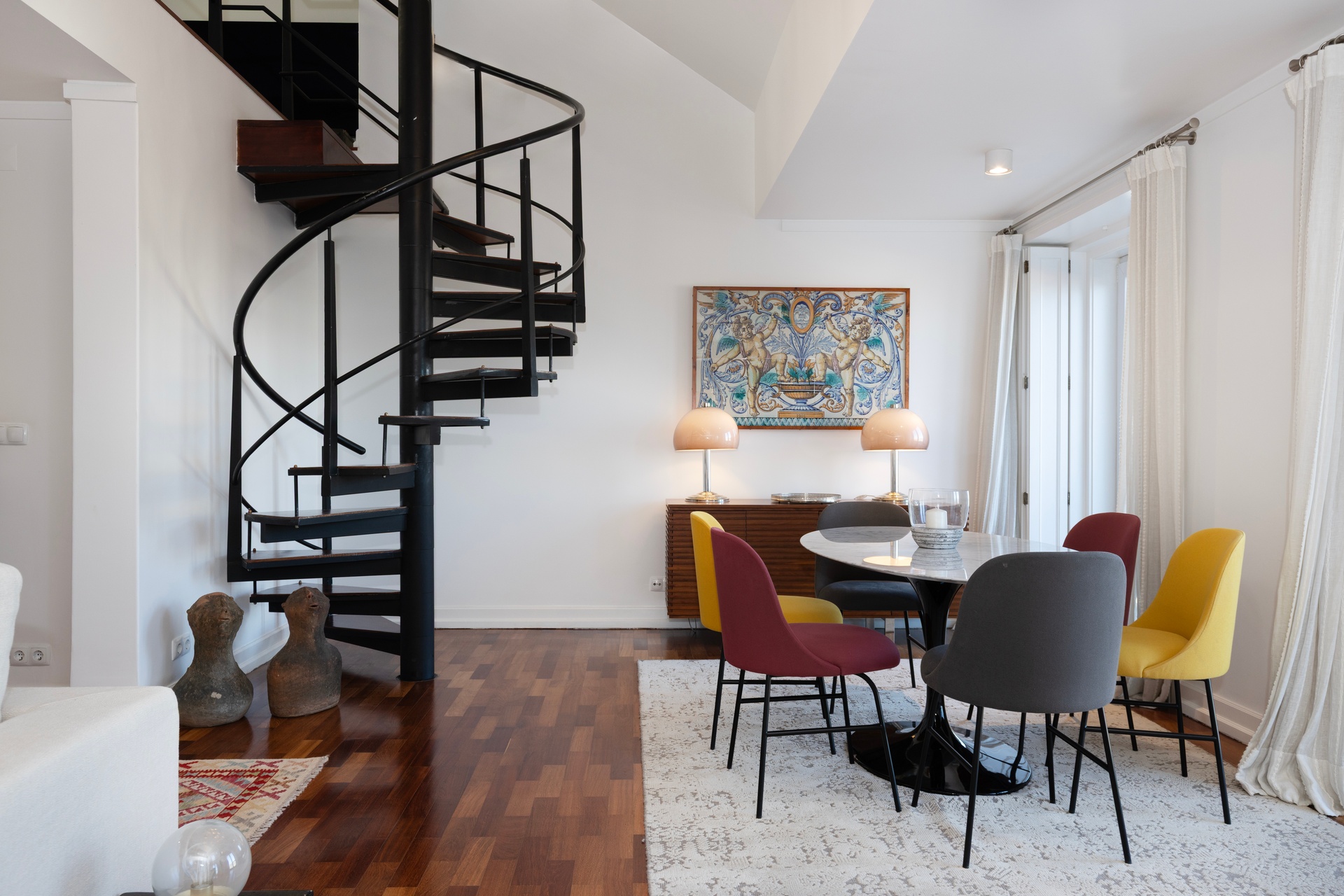 The living room opens onto a continuous balcony running along its full length, a true vantage point over Chiado. During the day, one experiences the vibrant cultural rhythm of historic Lisbon; by night, a serene and intimate atmosphere settles in, with the soft glow of the city lights enhancing the calm.
