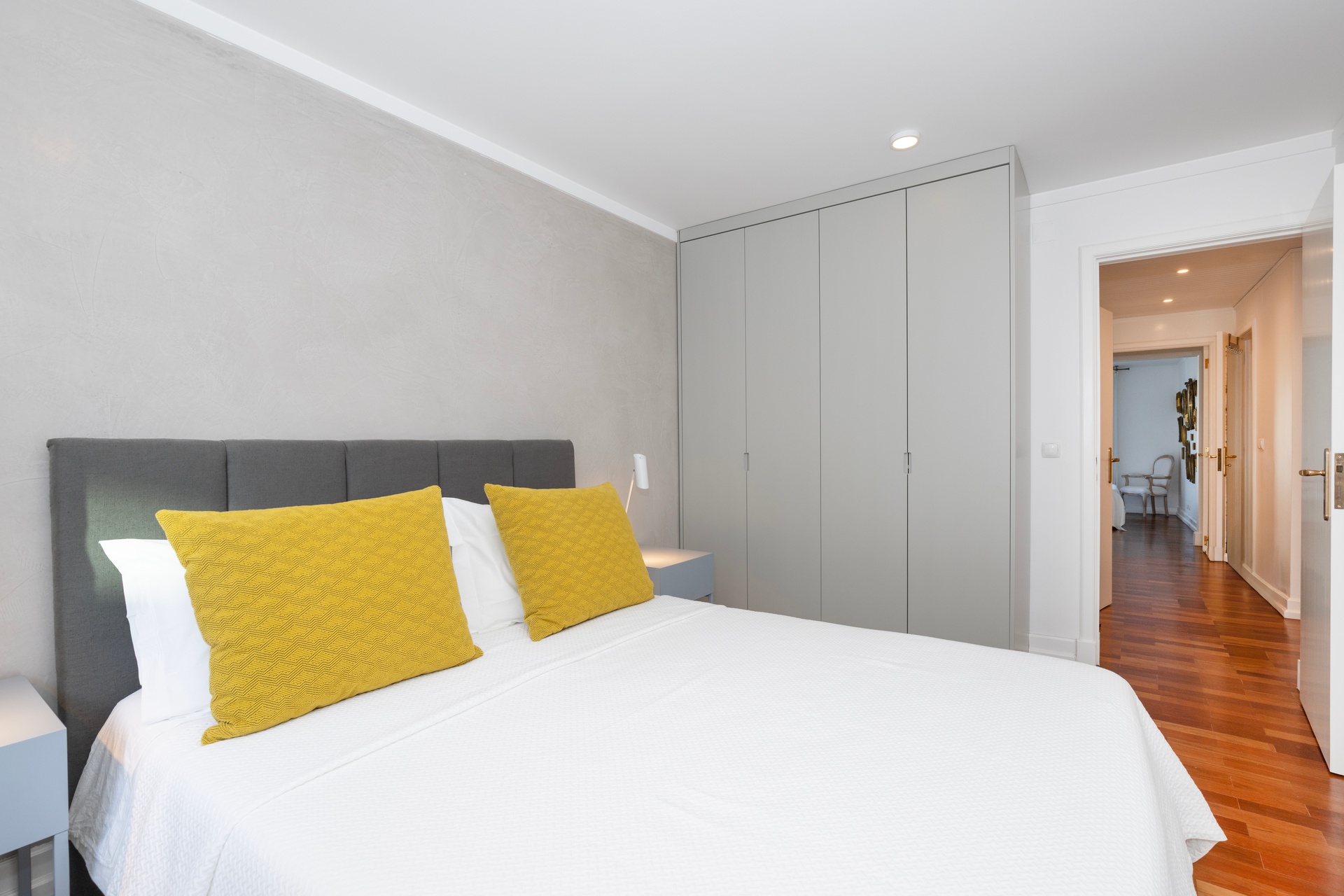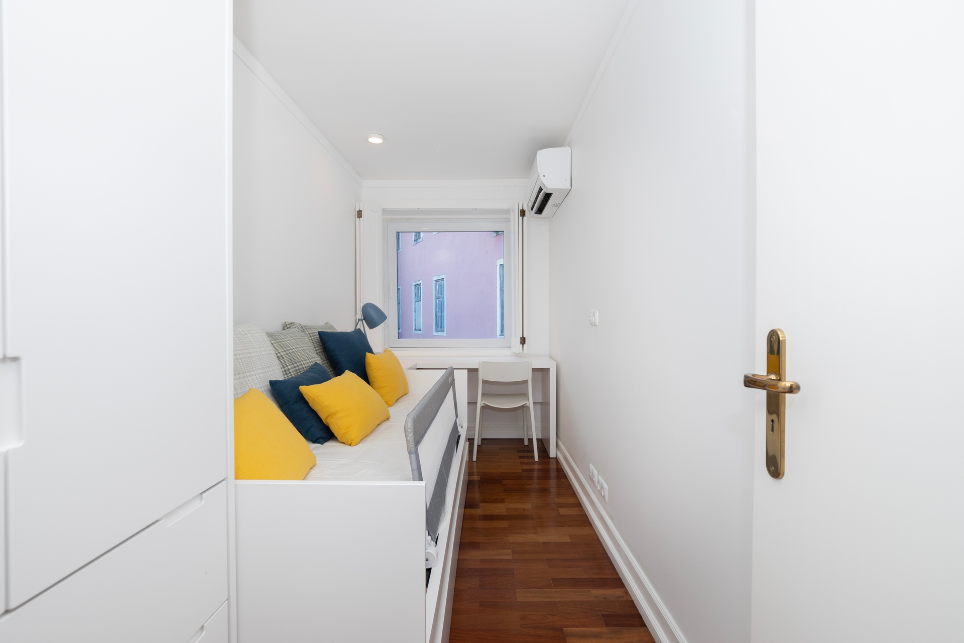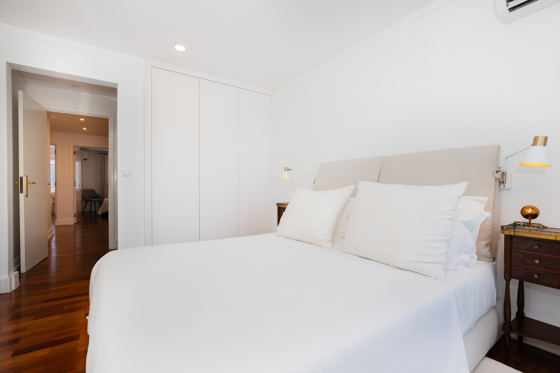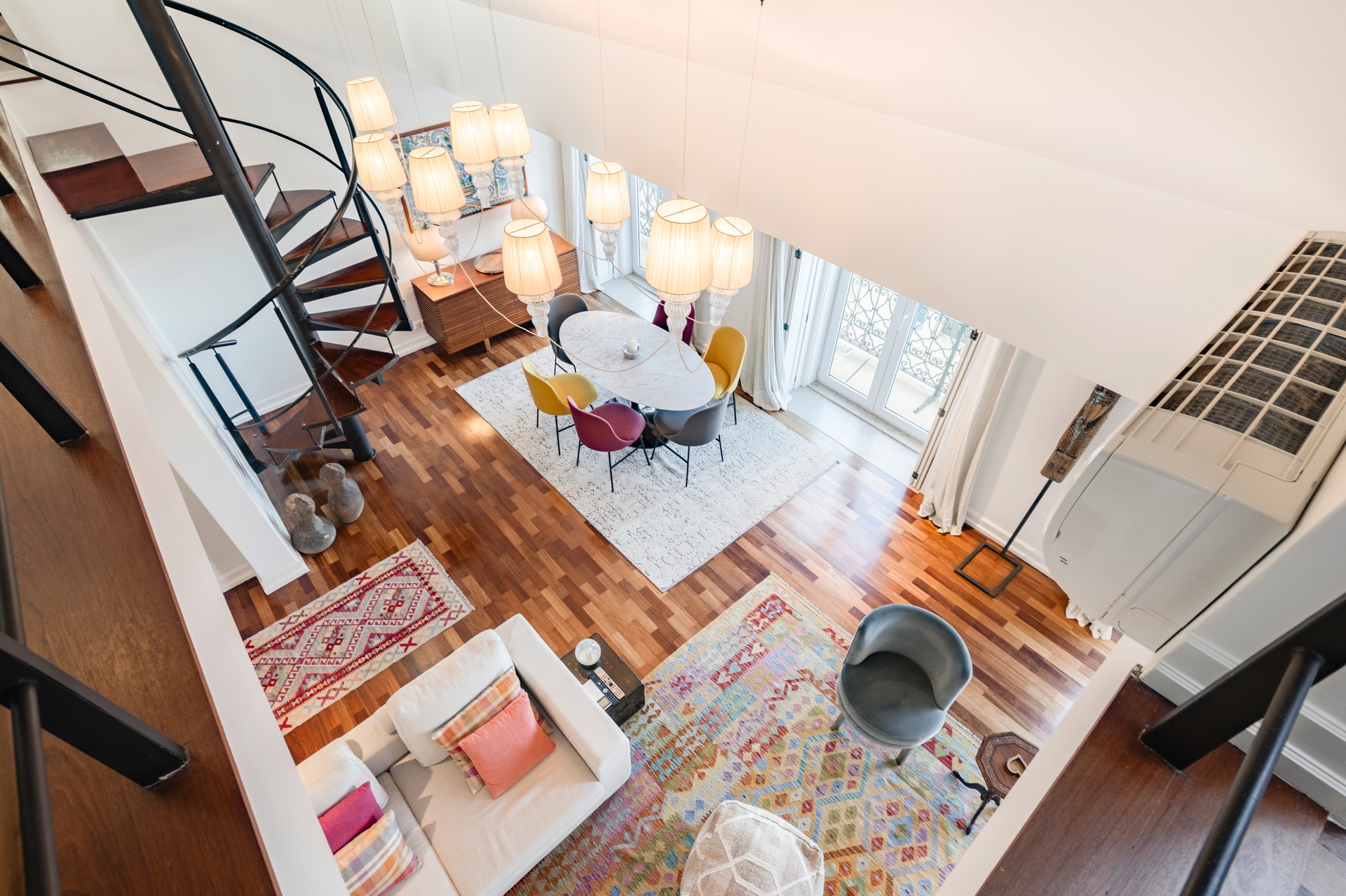 The living room opens onto a continuous balcony running along its full length, a true vantage point over Chiado. During the day, one experiences the vibrant cultural rhythm of historic Lisbon; by night, a serene and intimate atmosphere settles in, with the soft glow of the city lights enhancing the calm.
