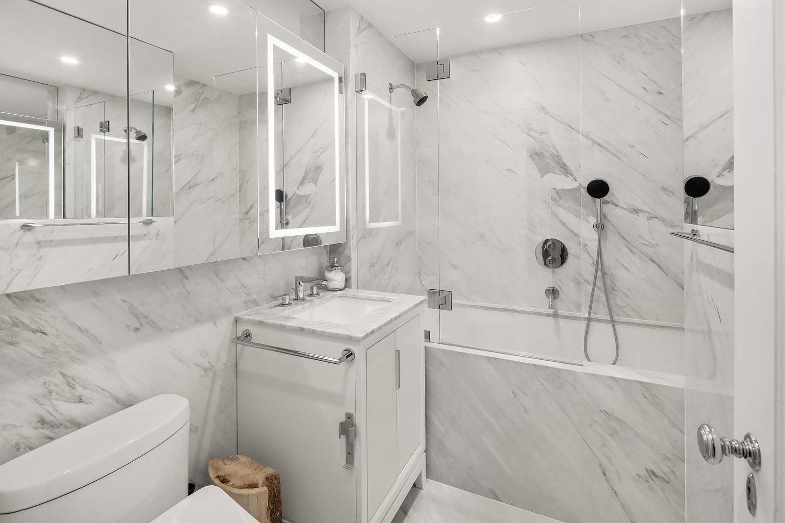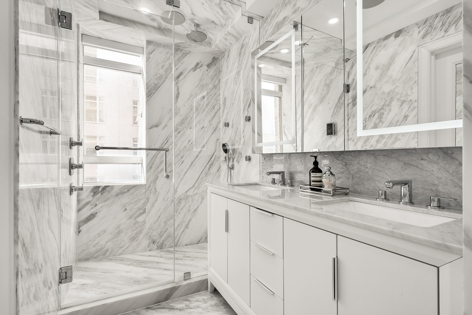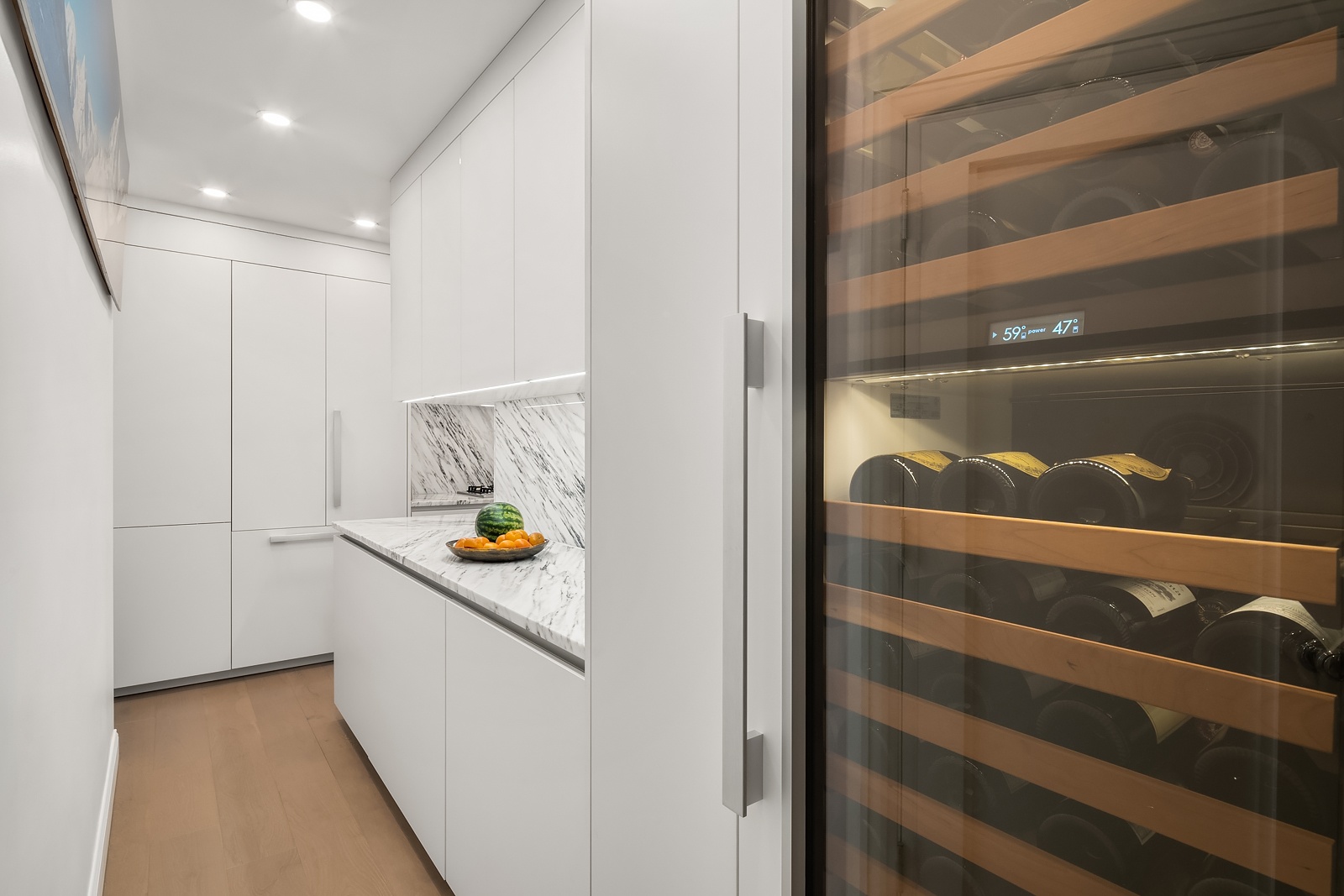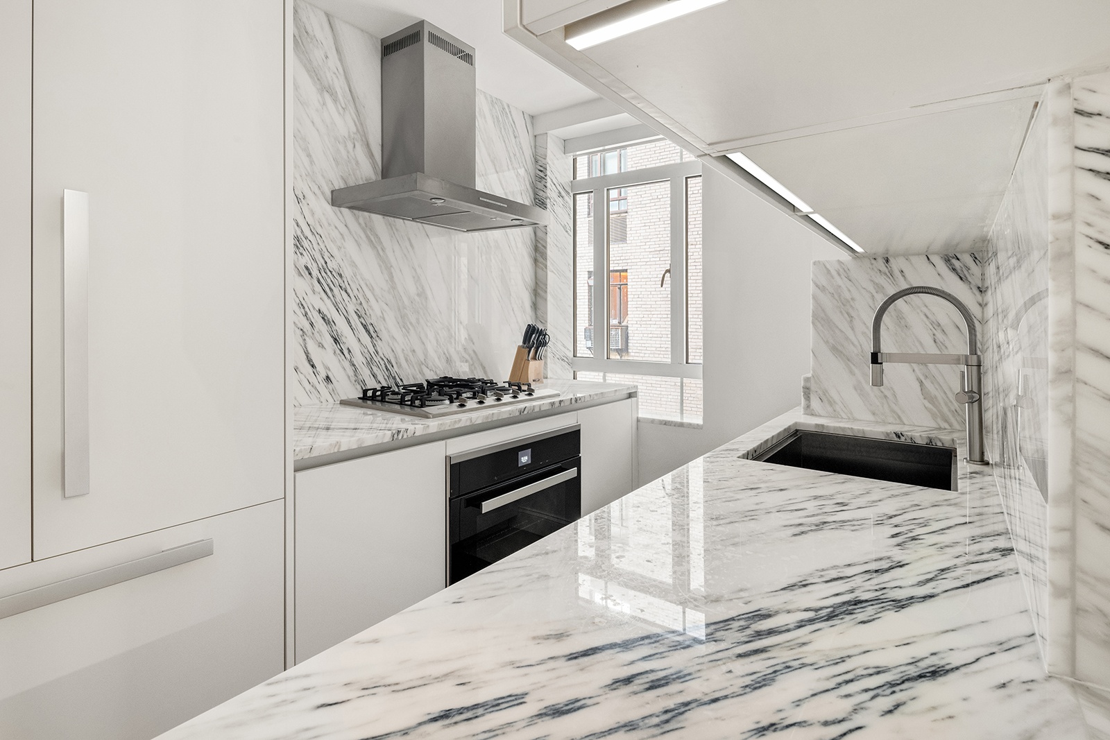 The windowed kitchen is impeccably designed with full marble countertops and backsplash, custom white Poggenpohl cabinetry, and seamlessly integrated full suite of Miele appliances concealed behind matching panels—offering a sleek, cohesive aesthetic with top-tier functionality.