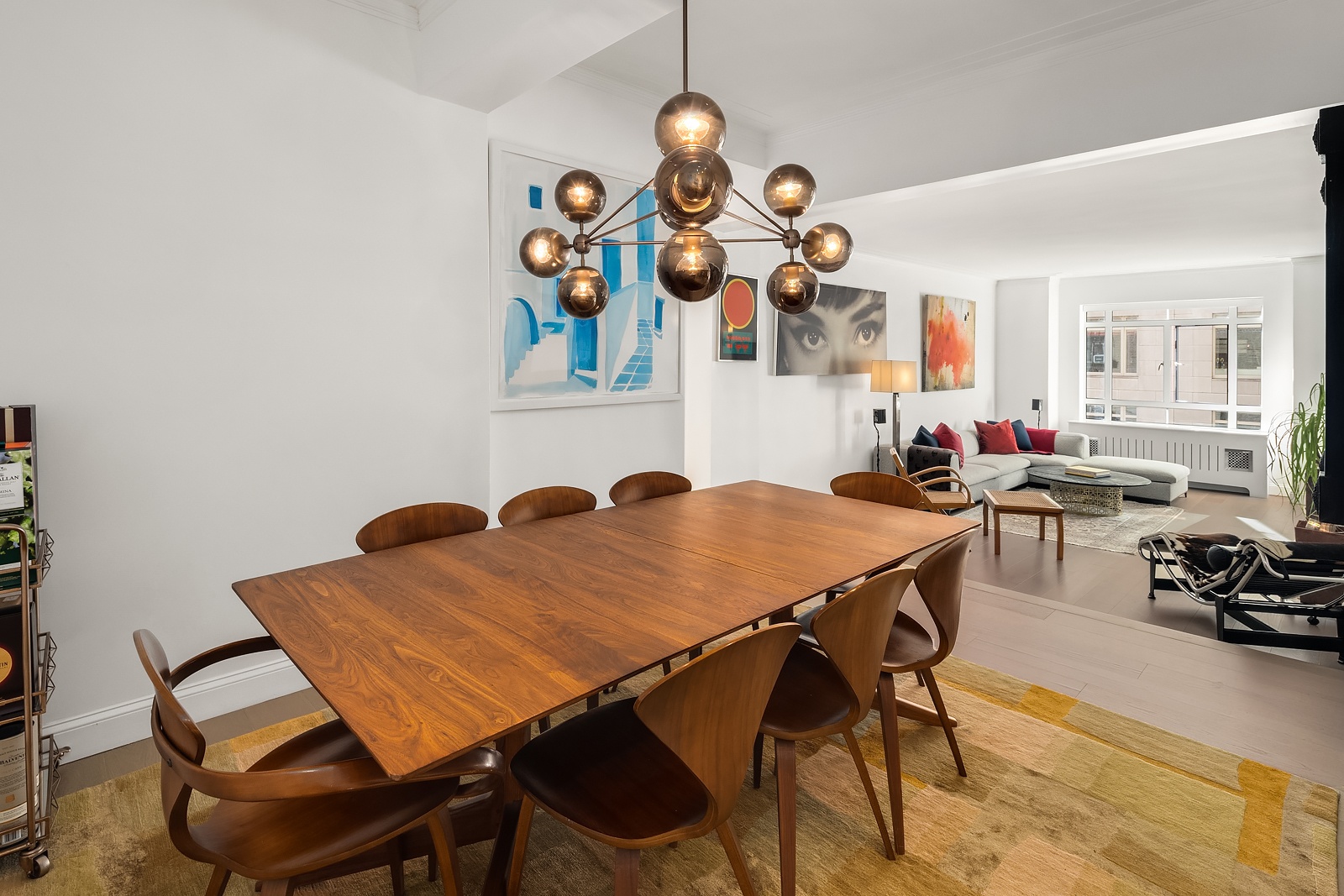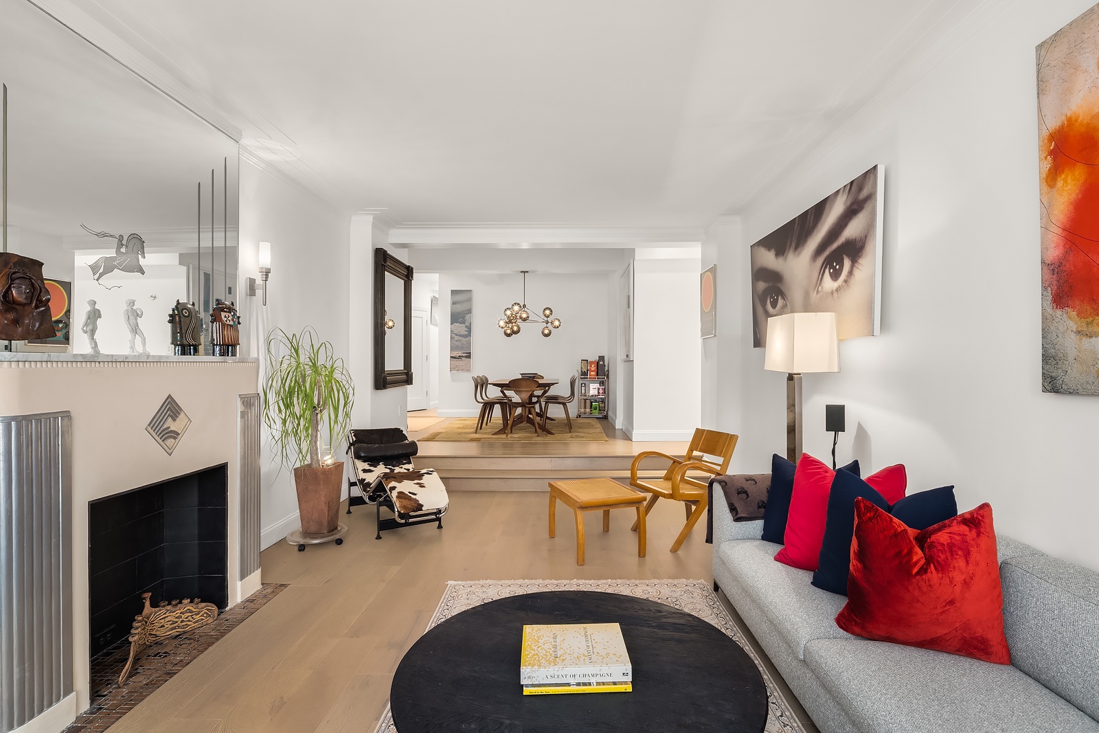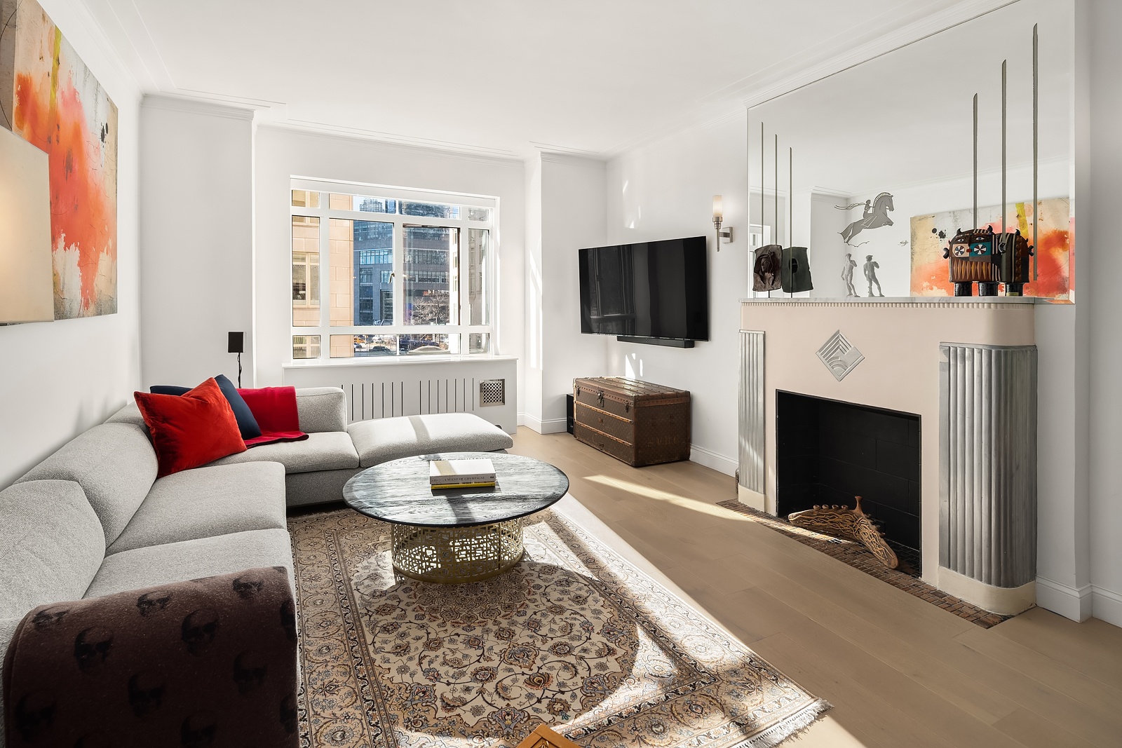 A gracious entry opens to an oversized dining room that flows seamlessly into a dramatic sunken living room with bright southern exposure and a decorative fireplace, creating a warm yet sophisticated setting for both everyday living and entertaining. White oak hardwood flooring runs throughout, complemented by abundant closet space, custom electric blinds in every room, and through-the-wall HVAC units for year-round comfort. In-unit Miele washer and dryer adds modern convenience.