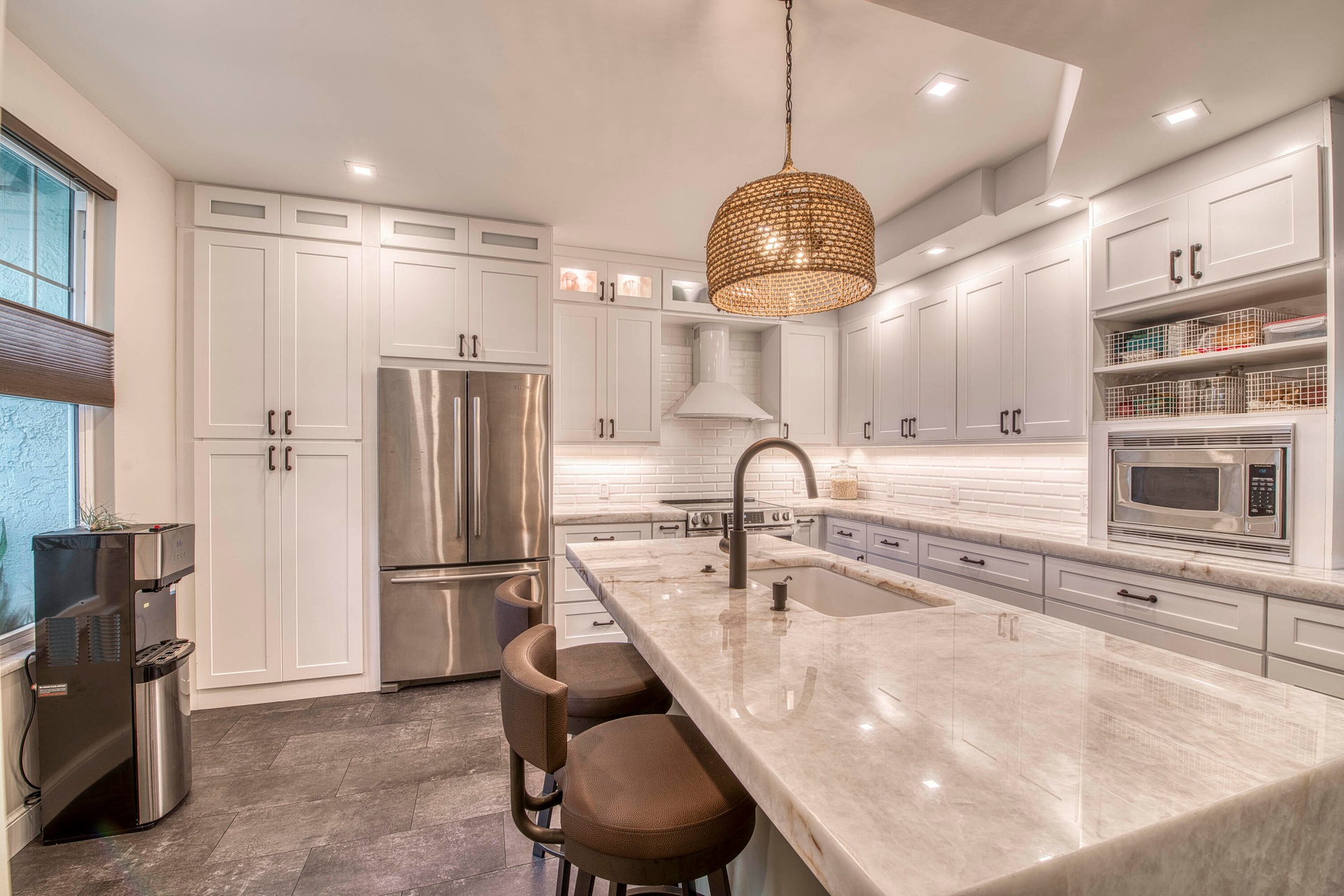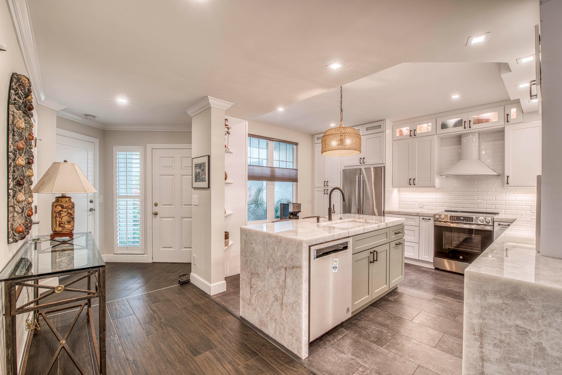 Rarely available, completely updated, and truly move-in ready -- this single-story 3BR/ 3BA home in Sea Colony is just steps from the beach with no stairs anywhere. Offering the ease of one-floor living, this beautifully renovated residence combines coastal comfort with modern upgrades in one of Jupiter's most desirable gated communities. The open layout features wood-look porcelain tile flooring, LED lighting, and a warm, inviting living & dining area centered around a fireplace. The sparkling new custom kitchen showcases quartzite countertops, bright wood cabinetry, vinyl flooring, and stainless-steel appliances including a new stove and dishwasher. Impact glass throughout provides peace of mind and energy efficiency. The primary suite is warm and inviting with porcelain flooring, a custom walk-in closet, and a spa-style bath featuring marble flooring, dual vanities with marble countertops, a soaking tub, and a multi-head shower system. Enjoy ocean breezes from the large, screened patio plus a private screened porch off the primary bedroom. Additional highlights include a one-car attached garage with EV charging station, new AC(2025), plantation shutters, and a brand-new 2025 roof. Sea Colony offers a new state-of-the-art pool and jacuzzi, pickleball courts, fitness center, and a pet-friendly gated environment. Walk to shopping and dining, and just 15 minutes to Palm Beach International Airport.