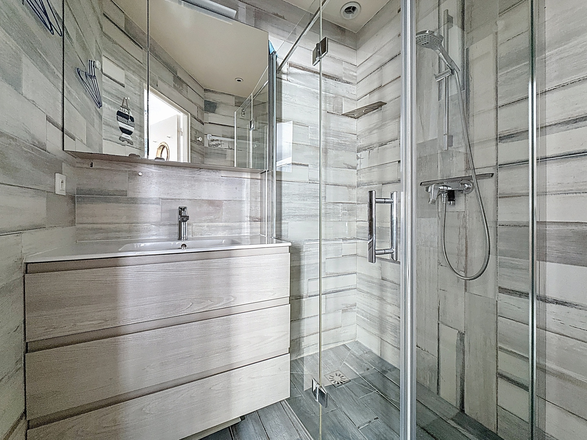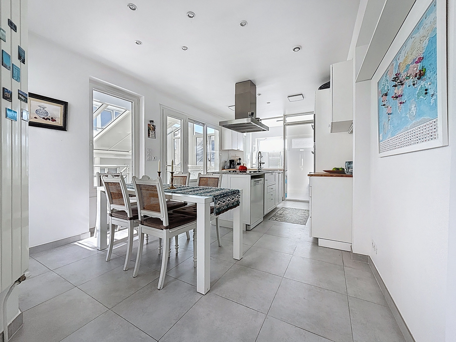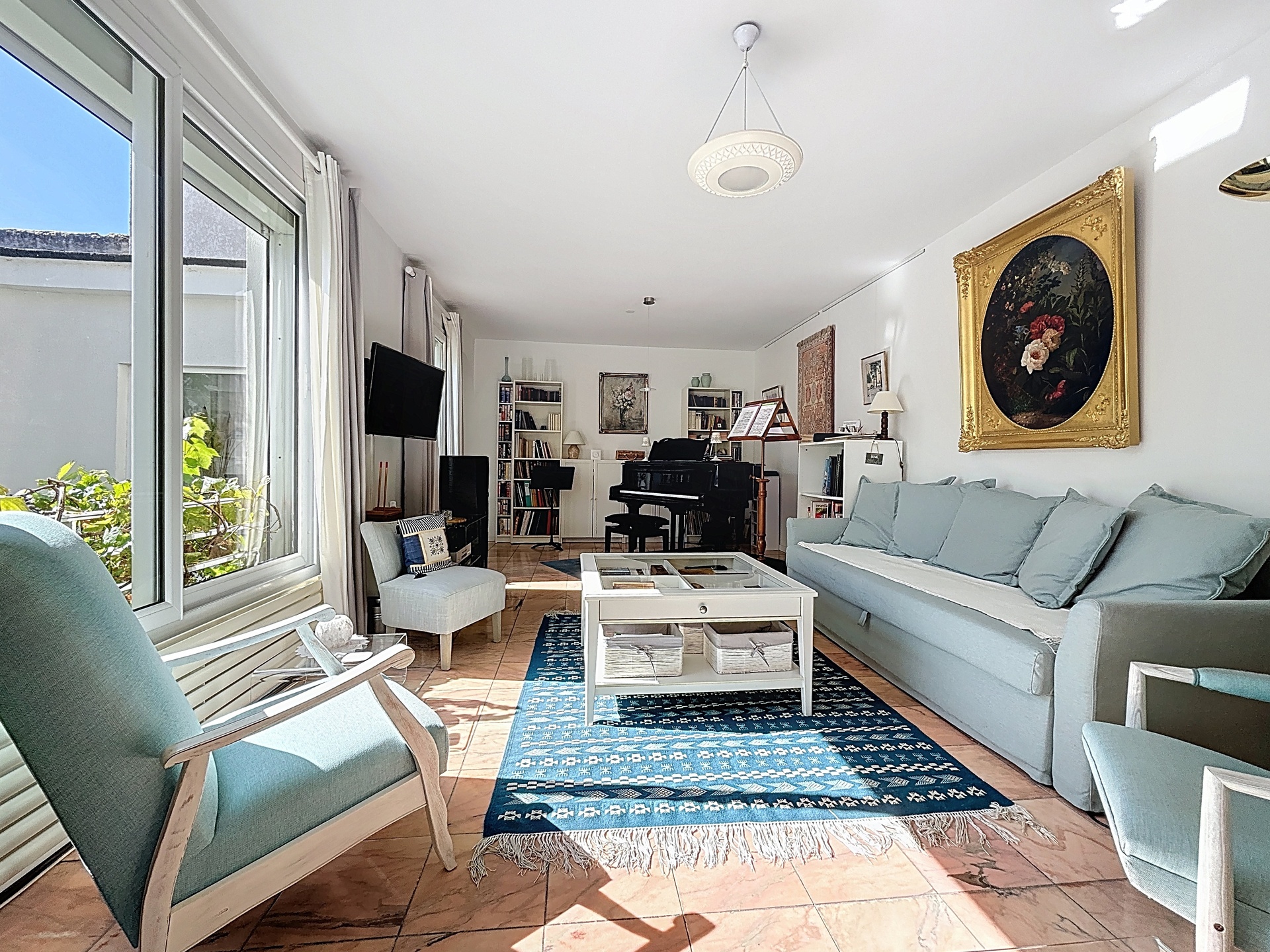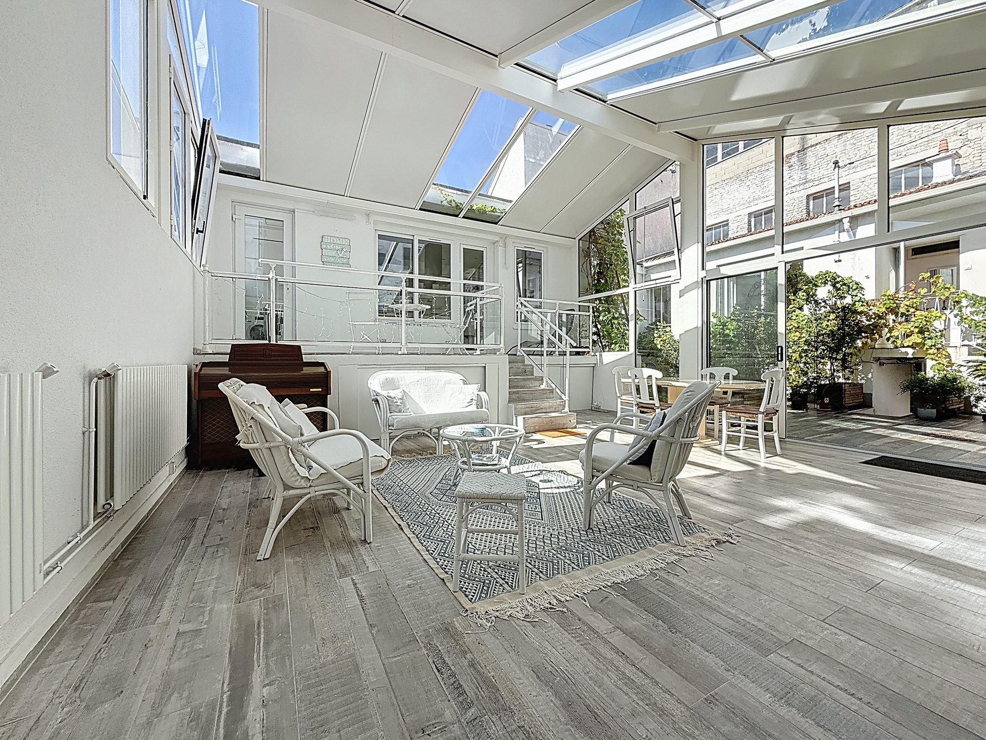 From the entrance, the volumes impress: a vast living room of 26 m2 bathed in natural light, extended by a spectacular glass atrium opening onto a private, landscaped terrace. This double-height conservatory with its expansive glass roof panels and floor-to-ceiling sliding doors creates a seamless connection between interior and exterior living.