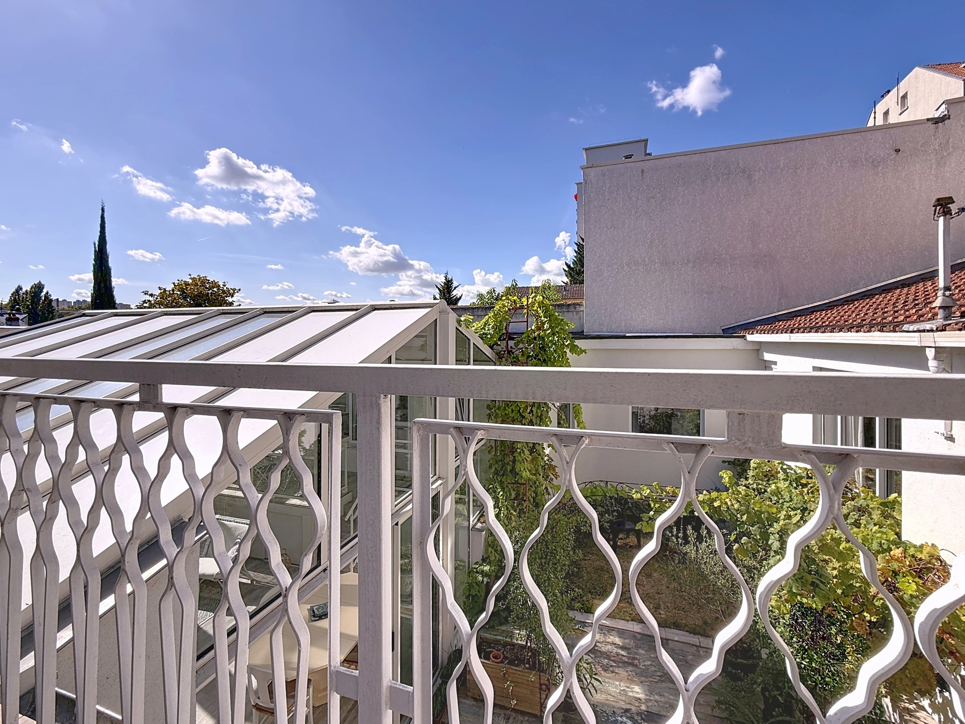 Outdoor highlights include a landscaped terrace and private south-facing garden, creating a true haven of peace. A balcony with ornamental ironwork railings offers charming rooftop views.