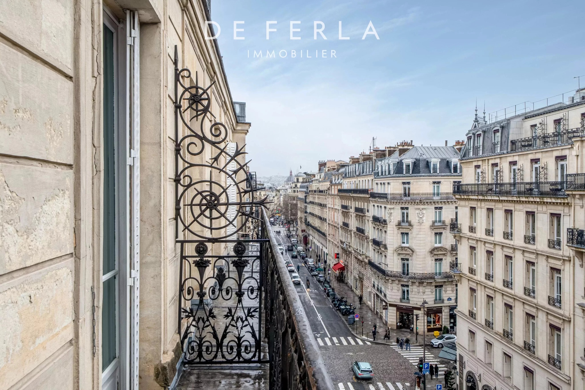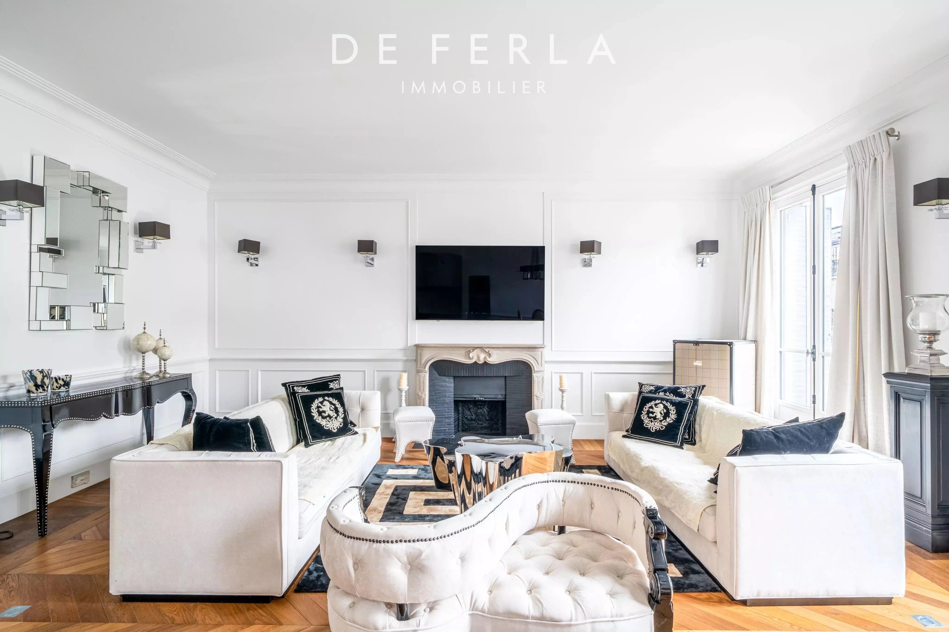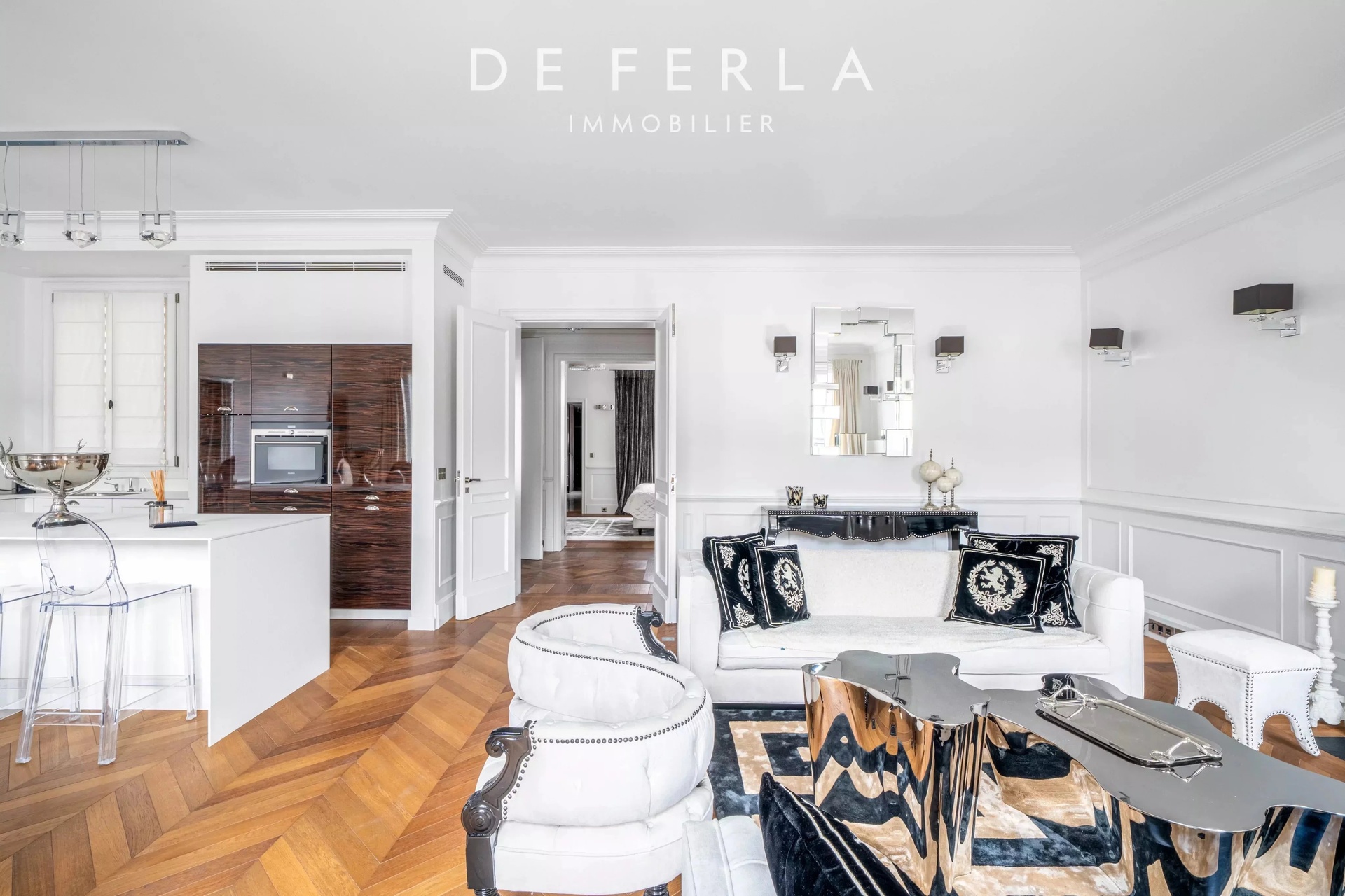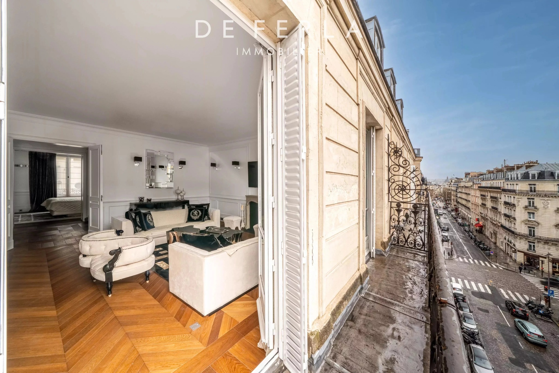 In an elegant Haussmann-style stone building, ideally located just a stone's throw from the George V and Avenue Montaigne, this high-floor apartment has been entirely renovated to a very high standard. It elegantly combines old-world charm with contemporary comfort: herringbone parquet flooring, refined moldings and a period fireplace enhance the volumes. The reception area features a vast living room bathed in light, opening onto a fully-equipped contemporary kitchen with premium finishes. A balcony extends the living space and offers an unobstructed view, rare in the area. The night space includes two bedrooms, each with its own bathroom, and a custom-made dressing room. Upstairs, a bedroom, a laundry room and the mezzanine accommodate an additional bedroom, offering a functional family layout while retaining a refined, uncluttered aesthetic. A rare property in one of the most sought-after locations in the Golden Triangle.