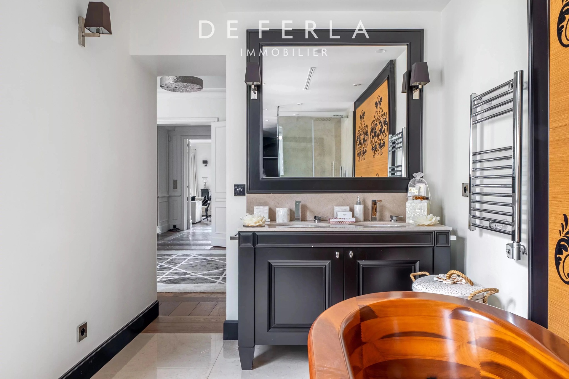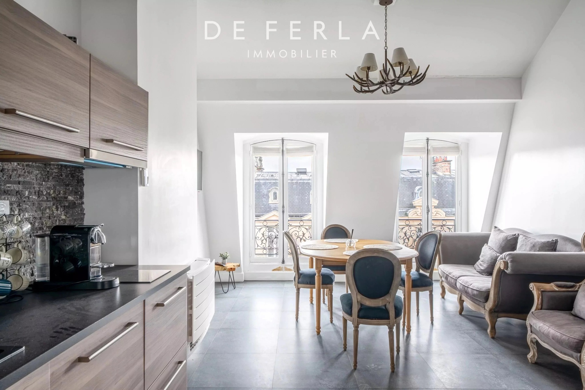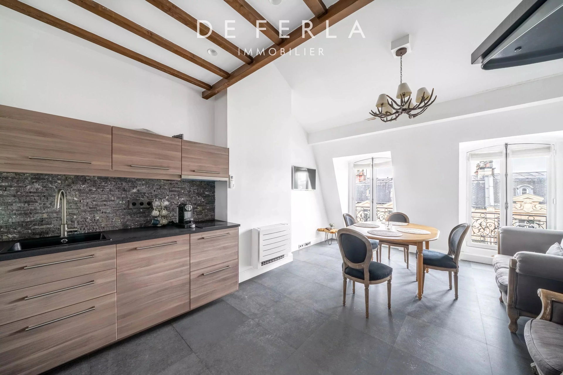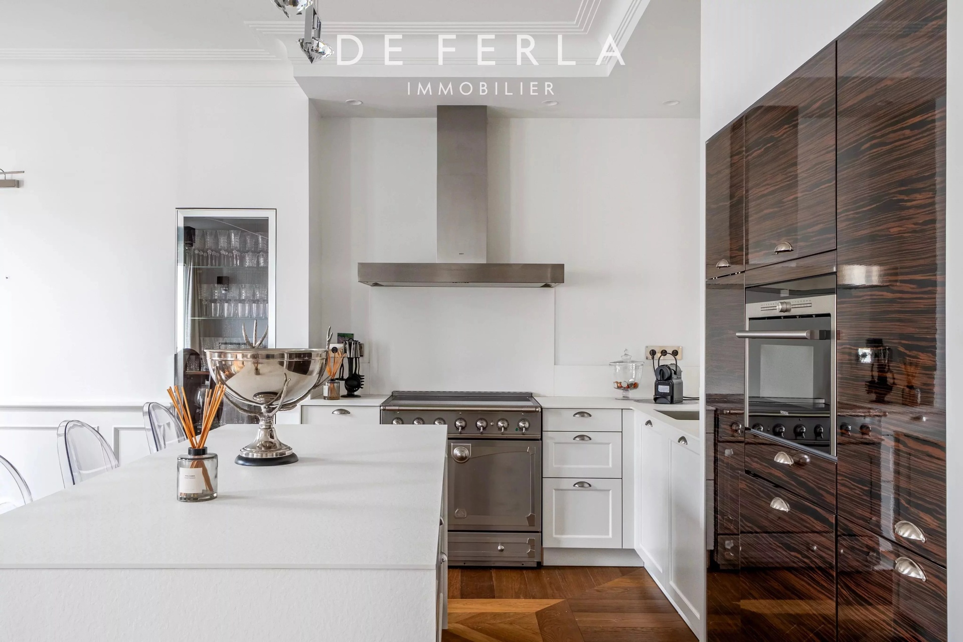 In an elegant Haussmann-style stone building, ideally located just a stone's throw from the George V and Avenue Montaigne, this high-floor apartment has been entirely renovated to a very high standard. It elegantly combines old-world charm with contemporary comfort: herringbone parquet flooring, refined moldings and a period fireplace enhance the volumes. The reception area features a vast living room bathed in light, opening onto a fully-equipped contemporary kitchen with premium finishes. A balcony extends the living space and offers an unobstructed view, rare in the area. The night space includes two bedrooms, each with its own bathroom, and a custom-made dressing room. Upstairs, a bedroom, a laundry room and the mezzanine accommodate an additional bedroom, offering a functional family layout while retaining a refined, uncluttered aesthetic. A rare property in one of the most sought-after locations in the Golden Triangle.
