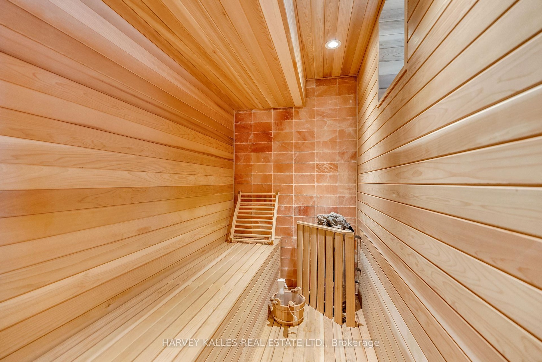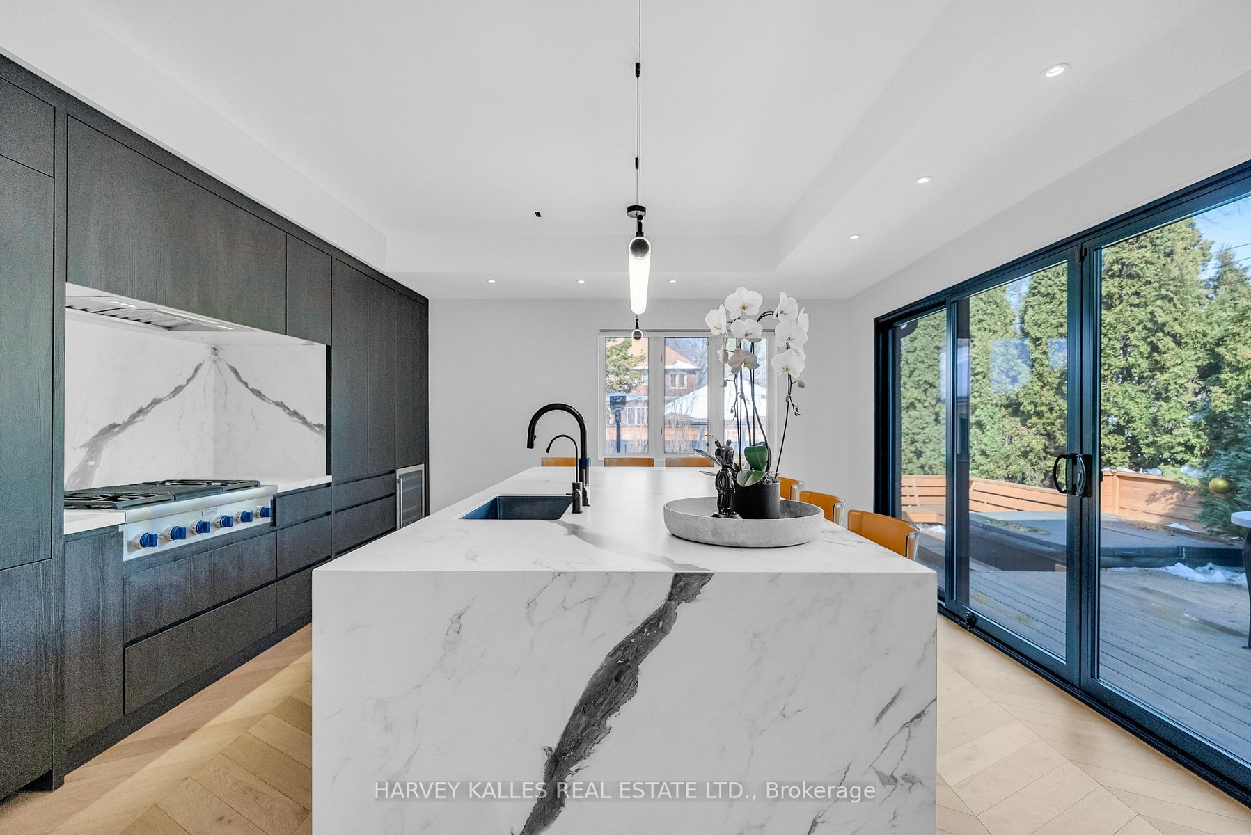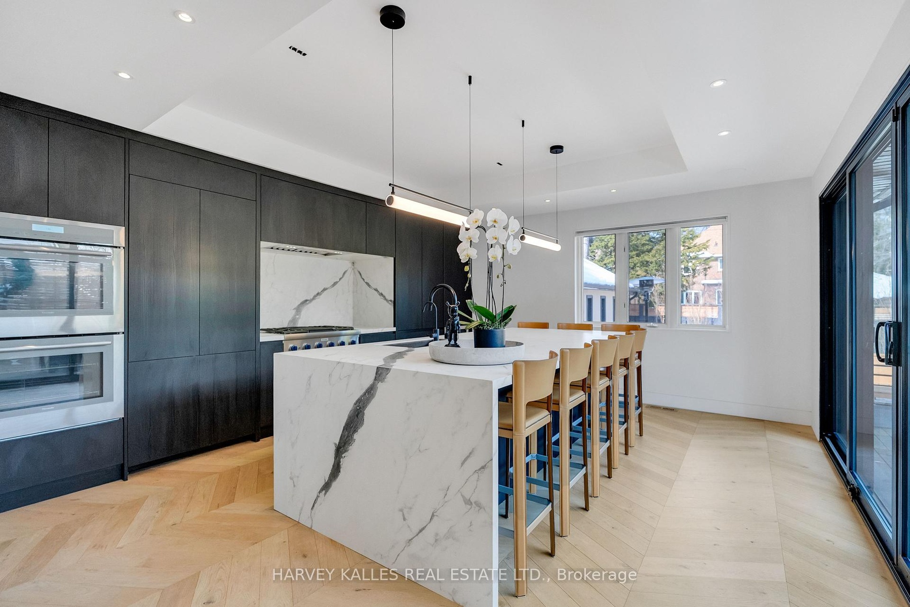 Architecturally striking and filled with natural light, this custom designed home showcases exceptional craftsmanship and warm wood detailing throughout. Fully renovated from the studs, this home blends modern architectural lines with timeless materials, featuring chevron wood floors, cedar accents, recessed trim, and extensive custom millwork. The main level is designed for seamless entertaining and everyday living, with soaring ceilings and expansive sliding glass doors that open to a private dining terrace and outdoor Chef's kitchen, creating a beautiful indoor-outdoor flow. The indoor chef's kitchen is anchored by an oversized island ideal for gathering and entertaining, complimented by integrated appliances, bespoke cabinetry and exceptional storage. Custom built-ins throughout enhance both form and function, while the upper level offers a skylit hallway, impressive ceiling height, and refined architectural detailing. The hotel inspired primary suite includes extensive built-ins and a spa like ensuite with double sinks, rain shower, a stand alone luxury tub and a smart toilet. Two well proportioned secondary bedrooms are thoughtfully positioned and share a Jack- and-Jill washroom, ideal for growing families. The fully finished lower level adds flexible living space with a fireplace, fitness area, cedar sauna with a salt wall, industrial style laundry, and a three piece washroom. A turnkey home where design and livability are perfectly balanced.