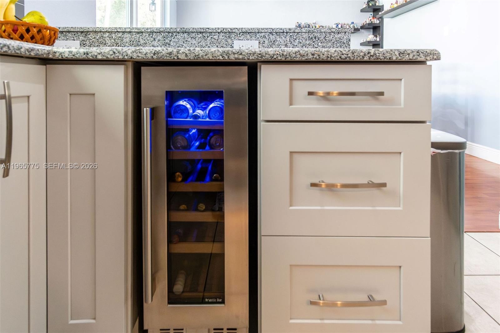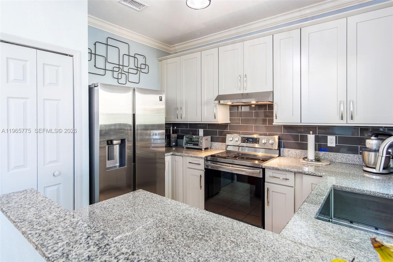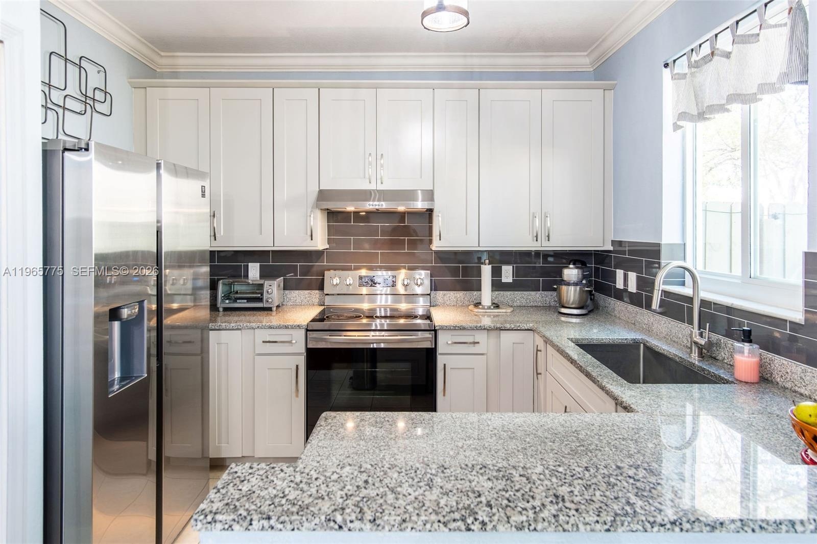 The home features an upgraded kitchen with wood cabinetry, soft-close drawers, stove, refrigerator, wine cooler, garbage disposal, under-sink water filtration system, and included washer and dryer. Crown molding and upgraded lighting are found throughout the home, along with tastefully updated bathrooms.