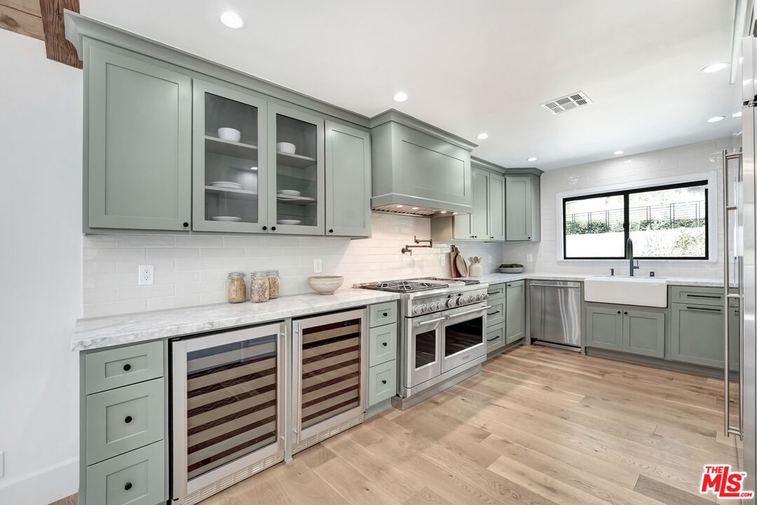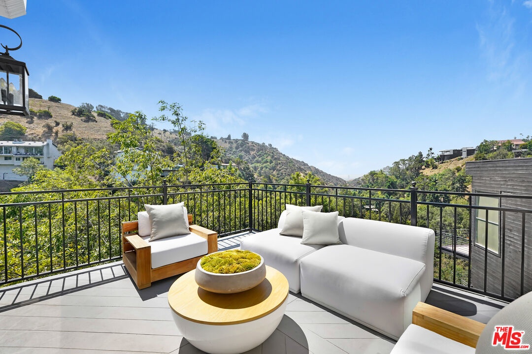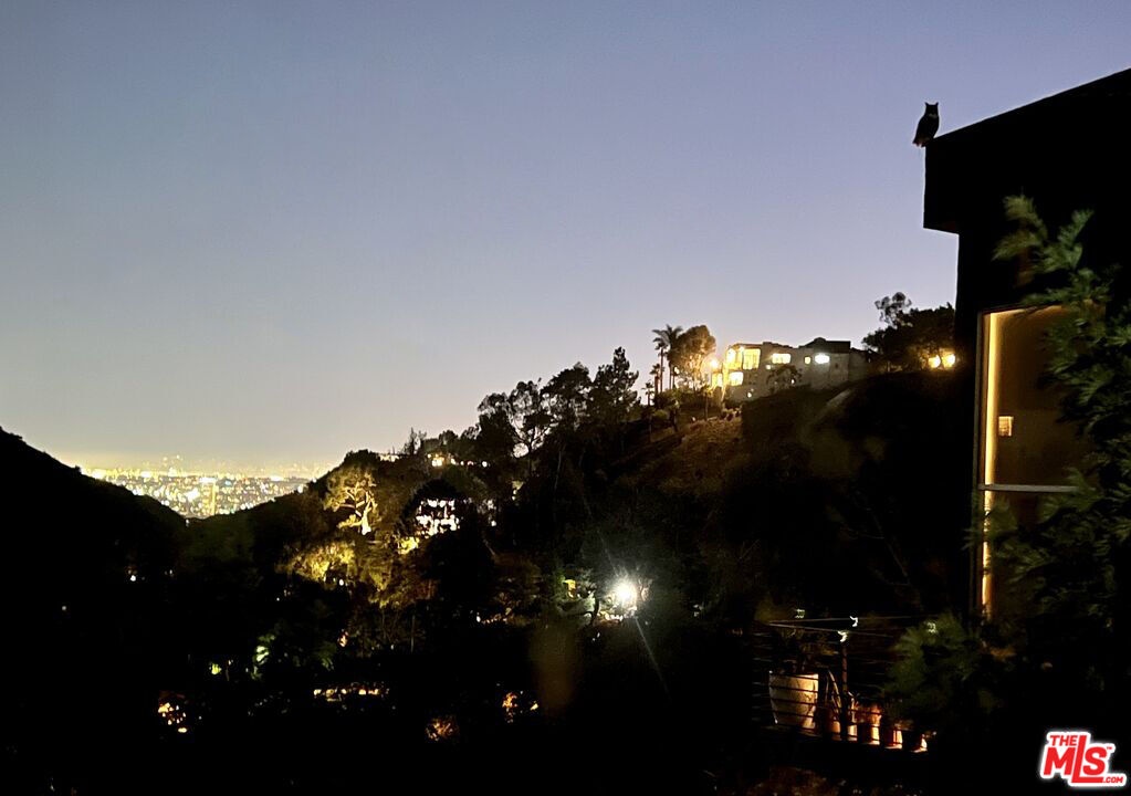 Meticulously renovated home PLUS a separate, stylish bonus unit! Breathtaking Panoramic city and canyon Views just minutes from the famous Sunset strip- the pictures DO NOT do the views justice. Making this home even more exceptional is its expansive quarter-acre double lot. The home features vaulted ceilings, wood floors, two fireplaces, new windows, new roof, and an upgraded electrical panel wired for an electric vehicle charger. Additional highlights include a laundry room, ample storage, a two-car attached garage, and much more. The chef's kitchen boasts a high-end suite of GE Monogram appliances, built-in wine storage, an outfitted pantry, Carrera marble countertops, and beautiful custom cabinets. The primary suite is a private sanctuary on its own floor, offering views from every window, a custom walk-in closet, sitting room with city and canyon views, private office or nursery, additional closet, plus a spa-inspired en-suite bathroom featuring dual vanity sinks, Carrera marble counters, designer polished nickel finishes, freestanding soaking tub, and spacious shower. *Bonus* a separate suite below the main home with its own private entrance, wine bar, living/dining area, full kitchen, bathroom, and laundry ideal for guests, creative/office space, or a possible income opportunity. Multiple decks and a tiered backyard offer outdoor entertaining space with a barbecue area, seating and dining areas overlooking the relaxing sounds of the creek that flows at the foot of the property. Truly an exceptional opportunity to live in peaceful tranquility in a modern, sophisticated home close to several hiking trails, and with easy access to freeways. Advertised square footage is an estimate, and reflects the combined total of both home and bonus space. Buyer to verify all details and measurements to their own satisfaction as broker and agents do not represent or guarantee the accuracy. A rare opportunity and true Hollywood Hills retreat!