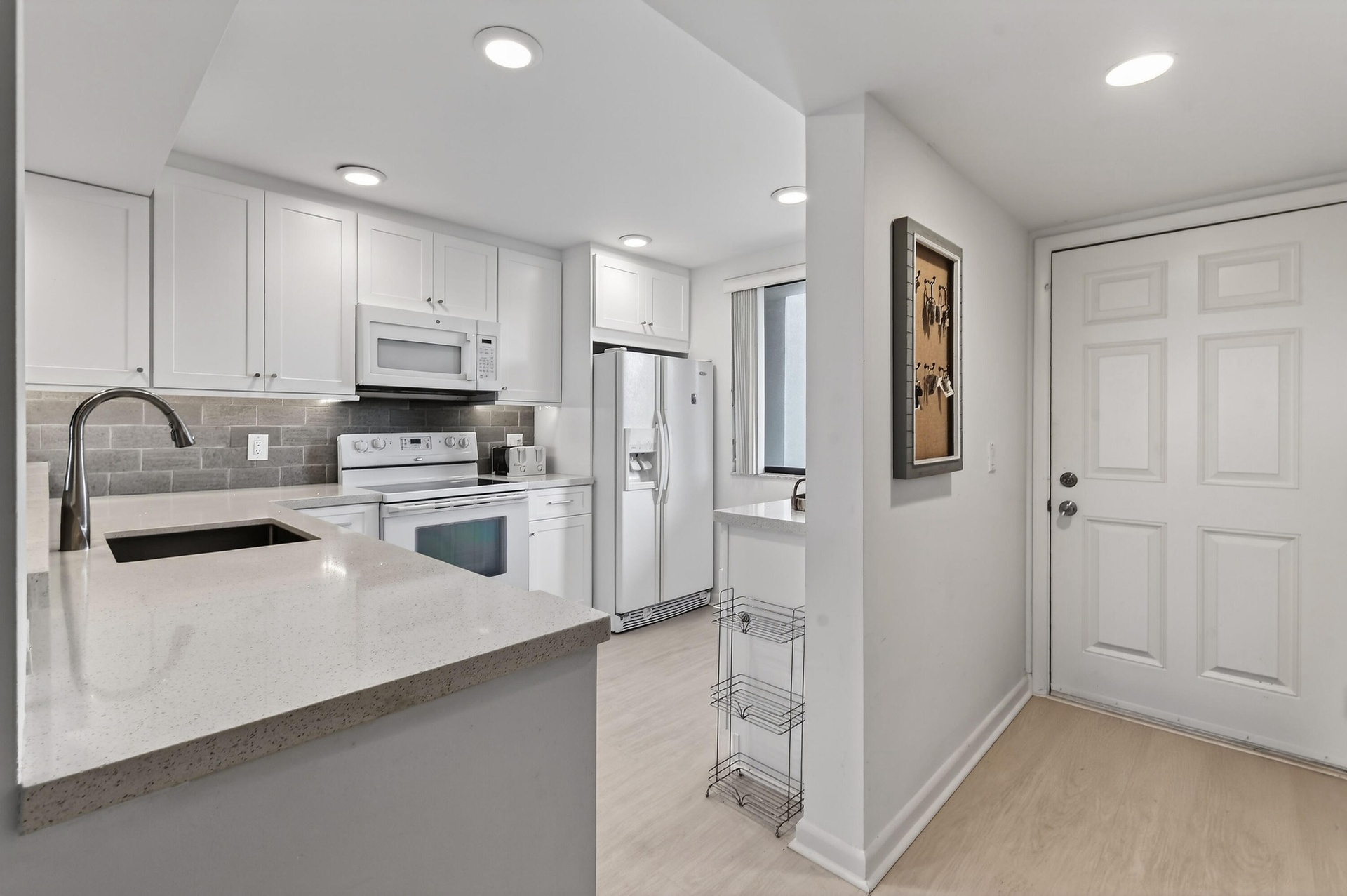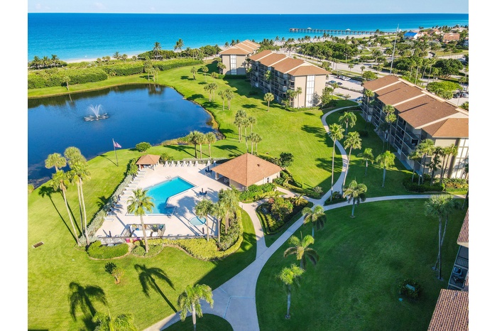 Welcome to your perfect beach escape in The Bluffs South, the closest unit to the community beach access! Just steps from the sand, this fully furnished condo offers a bright, coastal feel with expansive views of the lake and Atlantic Ocean. Inside, you'll enjoy a stylish open-concept layout with a modern kitchen featuring white cabinetry, sleek countertops, and full-size appliances. The dining and living areas flow seamlessly to a spacious patio, where you can relax and take in tranquil water views. Comfortable furnishings, neutral tones, and large sliders bring the outdoors in, making every space feel inviting and airy. This rental offers 2 bedrooms and 2 baths, including a serene primary suite with floor-to-ceiling glass doors opening directly to lush greenery and the lake, plus a guest bedroom with twin beds or visitors. The unit also includes the convenience of in-unit laundry and ample storage throughout. At Ocean at the Bluffs, you'll enjoy a private, gated community with resort-style amenities including tennis courts, pickleball, a large heated pool, bike storage, elevators, and plenty of guest parking. Located in the heart of Jupiter, you'll have easy access to the Jupiter Inlet, PGA Boulevard, dining, shopping, and everything this charming beach town has to offer. Whether you're seeking a seasonal retreat or an extended beachside stay, this condo combines comfort, convenience, and coastal living - the perfect place to live like you're on vacation.