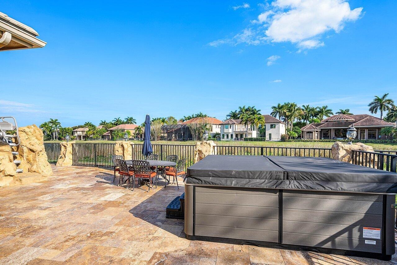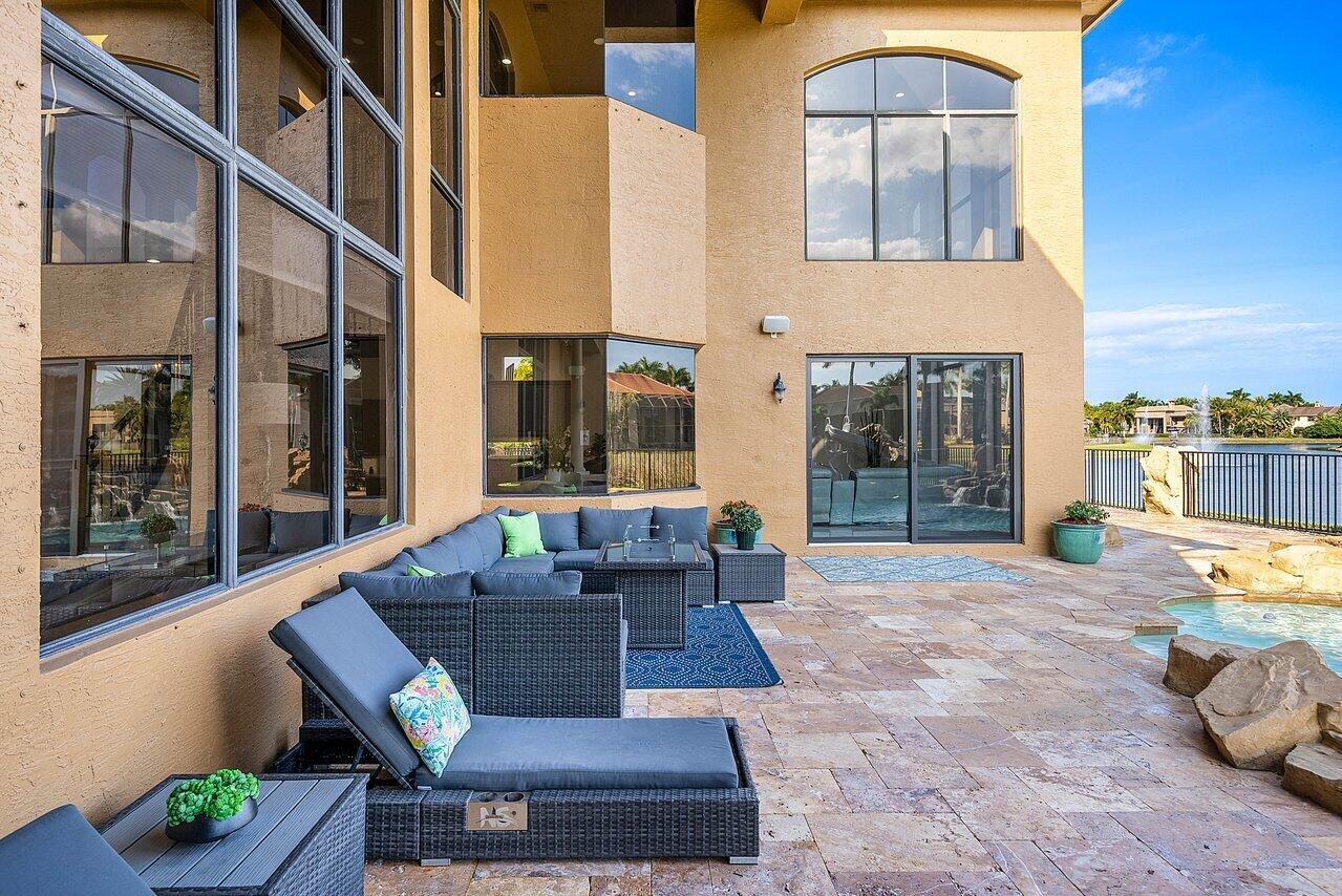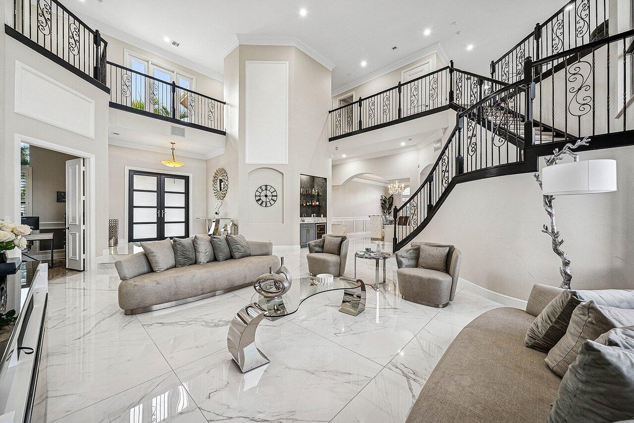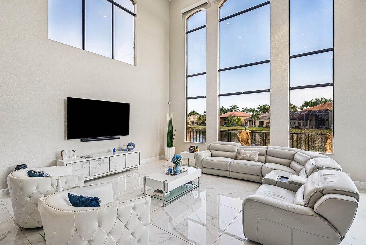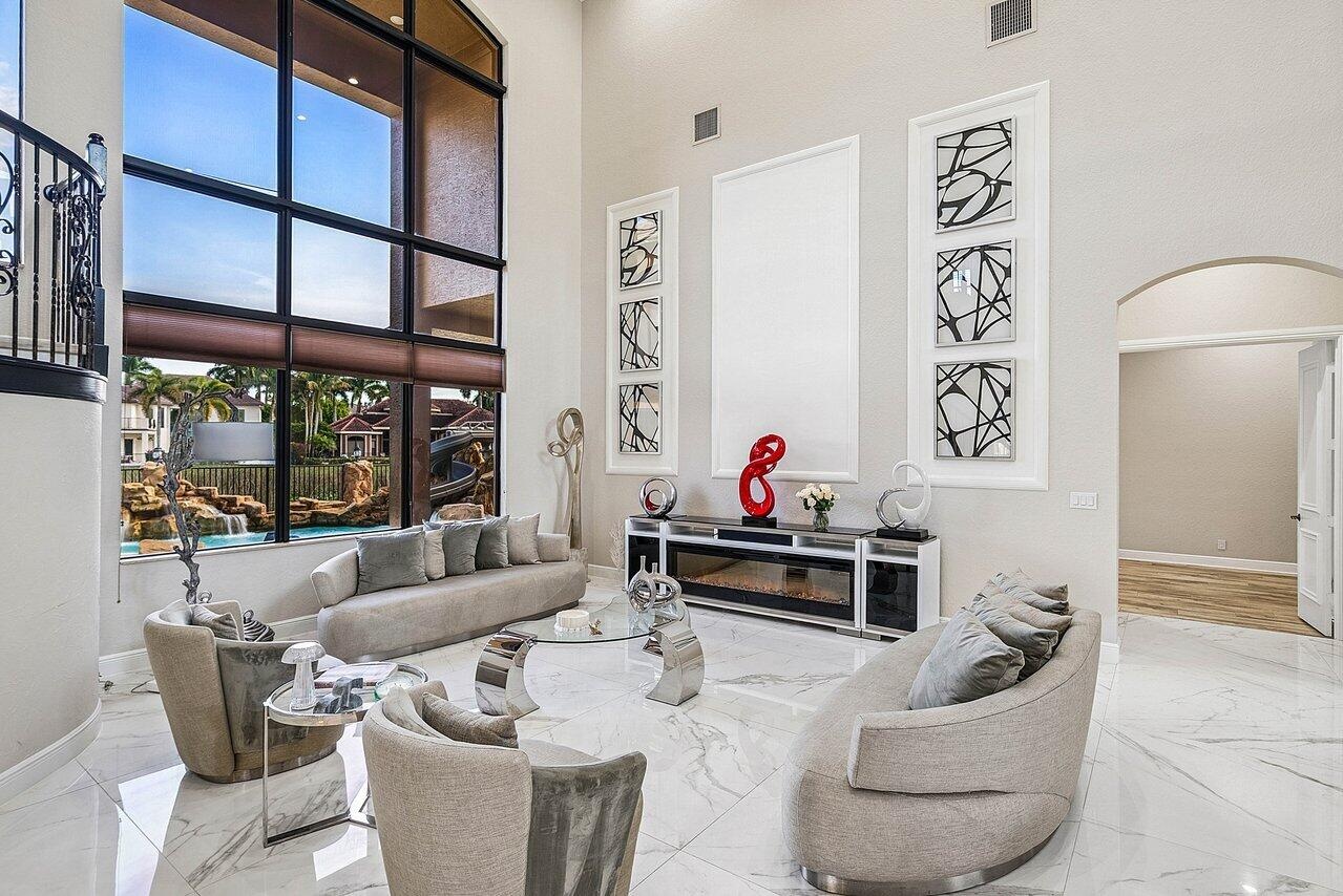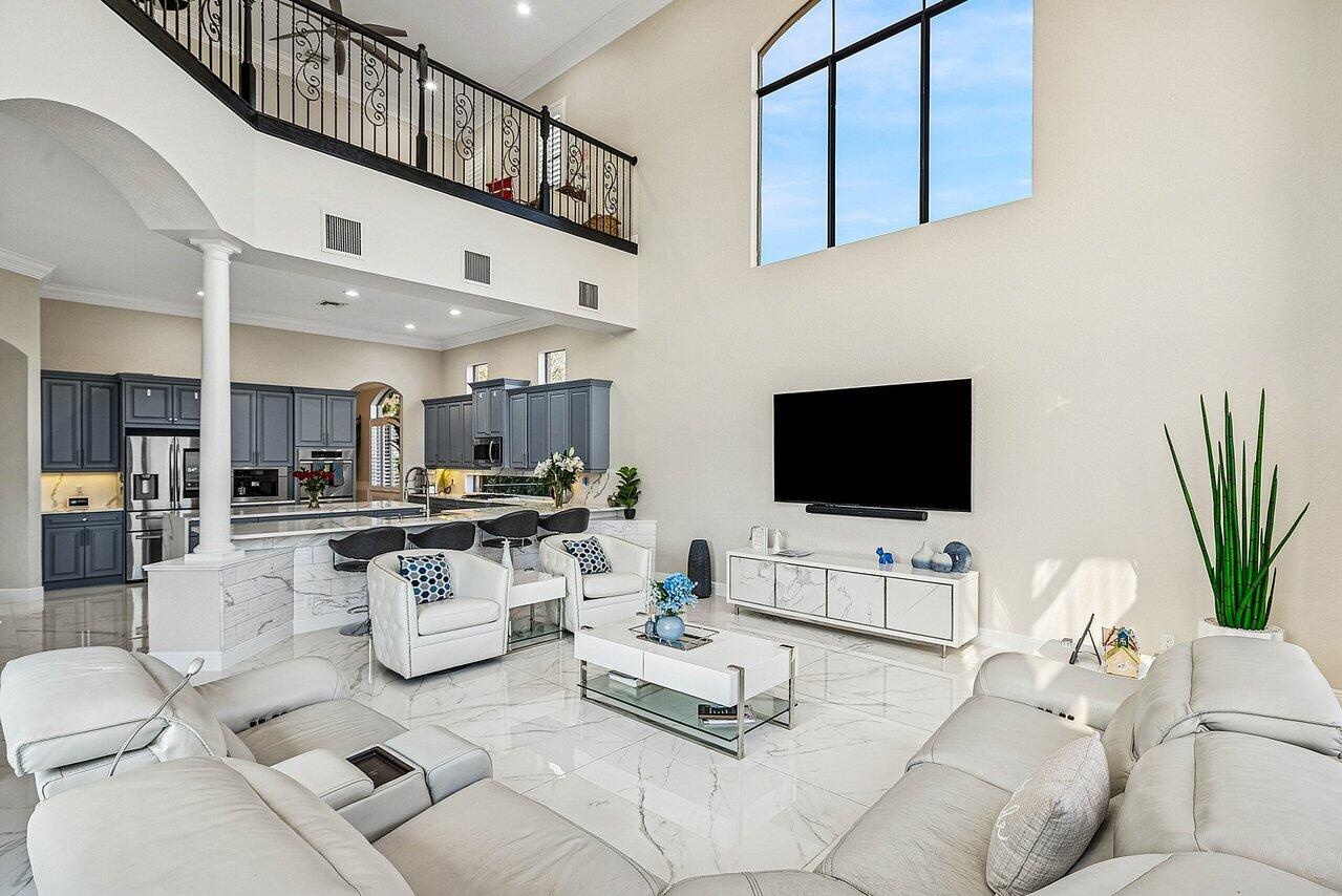 European elegance meets modern sophistication in this exquisitely updated Marseilles estate, ideally positioned on a quiet 17,000 sq ft cul-de-sac lot with sweeping lake views in Versailles. Soaring ceilings, dramatic windows, and polished Italian porcelain tile create a breathtaking first impression, with panoramic views of the resort-style pool and water beyond. Offering over 6,300 square feet, this thoughtfully designed home features 5 bedrooms, 6.5 baths, a private office, loft, media theater, and oversized 3-car garage. The stunning gourmet kitchen showcases waterfall quartz countertops, natural gas cooktop, double wall ovens, Miele built-in coffee system, custom cabinetry, apron sink, and walk-in pantry -- all flowing seamlessly into the expansive family room and casual dining area filled with natural light and tranquil lake views. A grand formal dining room with adjacent bar elevates the home's entertaining appeal. The first-floor primary suite is a private sanctuary with dual spa-inspired bathrooms, custom walk-in closets, a coffee bar, and serene sitting area with French doors overlooking the pool and preserve. A top of the line Michael Phelps therapeutic spa completes the resort experience. A guest suite, private office, and additional powder bath are also located on the main level. Upstairs offers three spacious bedrooms, three baths, an open loft, and a fully customized media theater room with acoustic walls, premium seating, and top-tier projection system for a true cinematic experience. The backyard is a private waterfront oasis featuring a saltwater pool with slide, new natural gas heater and pump, and a brand-new lakeside summer kitchen with grill, flat-top, refrigerator, beverage chiller, stone counters, sink, and two flat-screen TVs. An expansive travertine patio, outdoor sound system, LED lighting, and large fenced grassy area make this home ideal for entertaining or quiet evenings under the palms. Versailles residents enjoy 24-hour manned security, a renovated clubhouse, resort-style pool, fitness center, tennis and basketball courts, playground, and HOA-included lawn care, cable, and WiFi. Just minutes from Wellington's equestrian venues, International Polo Club, Whole Foods, Trader Joe's, fine dining, shopping, the Florida Turnpike, and PBI Airport. Meticulously updated and impeccably maintained -- this is luxury lakefront living at its finest.