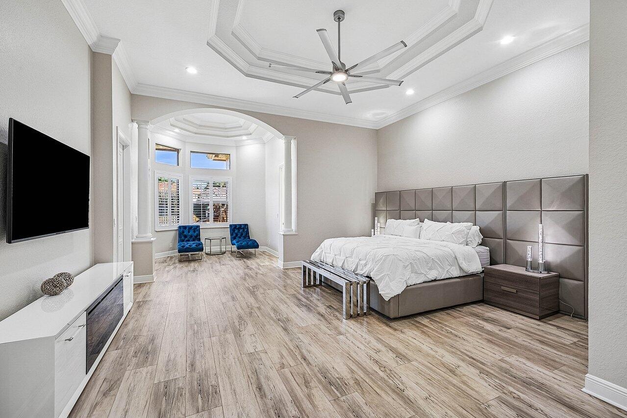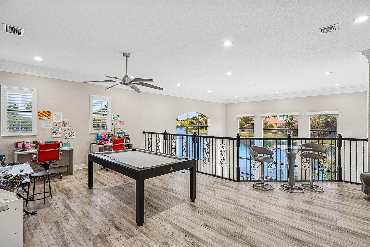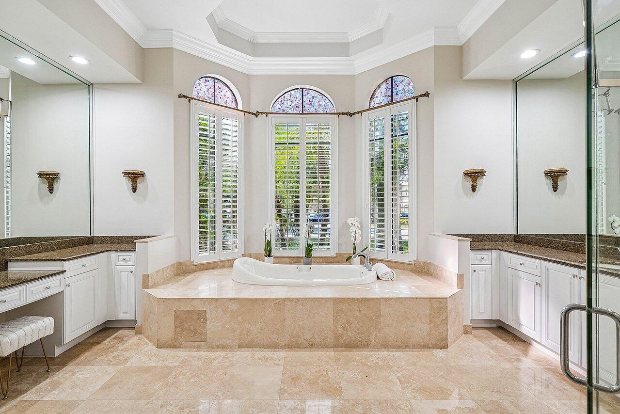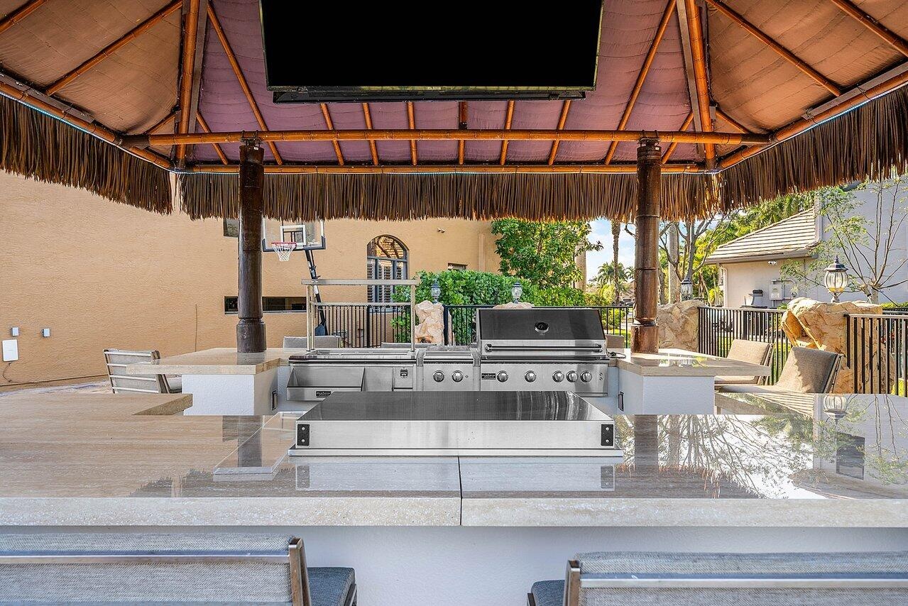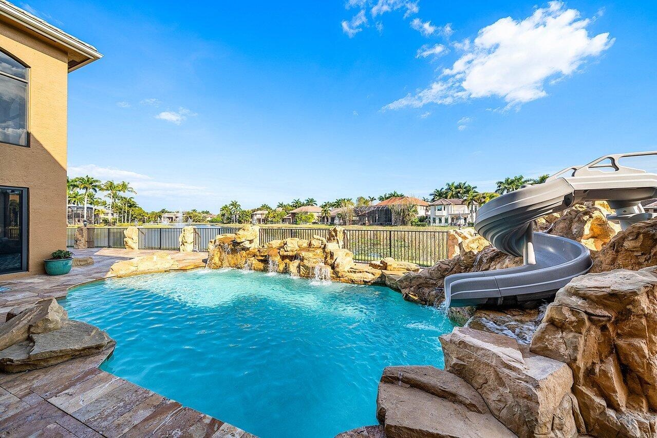 European elegance meets modern sophistication in this exquisitely updated Marseilles estate, ideally positioned on a quiet 17,000 sq ft cul-de-sac lot with sweeping lake views in Versailles. Soaring ceilings, dramatic windows, and polished Italian porcelain tile create a breathtaking first impression, with panoramic views of the resort-style pool and water beyond. Offering over 6,300 square feet, this thoughtfully designed home features 5 bedrooms, 6.5 baths, a private office, loft, media theater, and oversized 3-car garage. The stunning gourmet kitchen showcases waterfall quartz countertops, natural gas cooktop, double wall ovens, Miele built-in coffee system, custom cabinetry, apron sink, and walk-in pantry -- all flowing seamlessly into the expansive family room and casual dining area filled with natural light and tranquil lake views. A grand formal dining room with adjacent bar elevates the home's entertaining appeal. The first-floor primary suite is a private sanctuary with dual spa-inspired bathrooms, custom walk-in closets, a coffee bar, and serene sitting area with French doors overlooking the pool and preserve. A top of the line Michael Phelps therapeutic spa completes the resort experience. A guest suite, private office, and additional powder bath are also located on the main level. Upstairs offers three spacious bedrooms, three baths, an open loft, and a fully customized media theater room with acoustic walls, premium seating, and top-tier projection system for a true cinematic experience. The backyard is a private waterfront oasis featuring a saltwater pool with slide, new natural gas heater and pump, and a brand-new lakeside summer kitchen with grill, flat-top, refrigerator, beverage chiller, stone counters, sink, and two flat-screen TVs. An expansive travertine patio, outdoor sound system, LED lighting, and large fenced grassy area make this home ideal for entertaining or quiet evenings under the palms. Versailles residents enjoy 24-hour manned security, a renovated clubhouse, resort-style pool, fitness center, tennis and basketball courts, playground, and HOA-included lawn care, cable, and WiFi. Just minutes from Wellington's equestrian venues, International Polo Club, Whole Foods, Trader Joe's, fine dining, shopping, the Florida Turnpike, and PBI Airport. Meticulously updated and impeccably maintained -- this is luxury lakefront living at its finest.